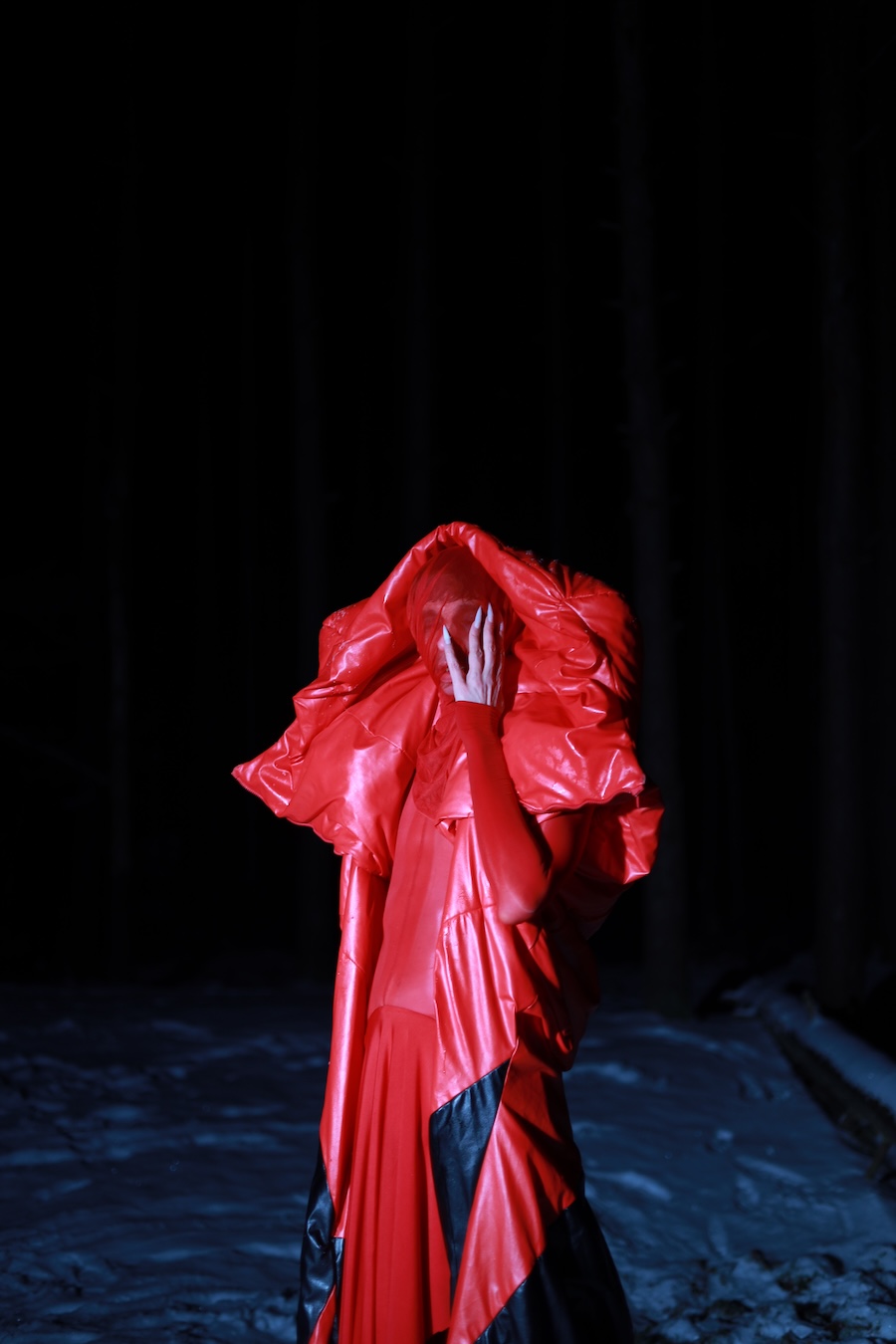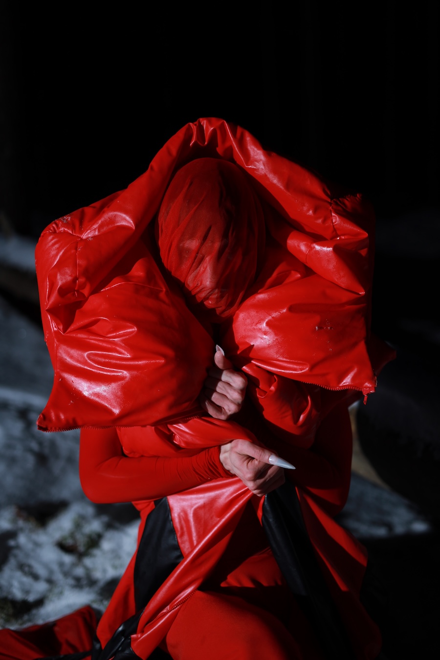 The vision is beautifully captured through the lens of Berlin-based photographer and filmmaker Jessica Taylor, who skillfully translates the raw energy of the live performance into a cinematic experience. Taylor’s artistry preserves not just the fleeting moments of performance but also the atmospheric essence of the environment, crafting a poignant dialogue between the evolving body, sculptural garments, and the snow-blanketed surroundings. Partnering with Polish Berlin-based photographer Diana Shuleshnyova, the team enhances the visual language of “Blood Flower Bloom,” offering still imagery that resonates with the visceral struggles between fabric, skin, and the surroundings.