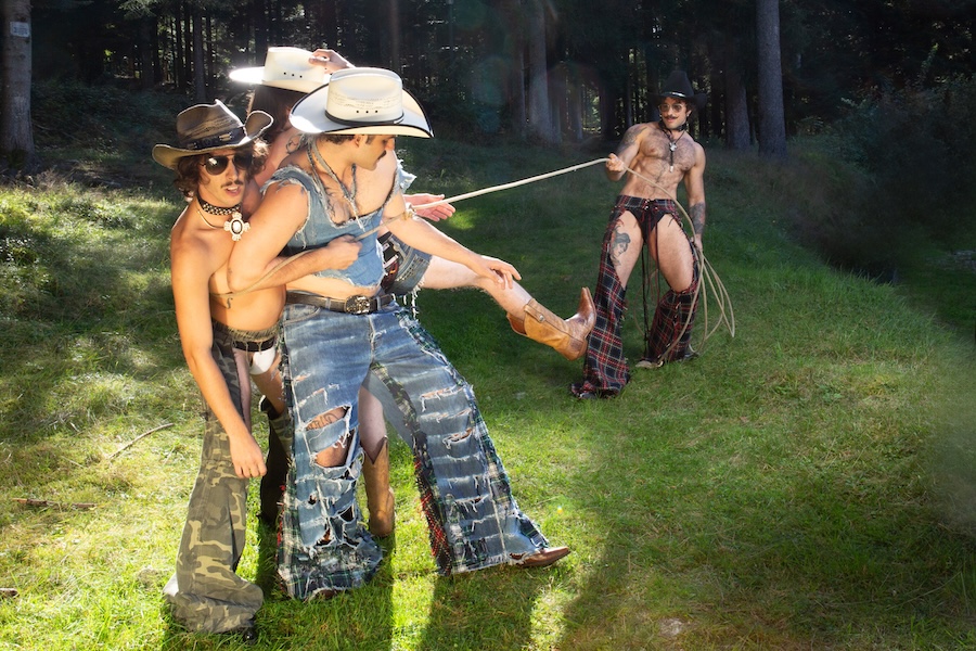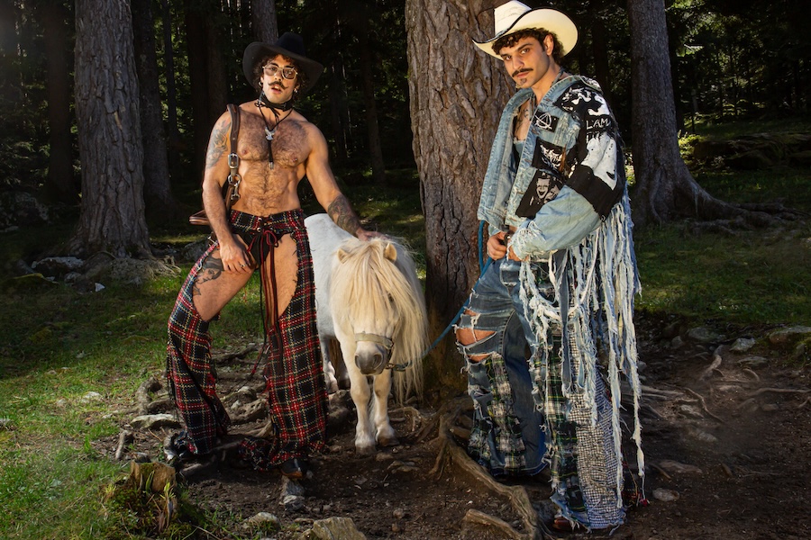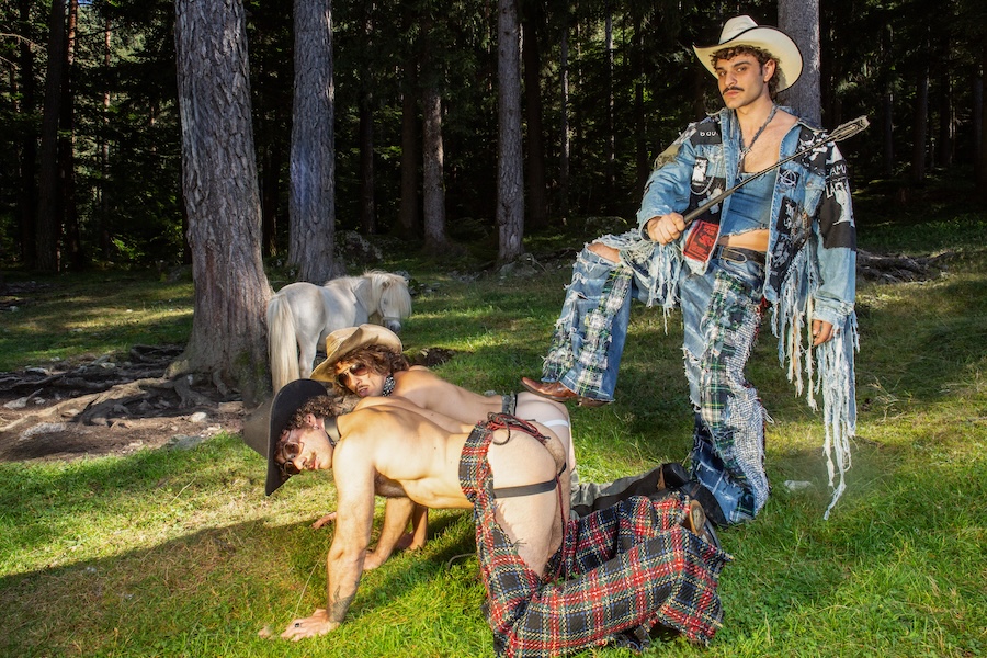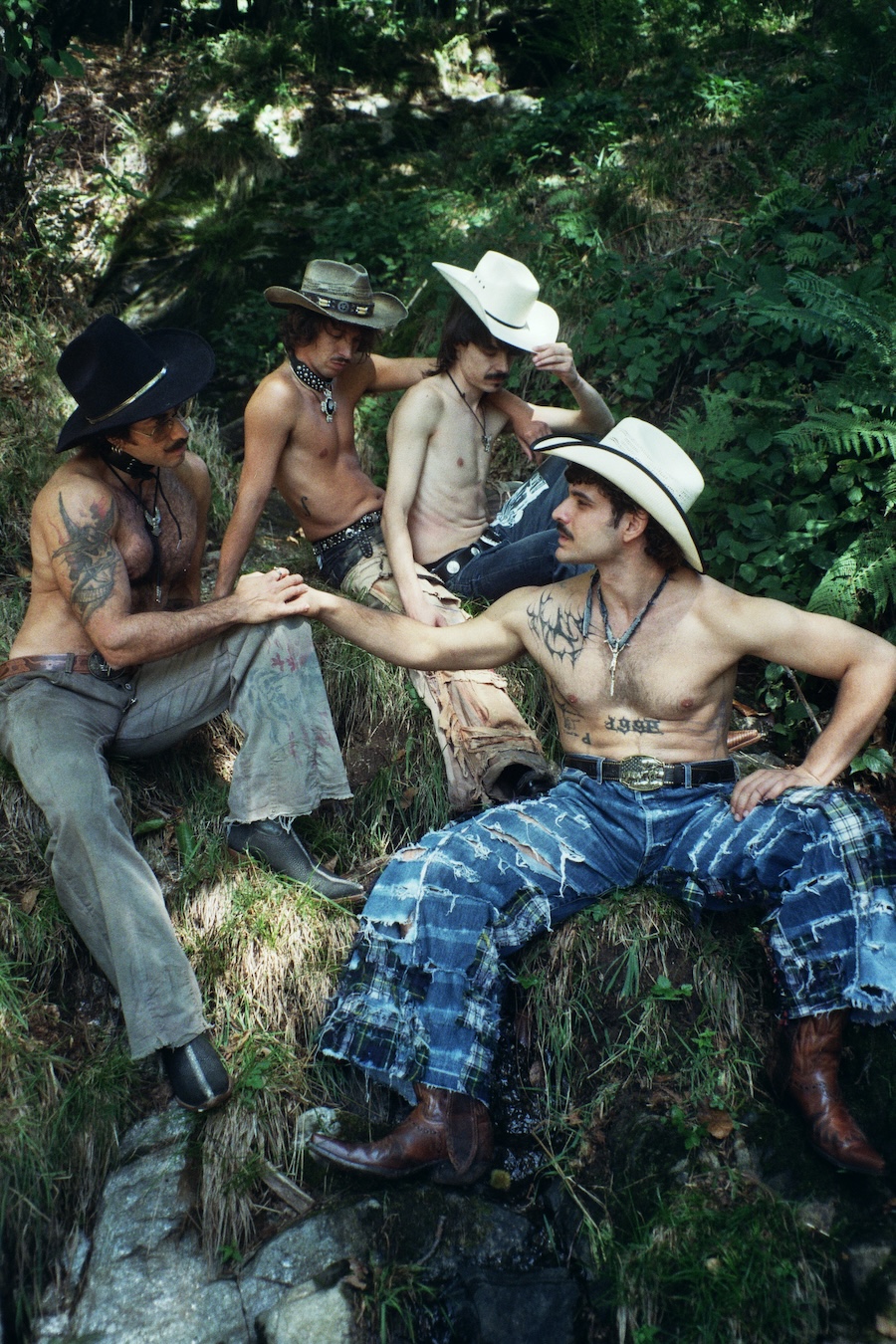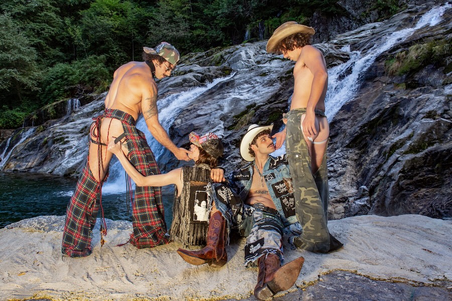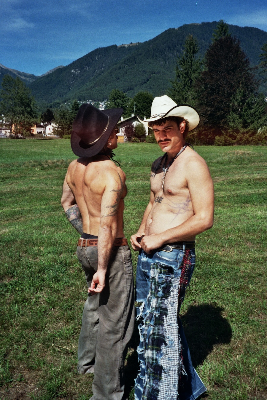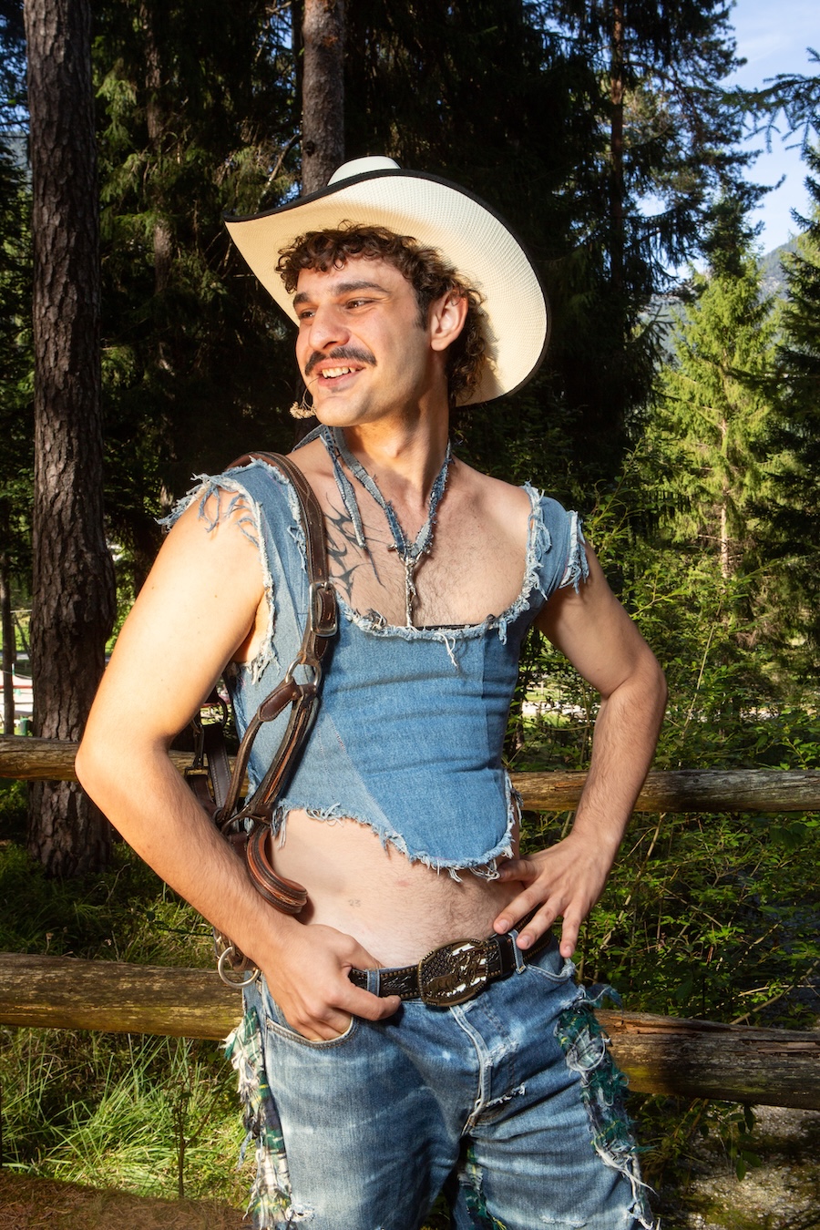 A KALTBLUT exclusive. The designer and creative director is Giu Zurlo. Styling by Dani Bordignon. Digital Photography by Erica Muller. Analogue Photography by Ela Clotilde. The models are Kilian Lenox, Davide Tade, Davide Gori and Alessandro Castiglioni. Fashion by GIU and other various vintage pieces. “This shoot is an ironic take on Brokeback Mountain, set not in Wyoming but in a small town called Toceno in Northern Italy with modern Italian hunks. This shoot was based on the aesthetics of crust punk and classic Western American style, which is I direct connection to the setting and cast. Portraying queer hinting scenes and being shot in a conservative small town, this shoot was a way for us to express our feelings on repression and feeling safe.”