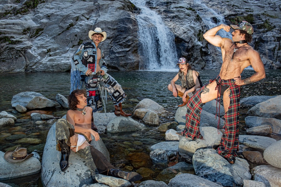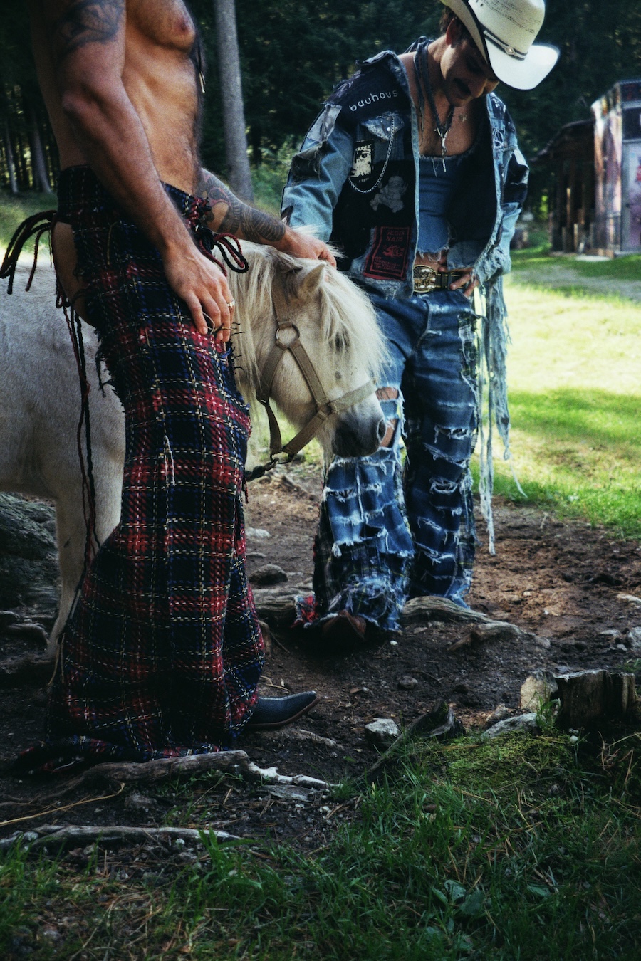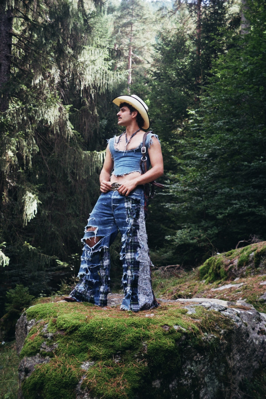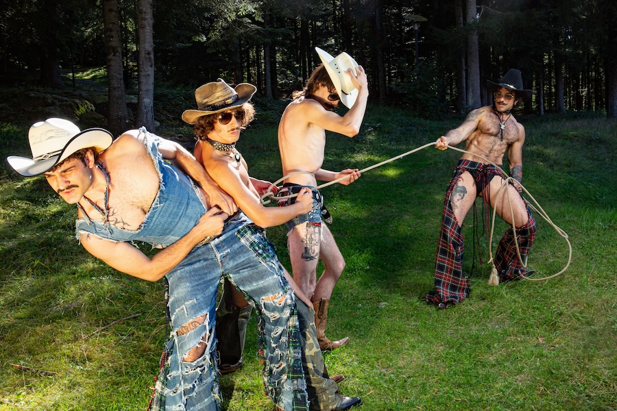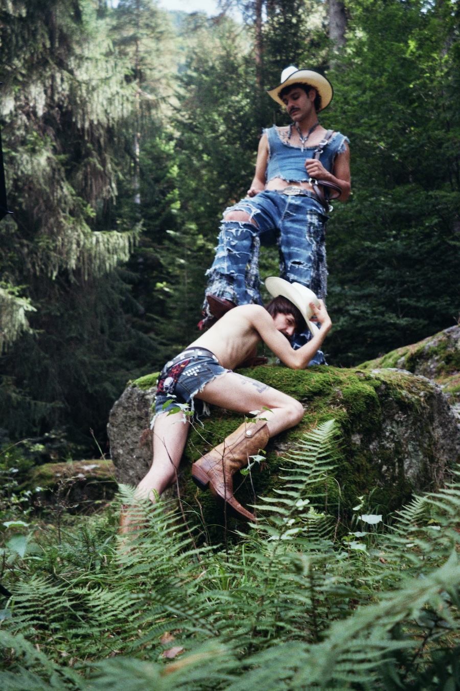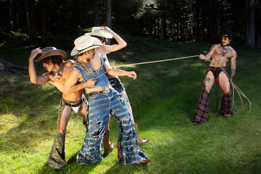 A KALTBLUT exclusive. The designer and creative director is Giu Zurlo. Styling by Dani Bordignon. Digital Photography by Erica Muller. Analogue Photography by Ela Clotilde. The models are Kilian Lenox, Davide Tade, Davide Gori and Alessandro Castiglioni. Fashion by GIU and other various vintage pieces. “This shoot is an ironic take on Brokeback Mountain, set not in Wyoming but in a small town called Toceno in Northern Italy with modern Italian hunks. This shoot was based on the aesthetics of crust punk and classic Western American style, which is I direct connection to the setting and cast. Portraying queer hinting scenes and being shot in a conservative small town, this shoot was a way for us to express our feelings on repression and feeling safe.”