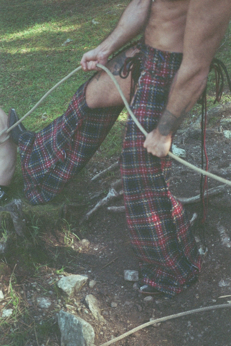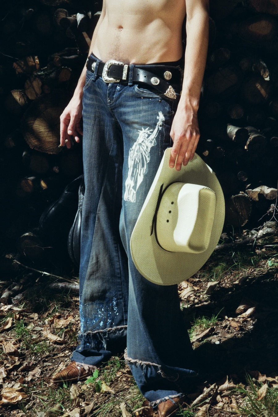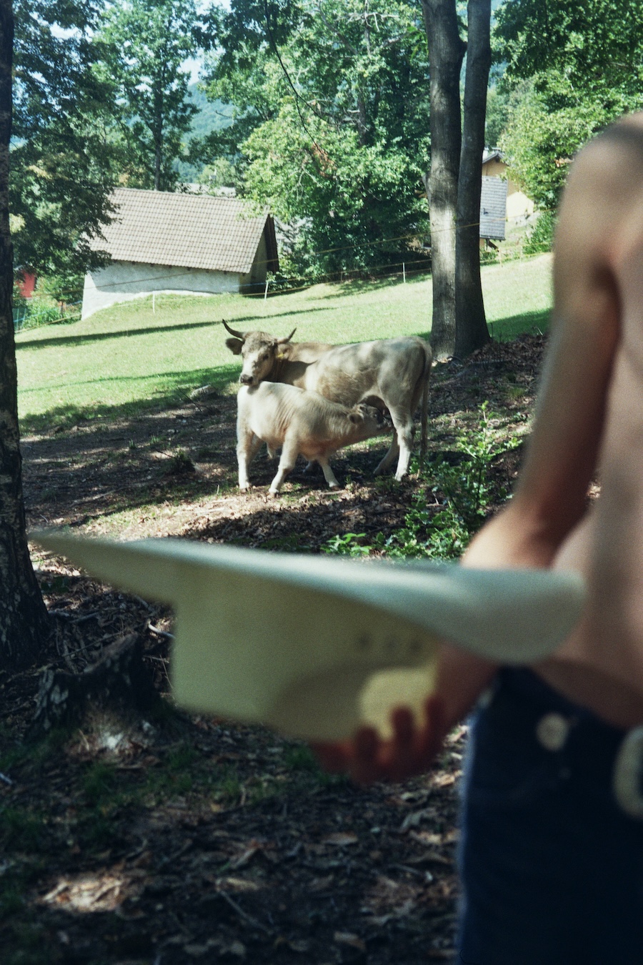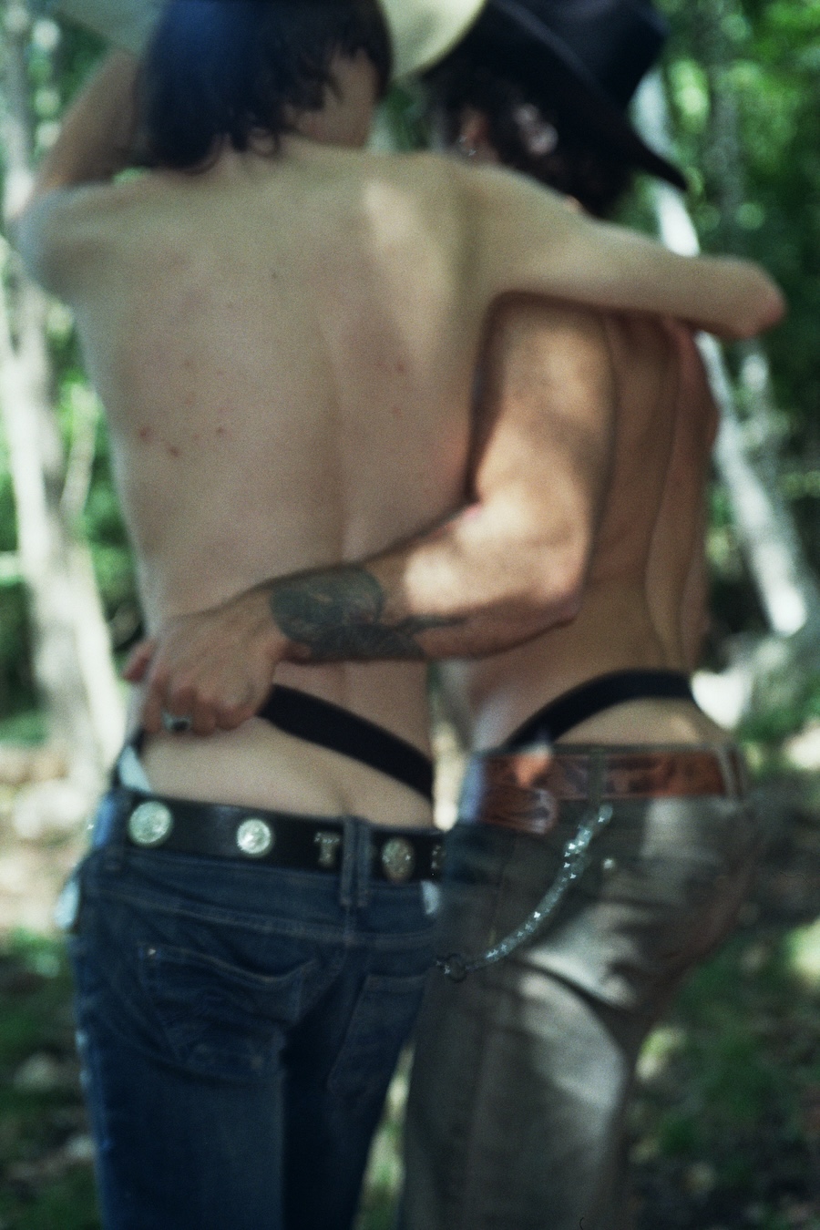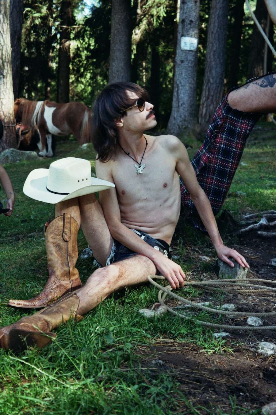 A KALTBLUT exclusive. The designer and creative director is Giu Zurlo. Styling by Dani Bordignon. Digital Photography by Erica Muller. Analogue Photography by Ela Clotilde. The models are Kilian Lenox, Davide Tade, Davide Gori and Alessandro Castiglioni. Fashion by GIU and other various vintage pieces. “This shoot is an ironic take on Brokeback Mountain, set not in Wyoming but in a small town called Toceno in Northern Italy with modern Italian hunks. This shoot was based on the aesthetics of crust punk and classic Western American style, which is I direct connection to the setting and cast. Portraying queer hinting scenes and being shot in a conservative small town, this shoot was a way for us to express our feelings on repression and feeling safe.”