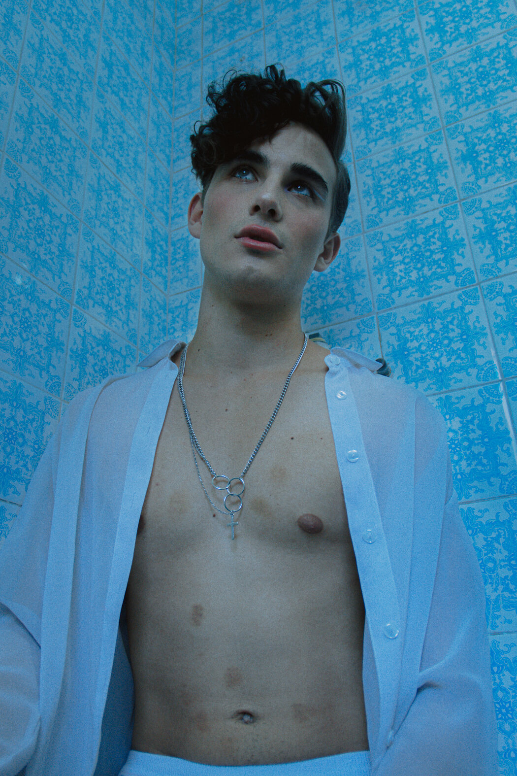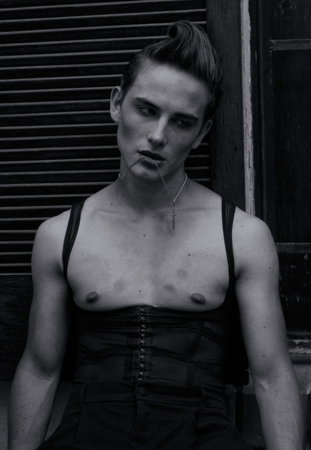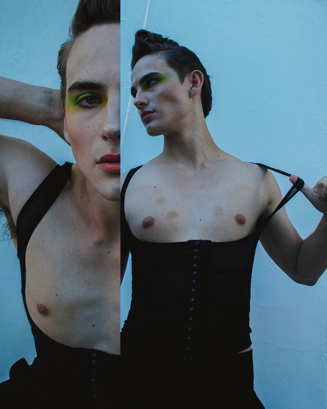 Photographer Alvaro Hurt captured male model Noah Dinamarca-Junge for an exclusive KALTBLUT editorial. Styling by Nadia Oyanedel. Makeup by Tannia Silva. Hair by Ariela Palma. Brands used are Vintage Burberry black pants, H&M white shirt and Vintage lingerie.