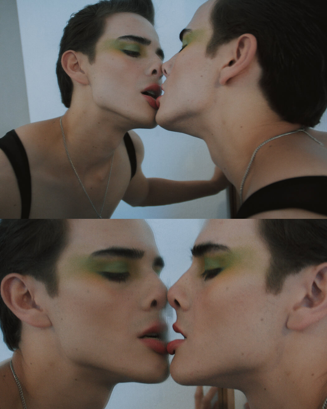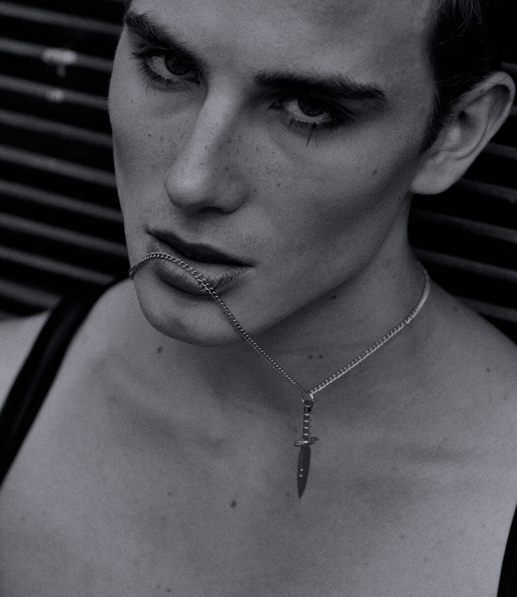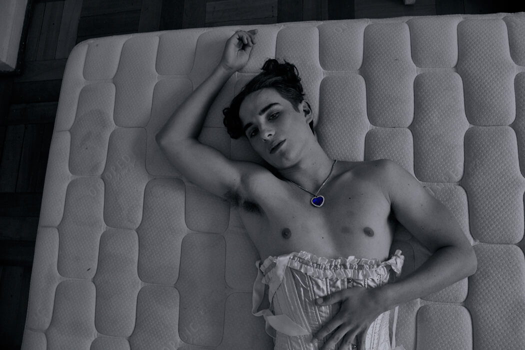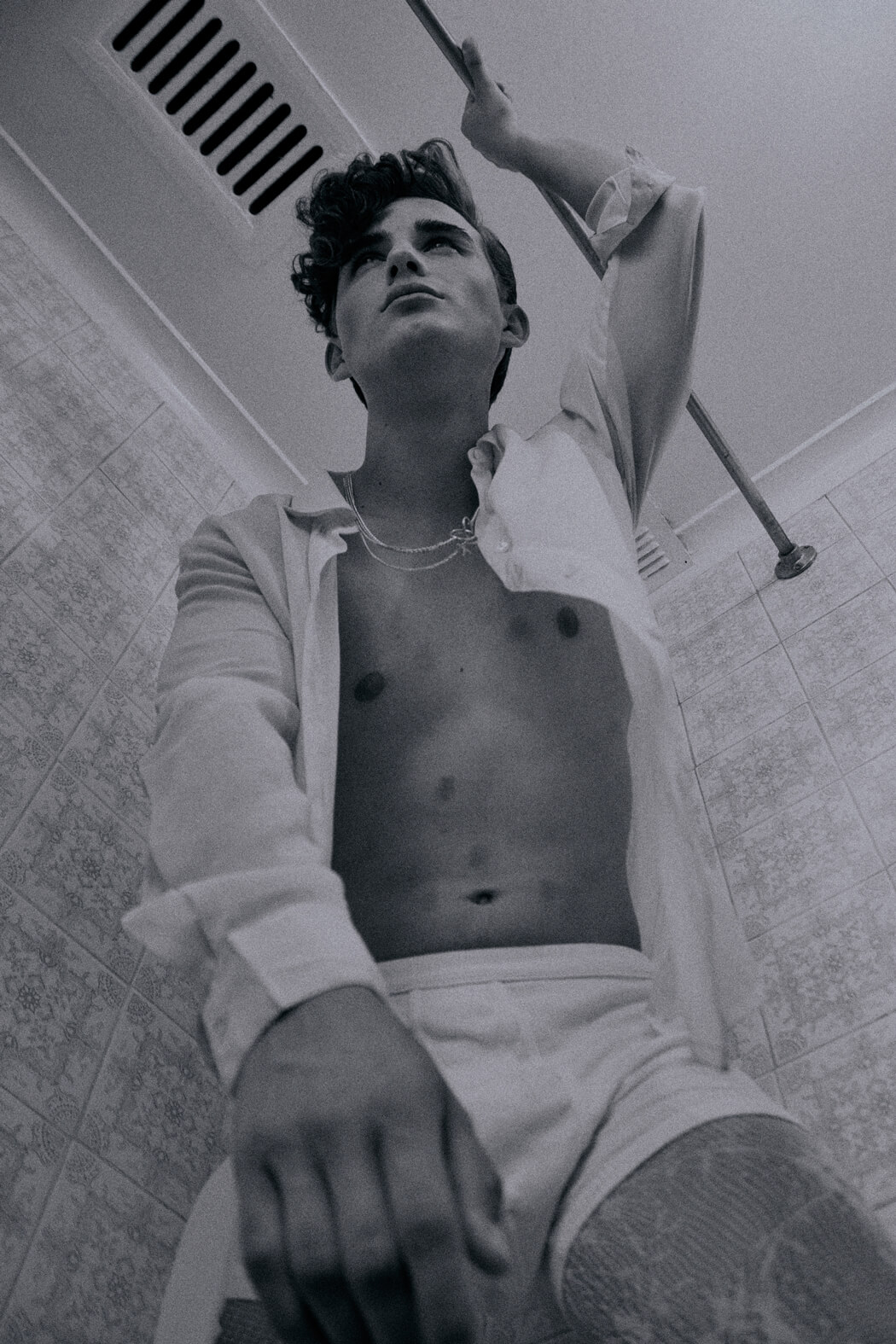Photographer Alvaro Hurt captured male model Noah Dinamarca-Junge for an exclusive KALTBLUT editorial. Styling by Nadia Oyanedel. Makeup by Tannia Silva. Hair by Ariela Palma. Brands used are Vintage Burberry black pants, H&M white shirt and Vintage lingerie.