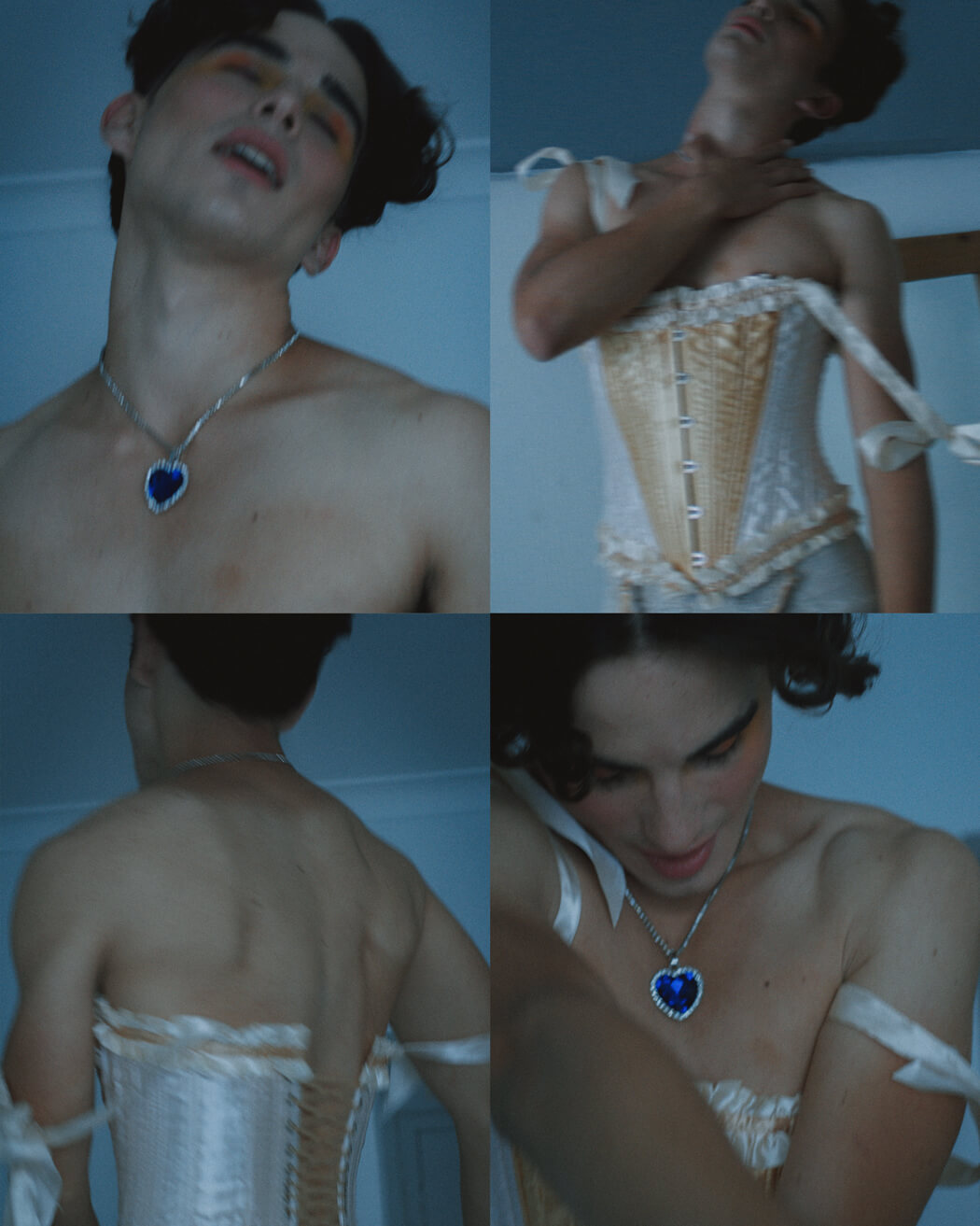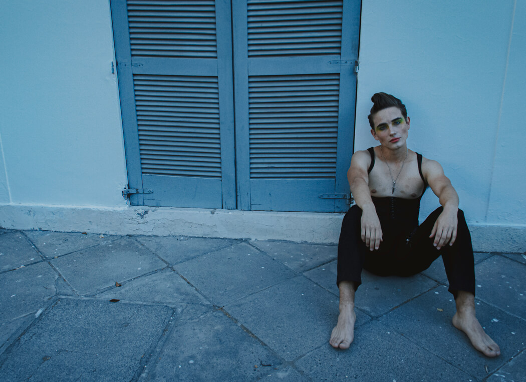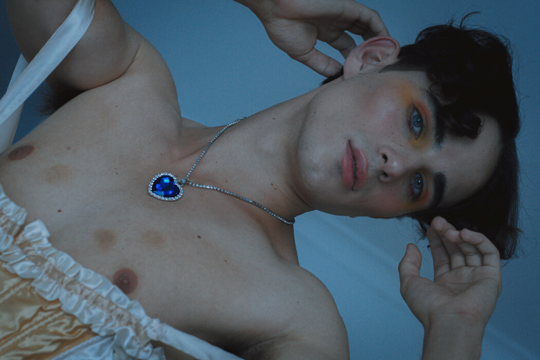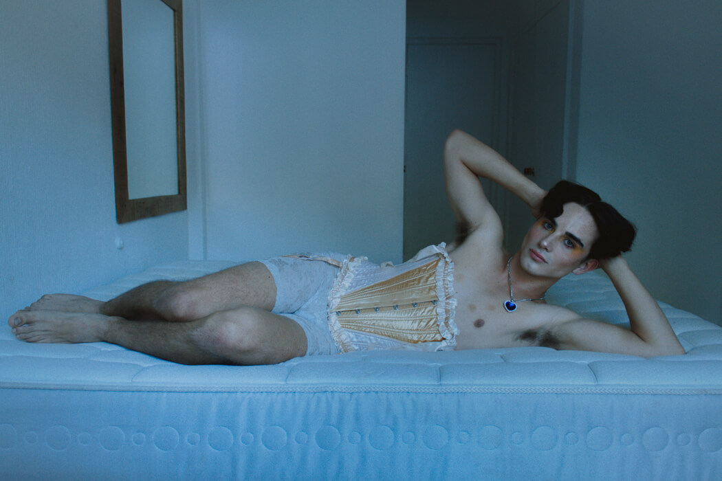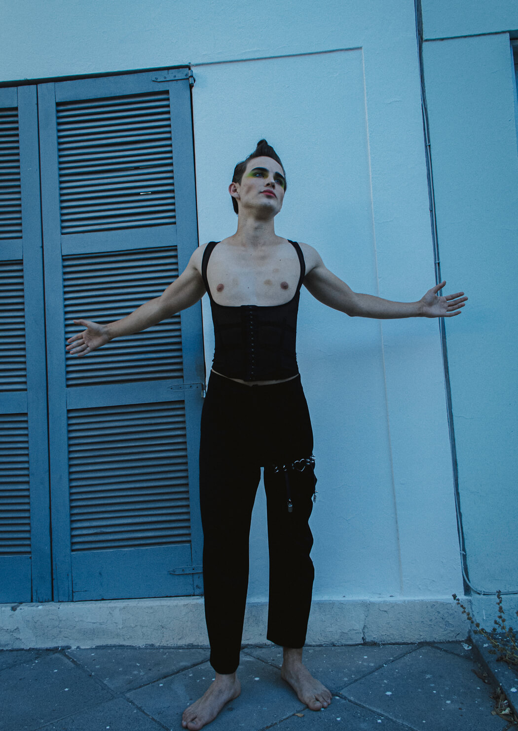 Photographer Alvaro Hurt captured male model Noah Dinamarca-Junge for an exclusive KALTBLUT editorial. Styling by Nadia Oyanedel. Makeup by Tannia Silva. Hair by Ariela Palma. Brands used are Vintage Burberry black pants, H&M white shirt and Vintage lingerie.