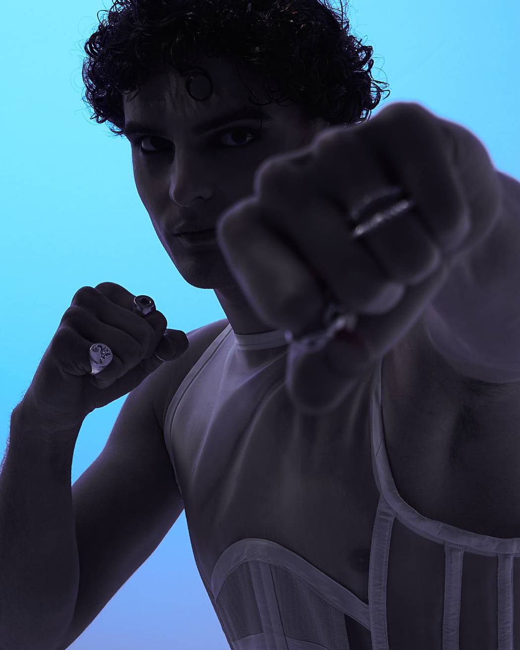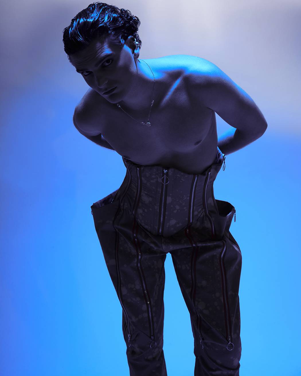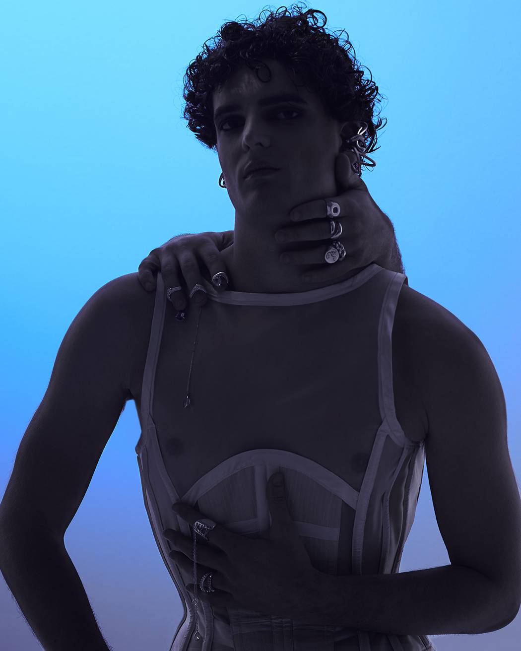 A KALTBLUT exclusive. The model is Lapo Cioppi. Andrea Reina a Fashion Photographer based in Florence. With his team, he created this very visual editorial. Strong and bold blue tones embracing the feeling of melancholy for the past, a near past, where everything was easier, we realize now. Corsets and silver guide the story, where the taste of the past, both female and masculine merge together. Fashion by Alan Crocetti, Lorenzo Seghezzi.