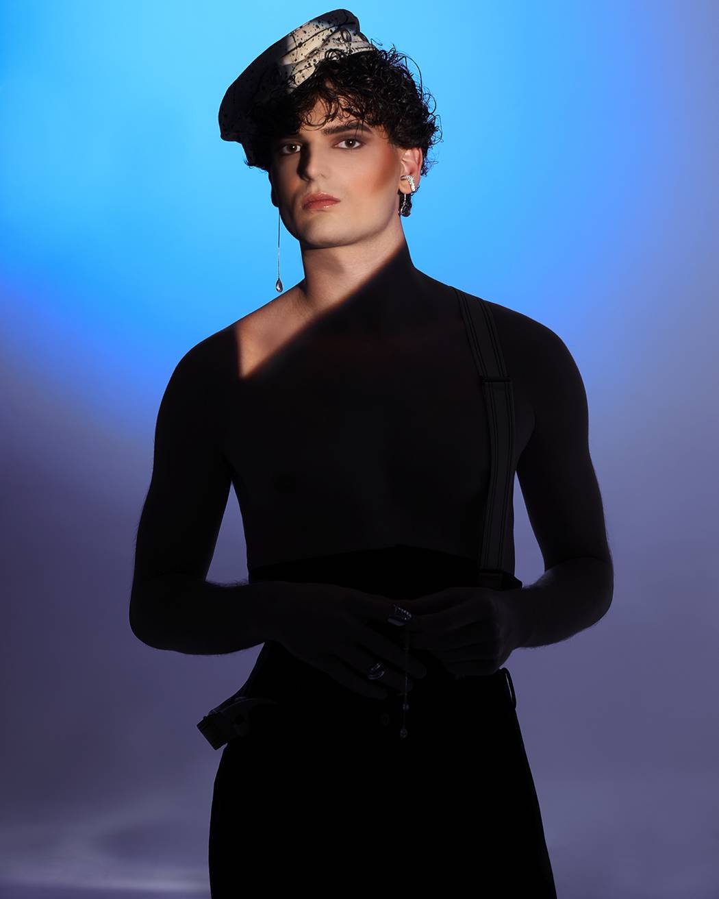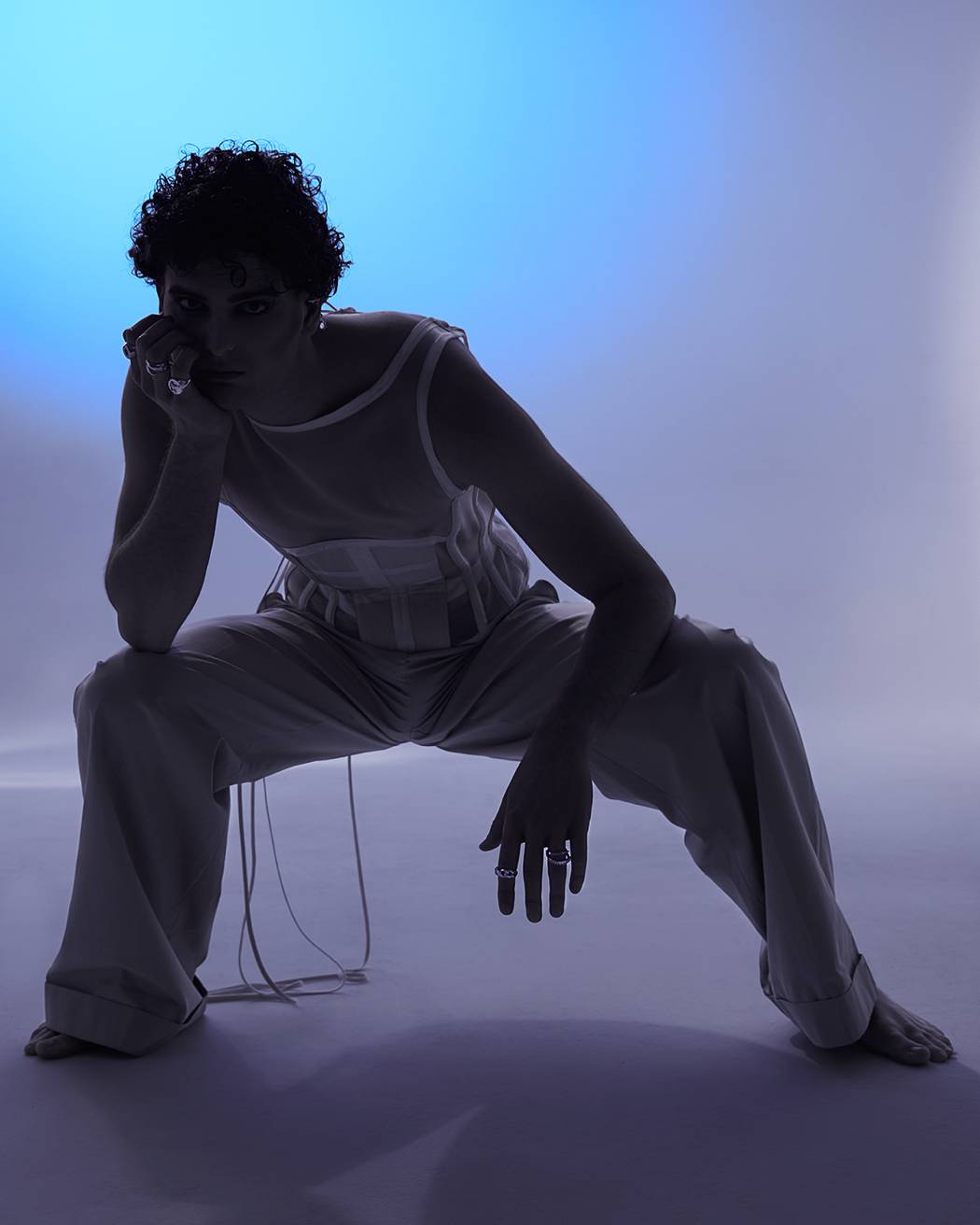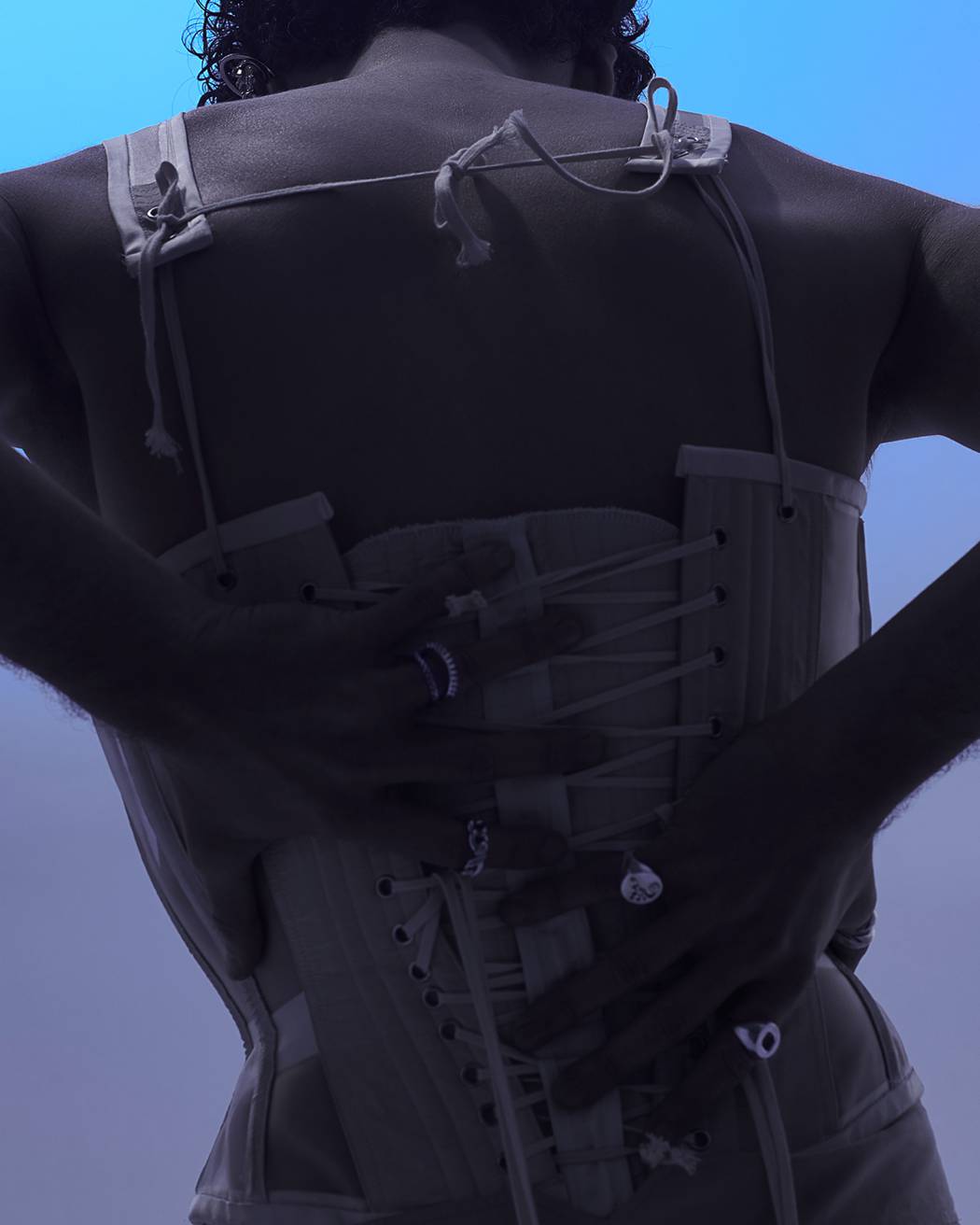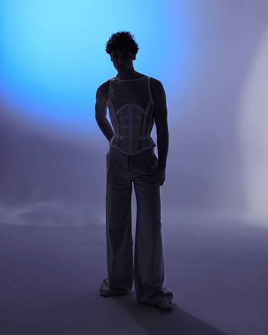 A KALTBLUT exclusive. The model is Lapo Cioppi. Andrea Reina a Fashion Photographer based in Florence. With his team, he created this very visual editorial. Strong and bold blue tones embracing the feeling of melancholy for the past, a near past, where everything was easier, we realize now. Corsets and silver guide the story, where the taste of the past, both female and masculine merge together. Fashion by Alan Crocetti, Lorenzo Seghezzi.