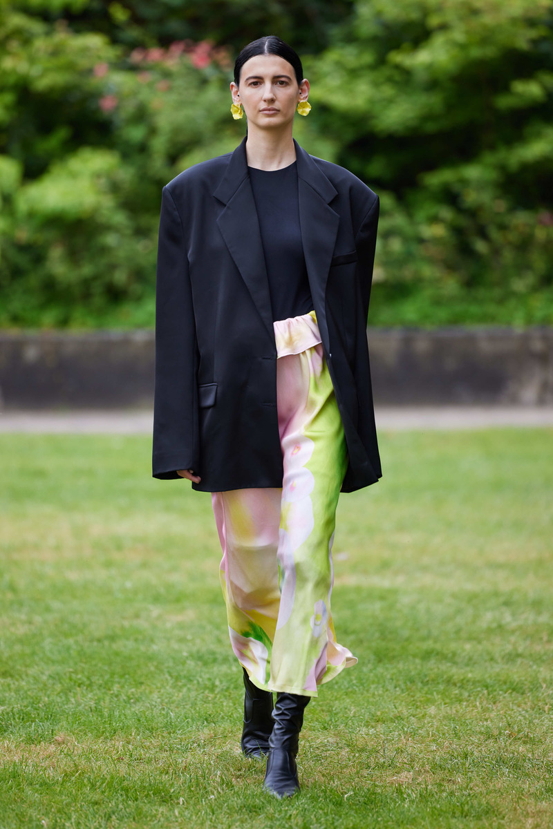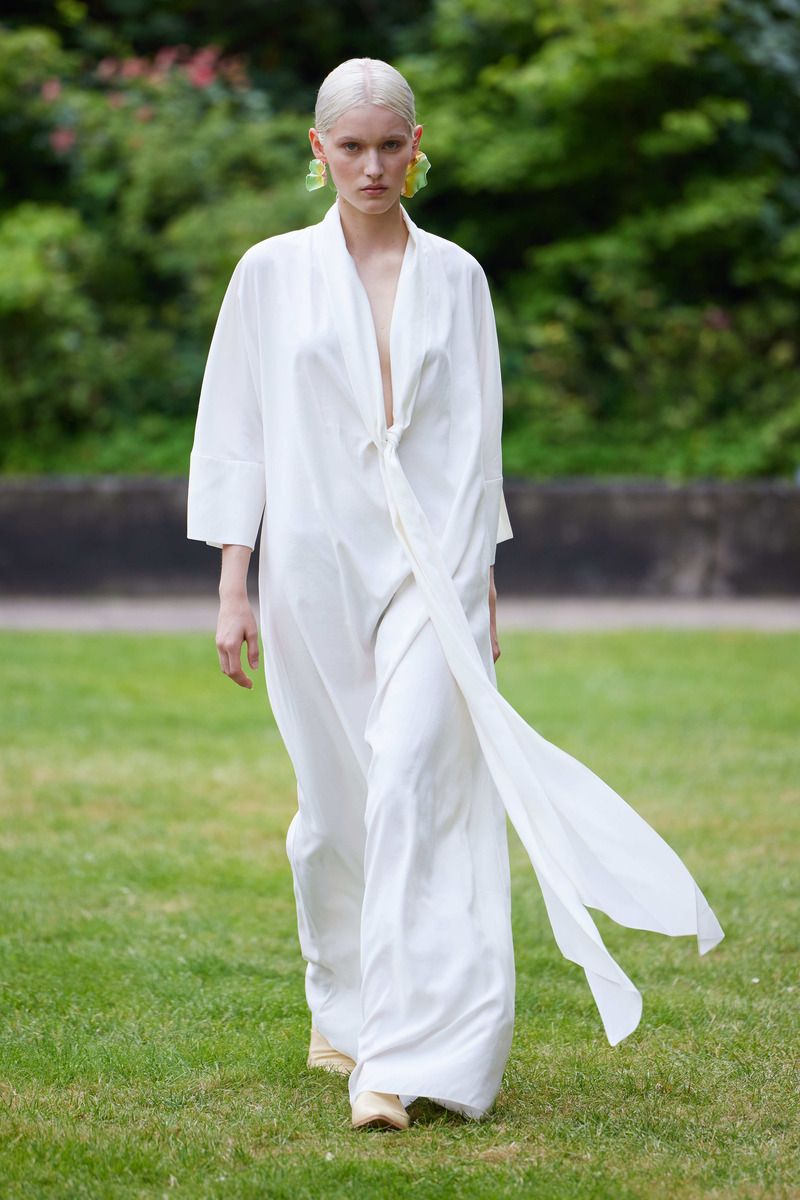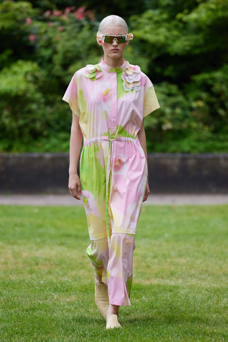 The collection finds its muse in the graceful form and hues of the mallow flower, an emblem woven into the tapestry of Ukrainian traditions symbolizing protection. This enchanting motif takes shape in the collection’s evocative print, masterfully crafted by Ukrainian artist Polina Moroz. Bobkova’s deft use of color brings forth a palette of vanilla, milky lime, dusted rose, blush, and greyish beige, mirroring the delicate tones of the flower, interwoven with bold and invigorating shades like lavish green and sunny yellow, reminiscent of Ukraine’s breathtaking landscapes.