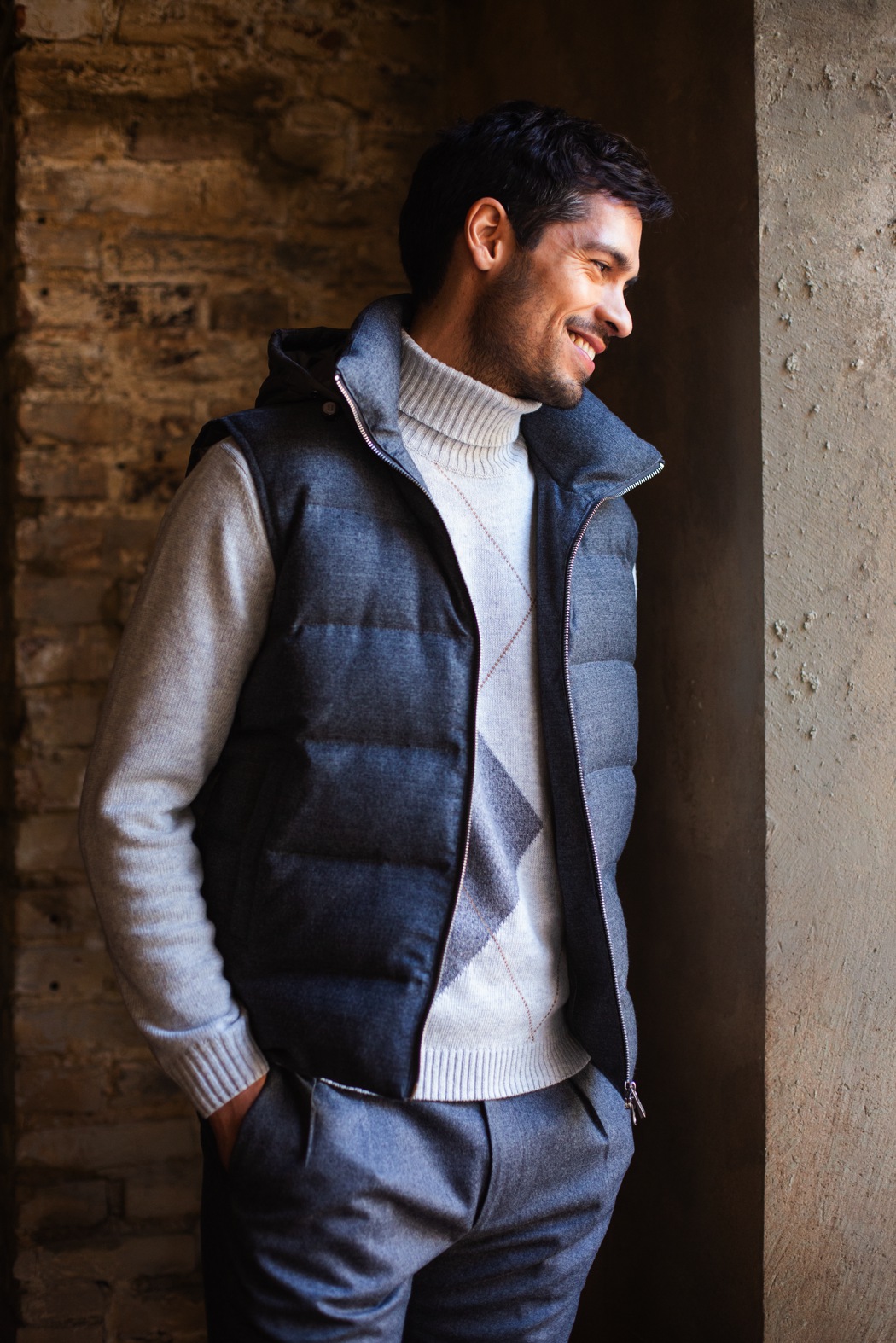 The range is completed by one of the new ideas for the season, to be worn exclusively under a jacket: the vest. In nylon and filled with goose down, it has suede trim – on the collar, armholes and at the waist – and comes in six colours: camel, army, navy blue, red, ochre and orange. After the success of last winter, the double-breasted knitwear vest also takes on new hues and ensures timeless elegance.