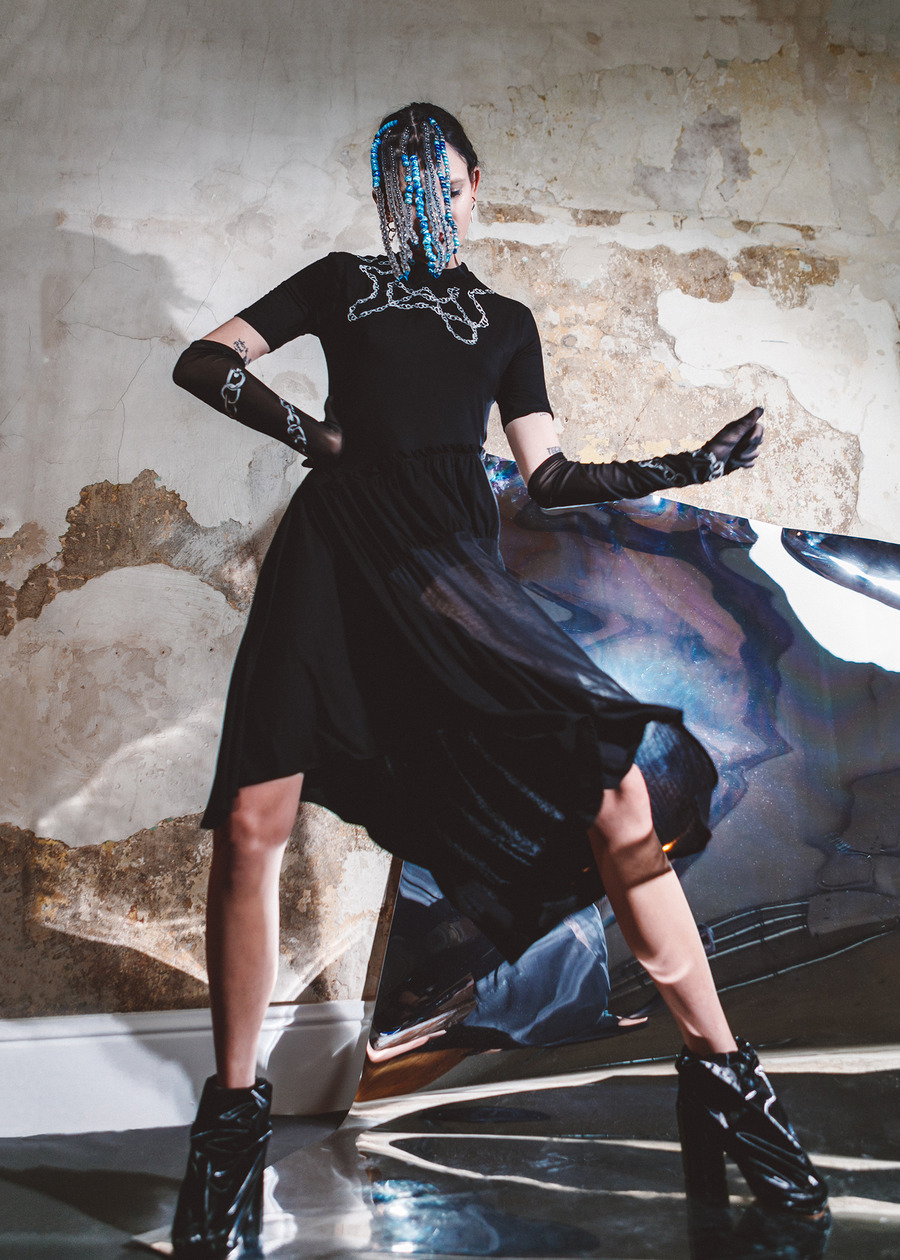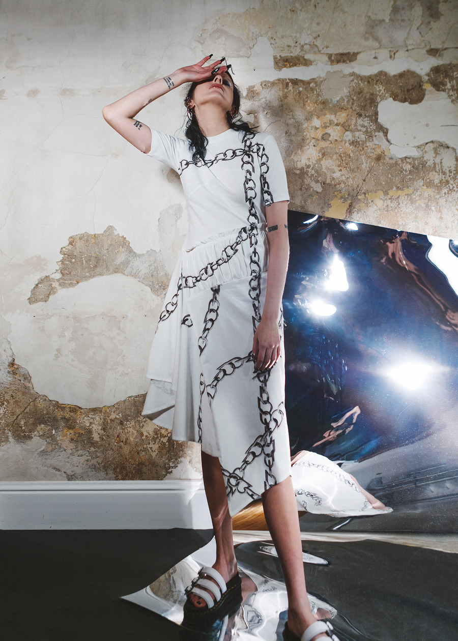 The chain once entwines the entire figure, other times it appears centrally, e.g. on a t-shirt, the new collection includes suits in a simple, minimalist shape, dresses with ruffles, transparent blouses, and classic bomber jackets.