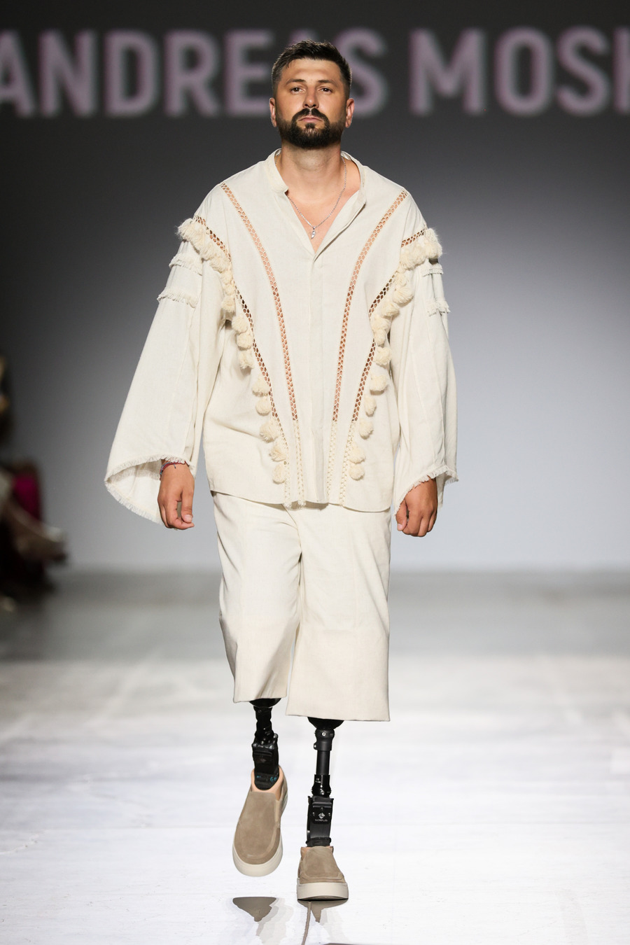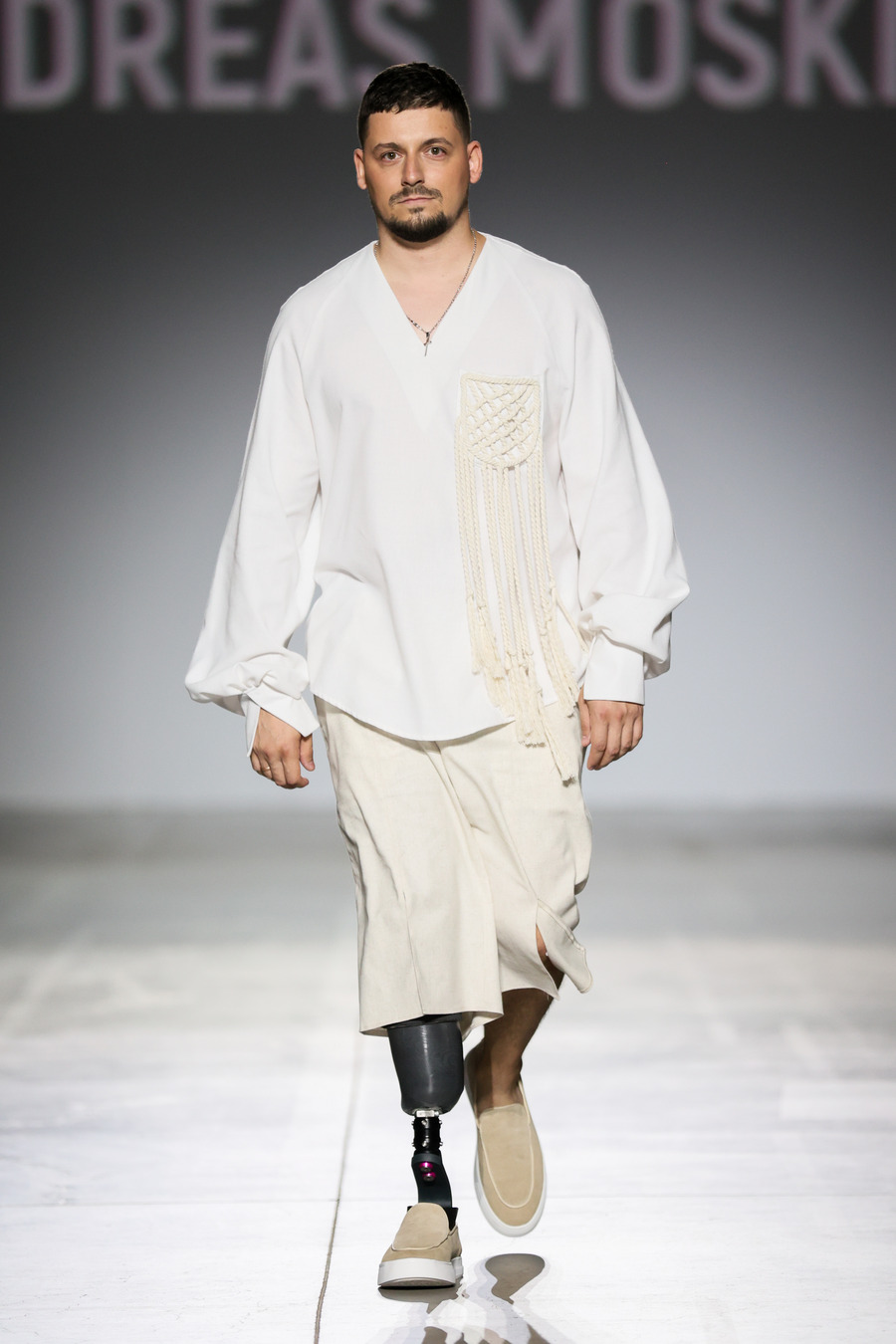 Ukrainian Fashion Week witnessed a seismic shift this year with a heart-wrenching and pioneering moment at the Andreas Moskin SS’25 show. Envision a runway where the elegance of bohemian chic intersects with the raw, resilient spirit of Ukrainian war veterans. Men and women who have lived through the harrowing experiences of war stepped onto the catwalk, some with prosthetic limbs, creating a deeply emotional tableau alongside professional models.