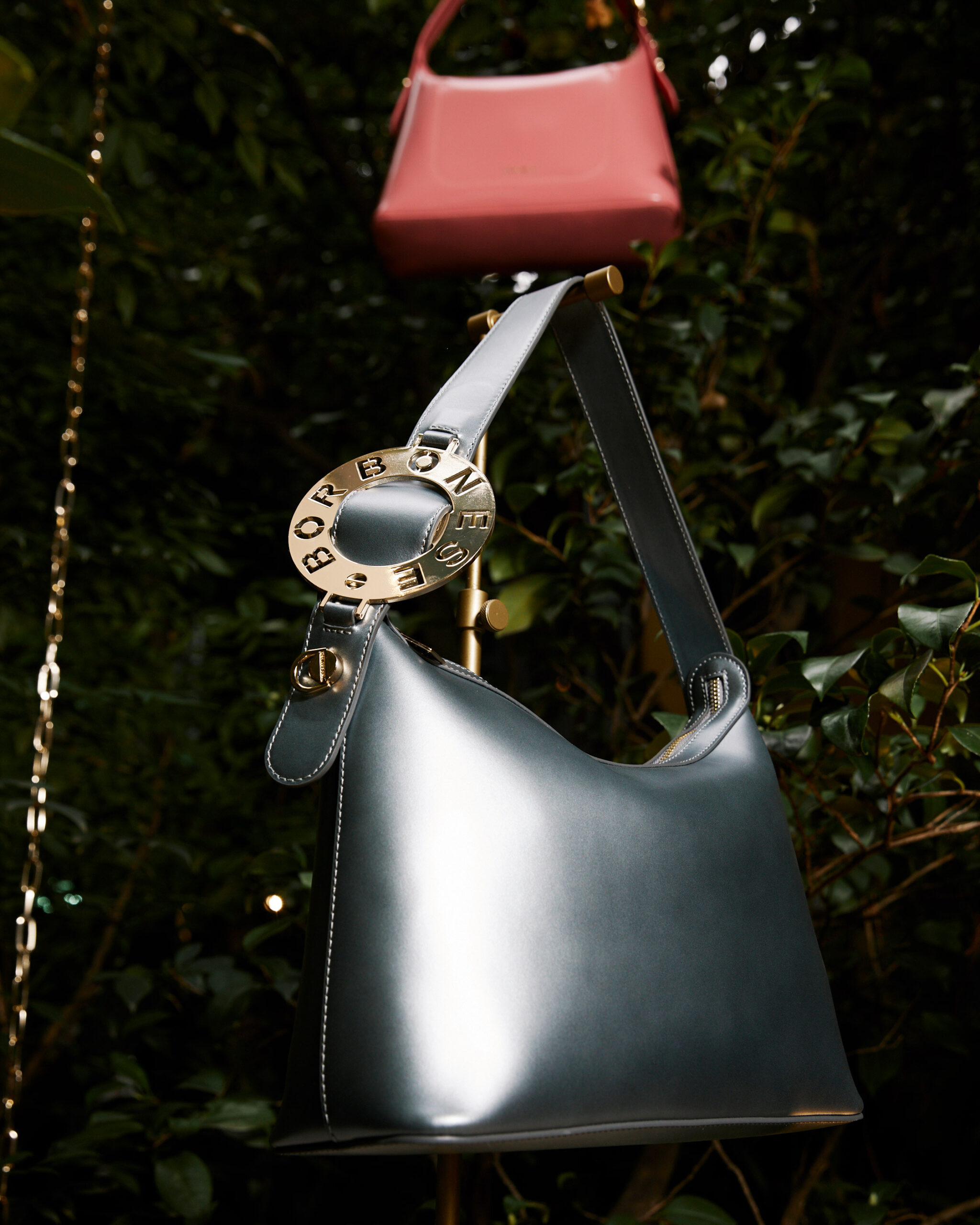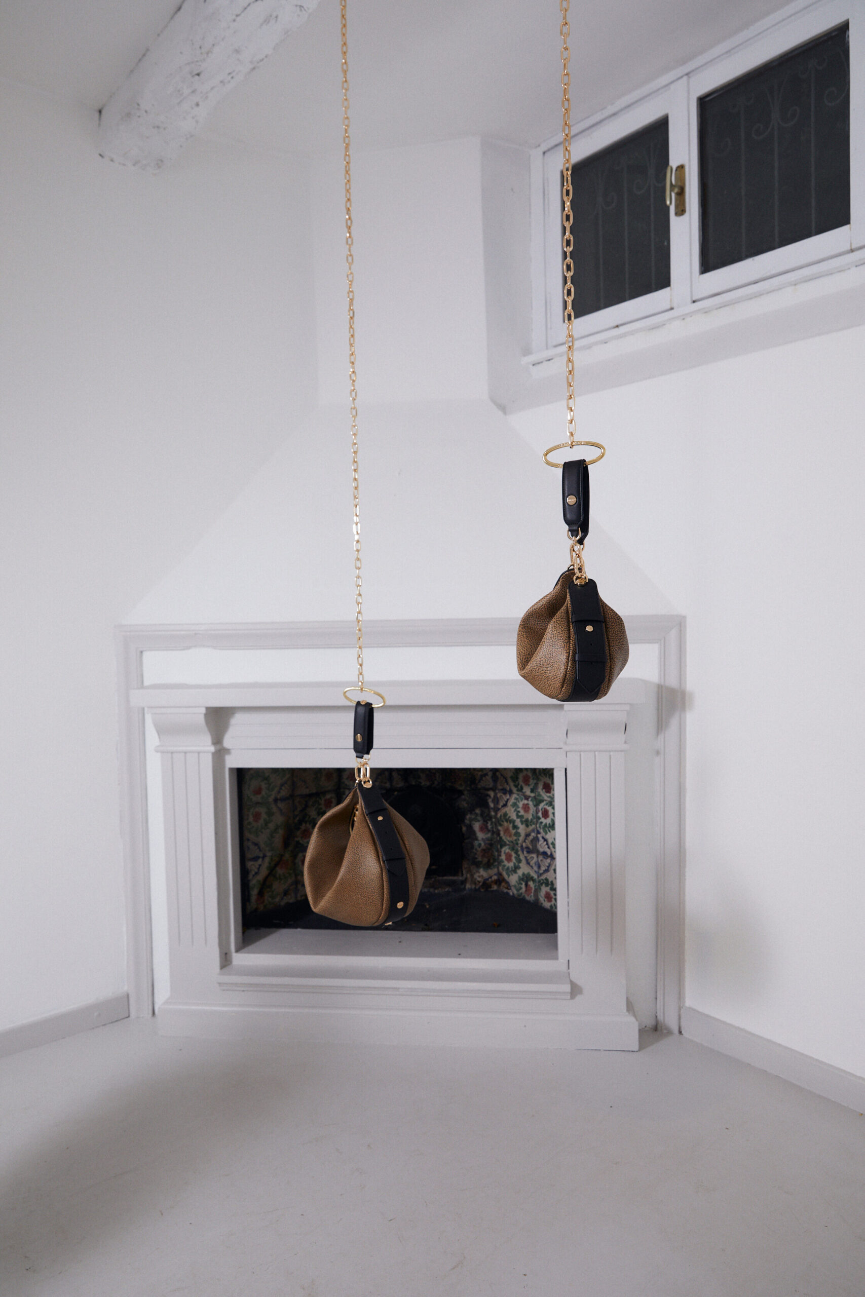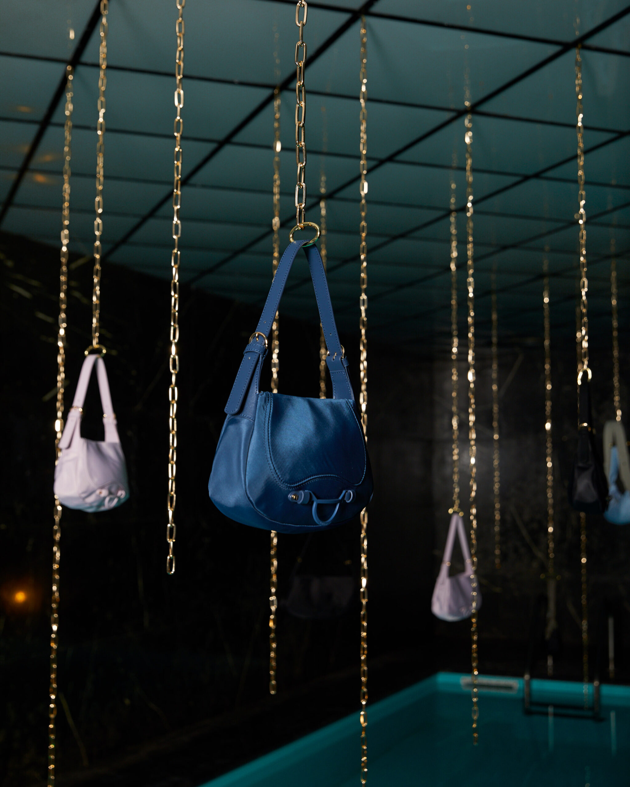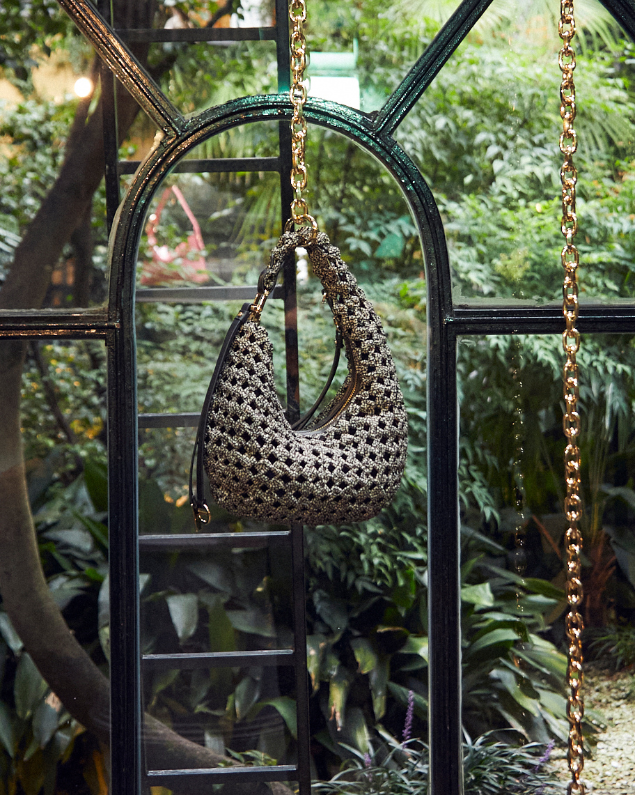 Against a backdrop of ethereal artworks suspended from trees and adorning the ceiling of the illustrious palazzo, a mesmerizing ambience takes shape. Complete with a Koi carp-inhabited pond and a captivatingly bold underground pool, Borbonese’s spring/summer 2024 accessories gracefully engage in a captivating conversation with the space itself. This architectural masterpiece seamlessly blends bourgeois and avant-garde elements, custom-tailored for the occasion with exquisite OP detailing. Additionally, Borbonese joins forces with Flash Art to select Ambra Castagnetti, a prominent Italian female artist represented by Galleria Francesca Minini, whose awe-inspiring artworks perfectly complement the brand’s vision.