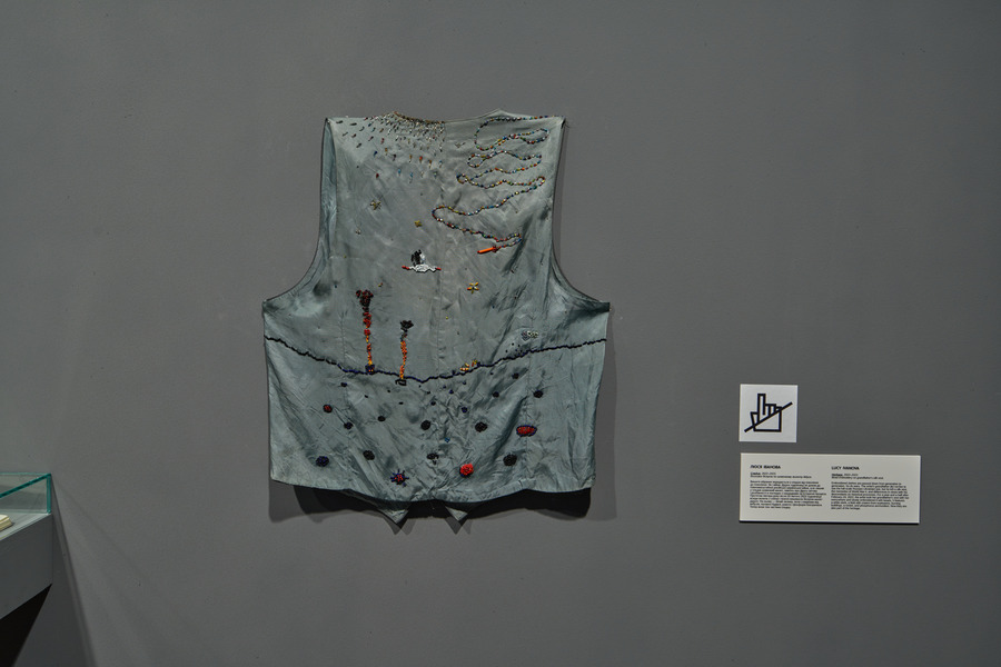 KALTBLUT: There’s another part on the other side of the wall of the works we just talked about, which is about family. Lucy Ivanova has embroidered a vest by her late grandfather, who died before the full-scale invasion.