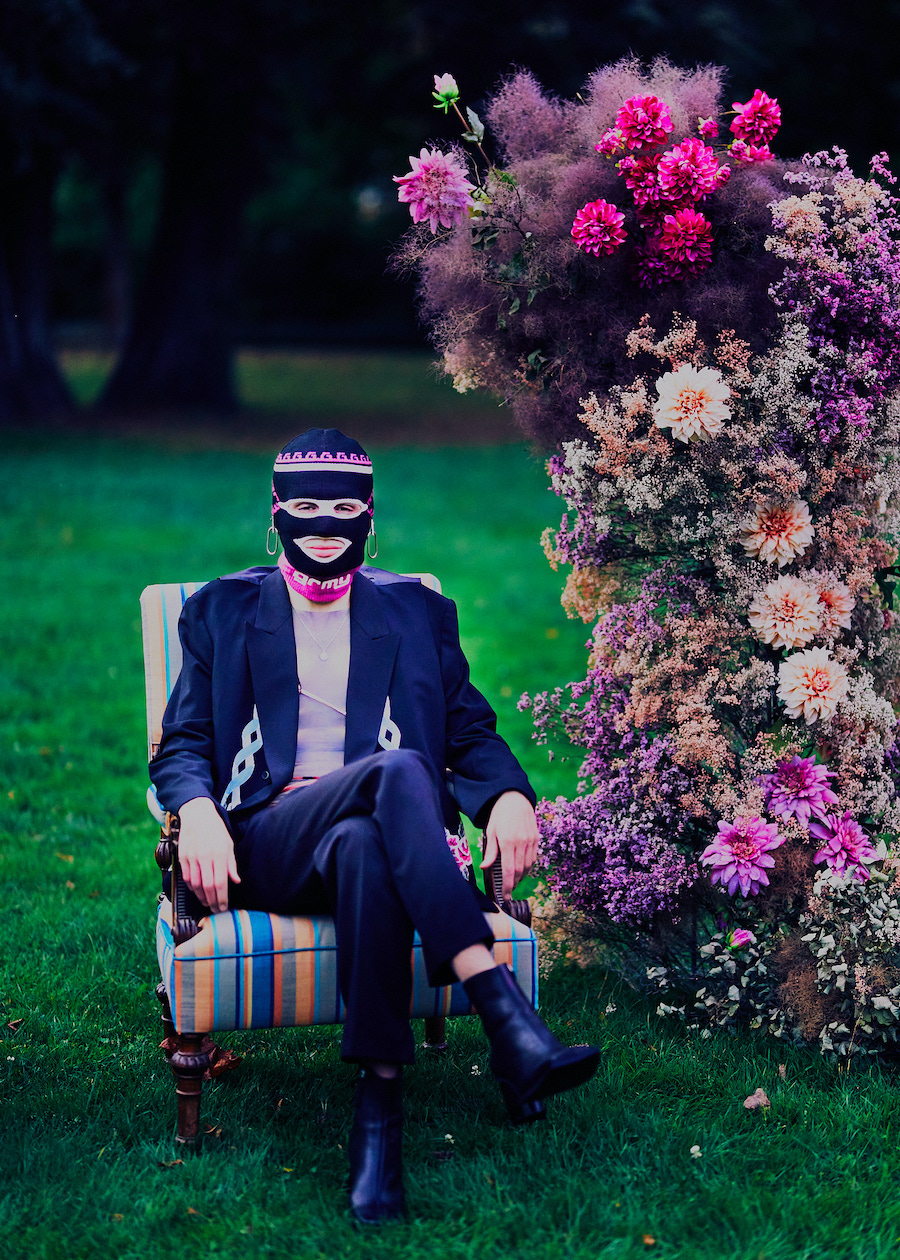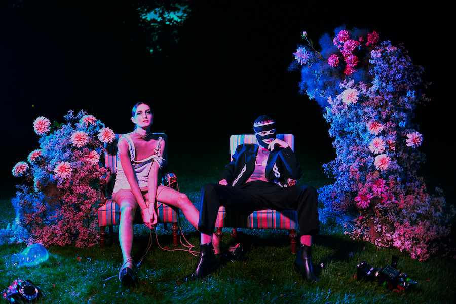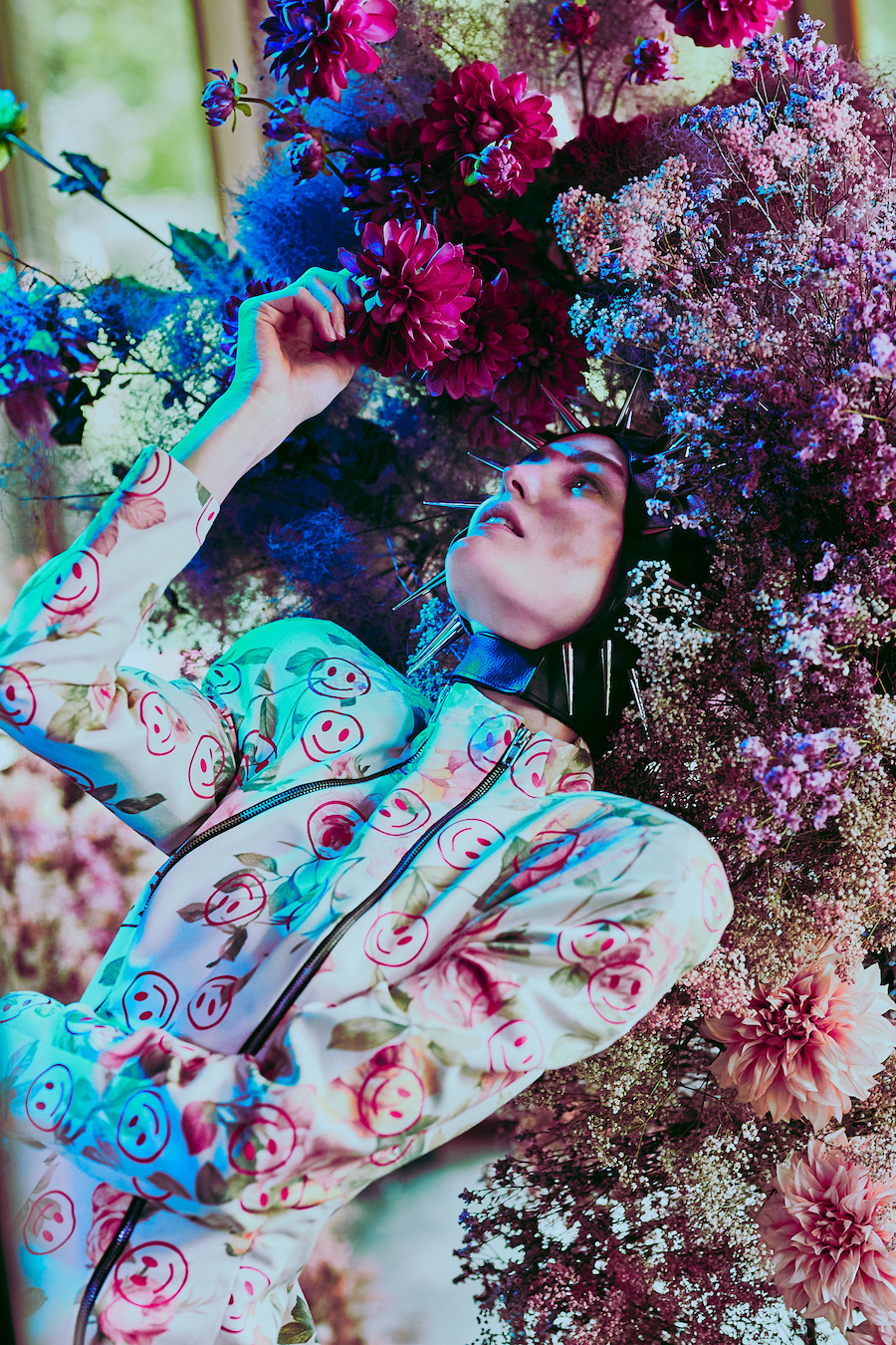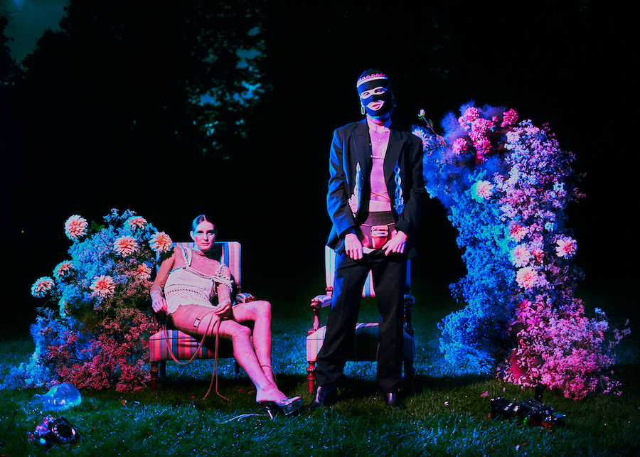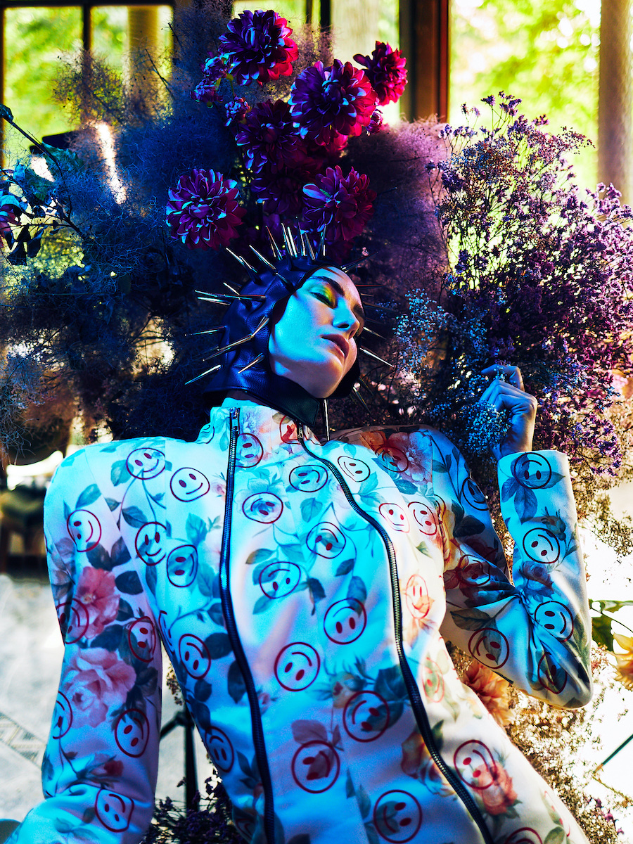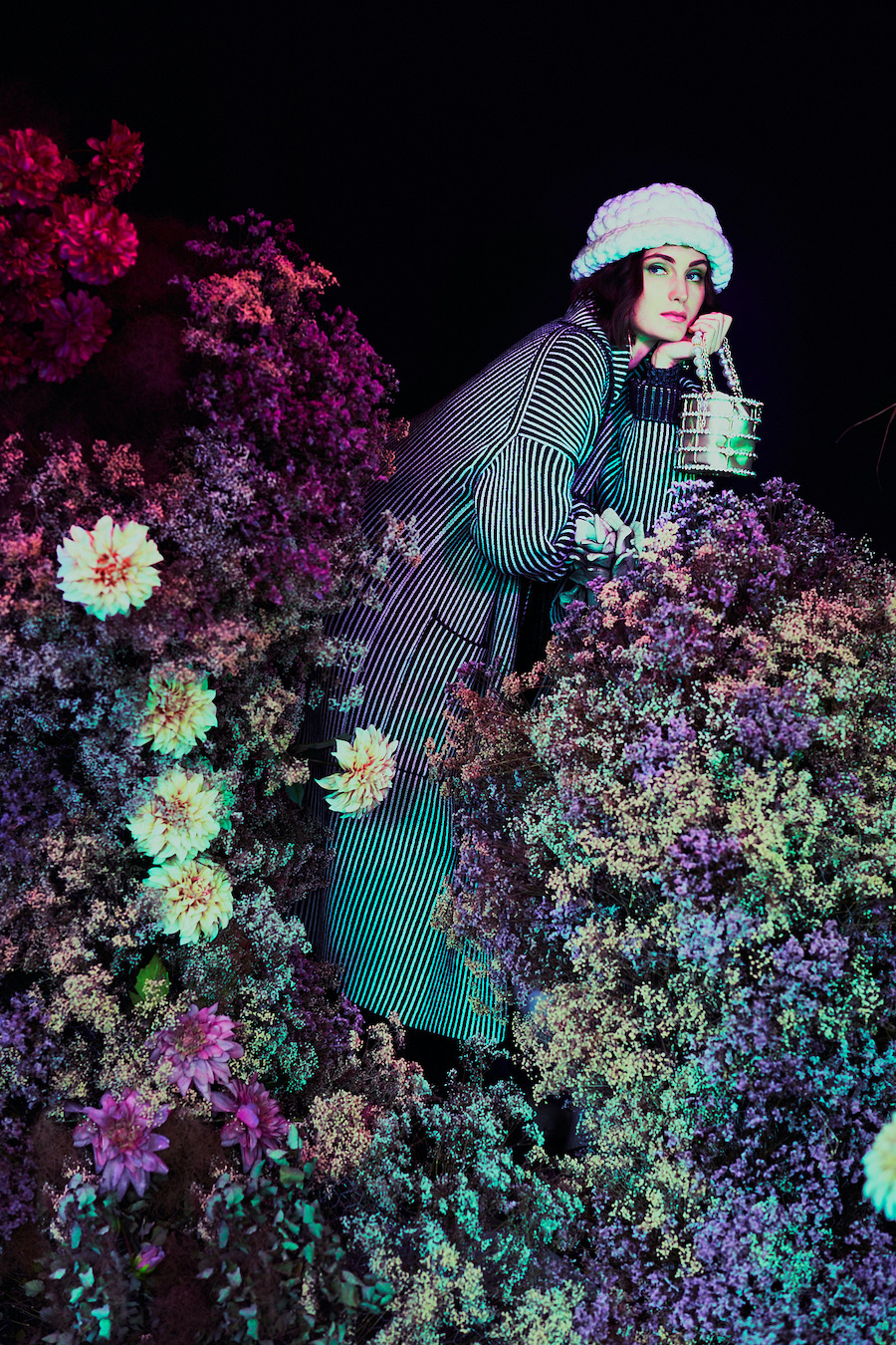 The pictures were photographed in an abandoned tea house from the 1950s and the park of Schönhausen Palace in Berlin. The setup also includes characteristic flower pieces to contrast the emptiness of the building created by the floral designers, Ann-Kathrin Hoffmann, Vivi Tenk and Pegah Nafari.