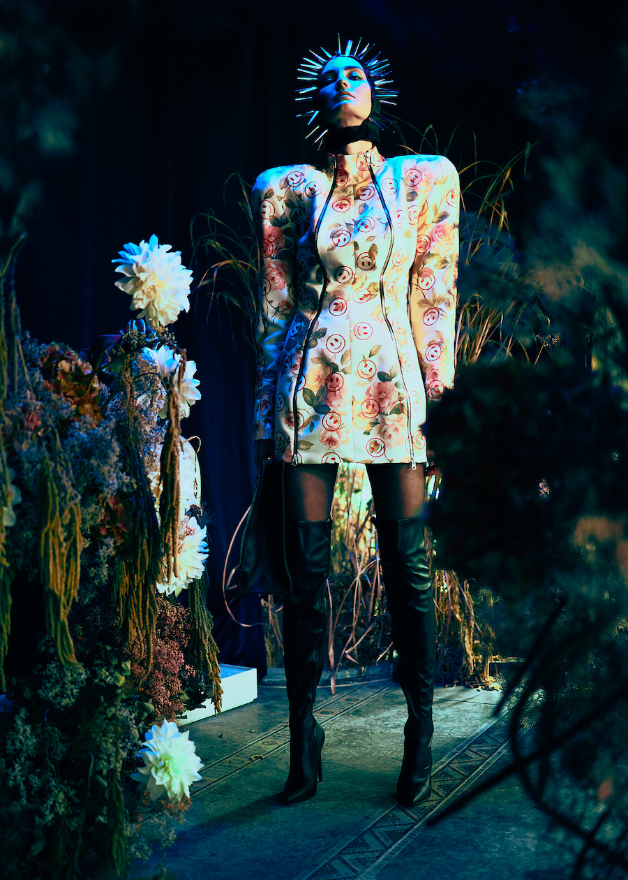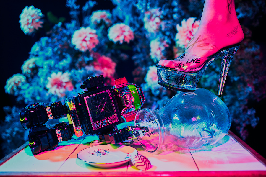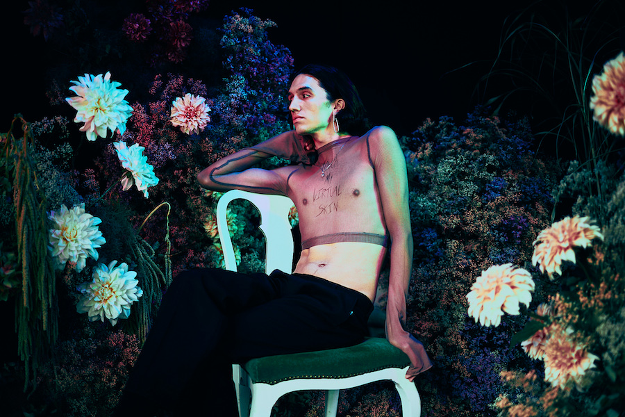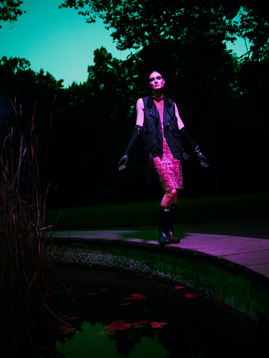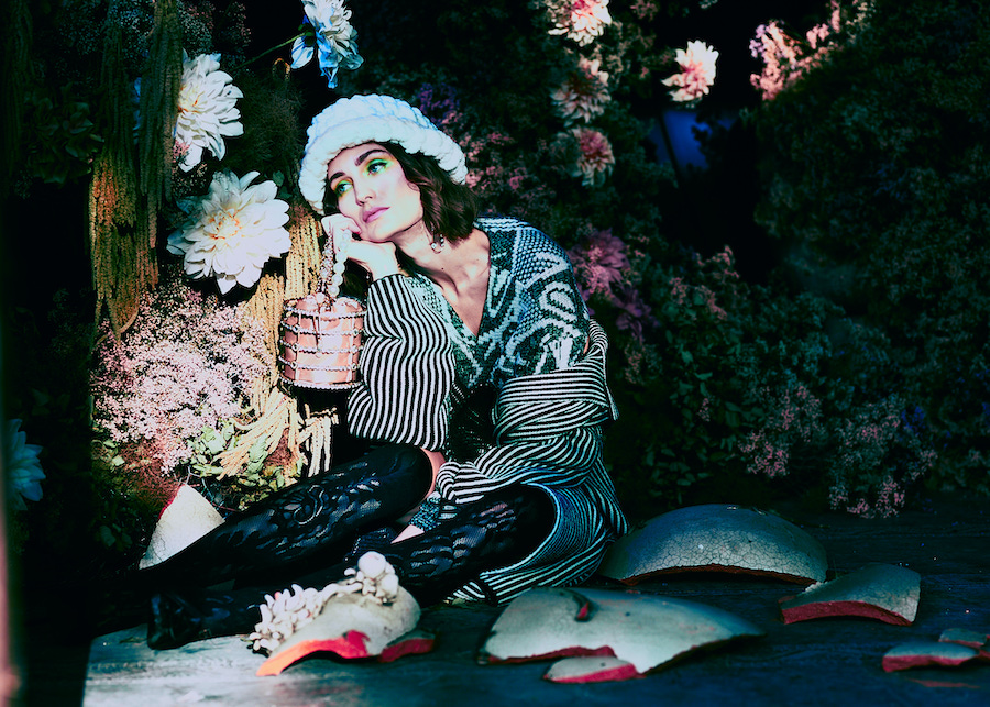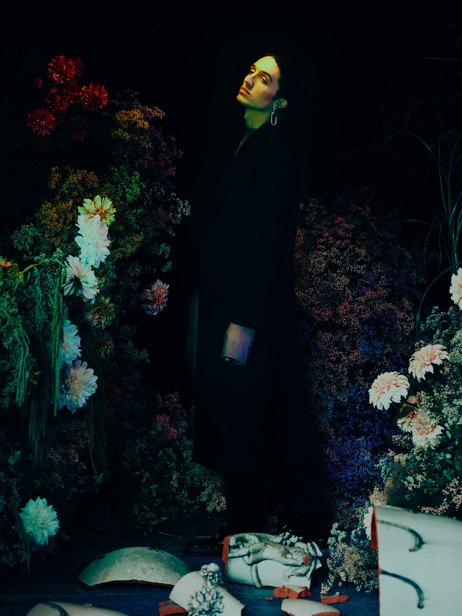 The pictures were photographed in an abandoned tea house from the 1950s and the park of Schönhausen Palace in Berlin. The setup also includes characteristic flower pieces to contrast the emptiness of the building created by the floral designers, Ann-Kathrin Hoffmann, Vivi Tenk and Pegah Nafari.