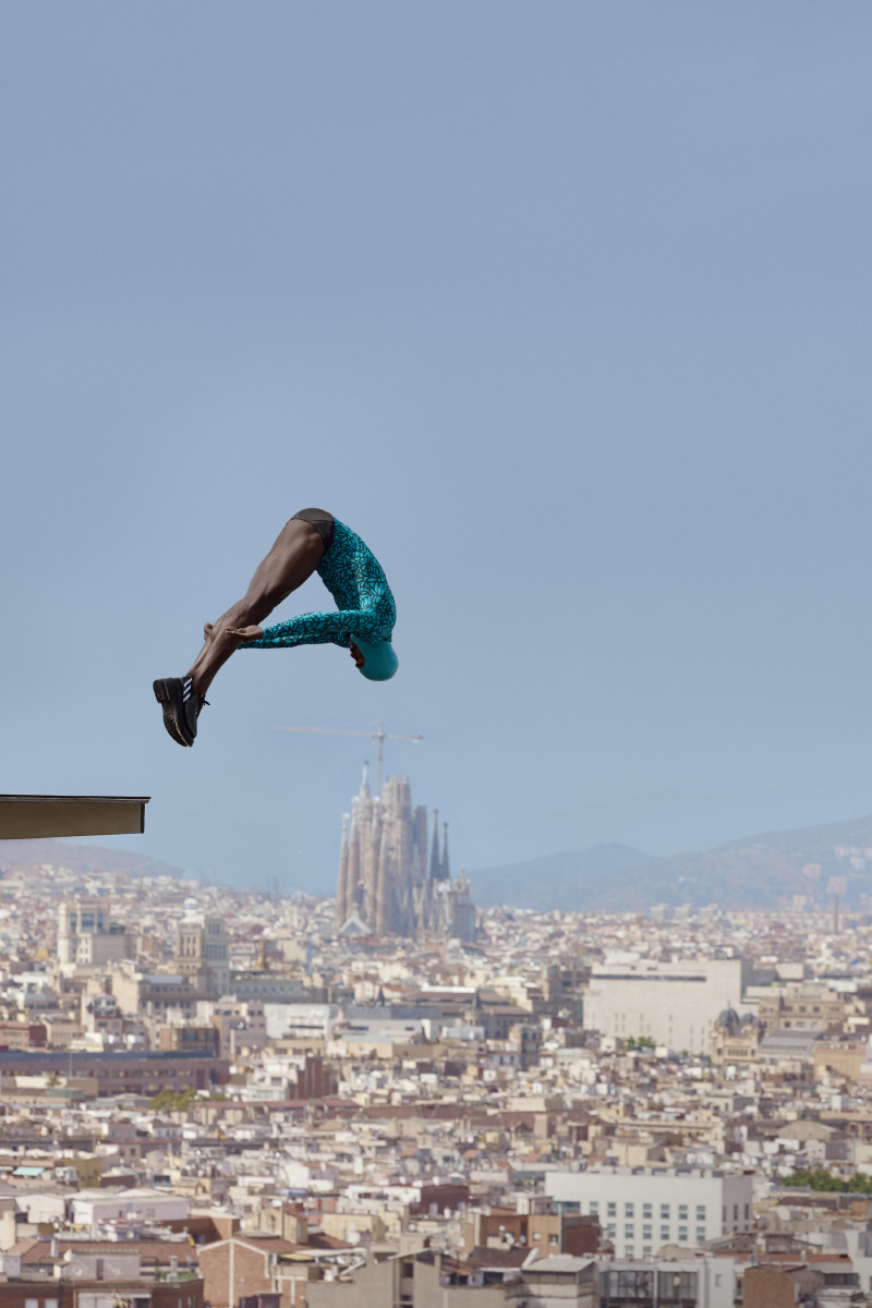 The campaign was shot at Piscina Municipal de Montjuïc in Barcelona, which overlooks the city and Gaudi’s Sagrada Familia basilica. These views make it one of the most beautiful and traditional outdoor diving pools in the world.