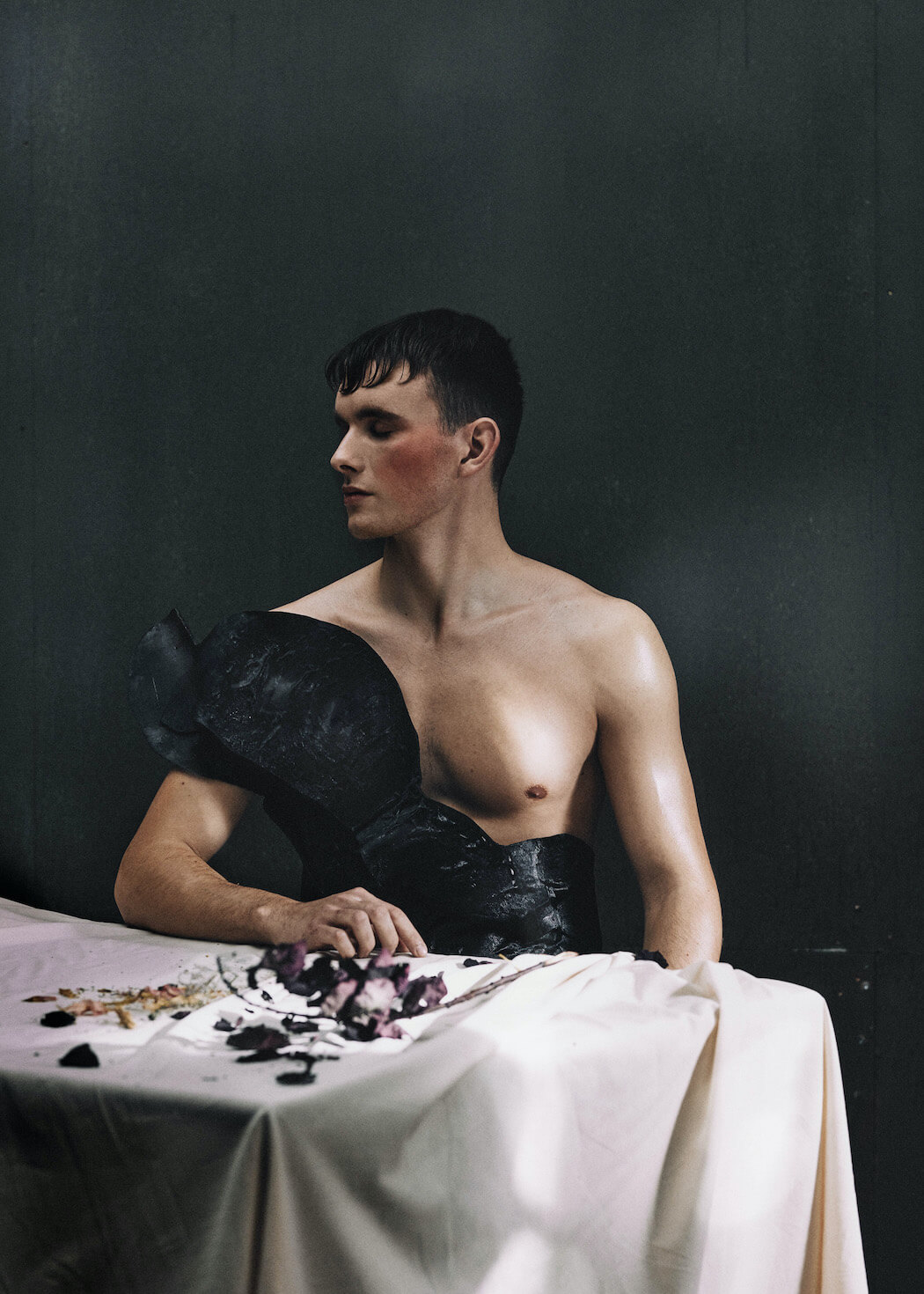 A KALTBLUT exclusive menswear story. Photography by Hans Andersson. Make up by Elin Laine. Styling by Anton Wang. A story about a boy and his melancholic, singular, costume party. Model is Lennart Frandsen. Designers are Felicia Åström / Beckmans, Ada Swärd / Beckmans, Hanna Isaksson / The Swedish School of Textiles, Fredrik Möller / The Swedish School of Textiles, NAND, HOPE, Acne, Filippa K and Remake.