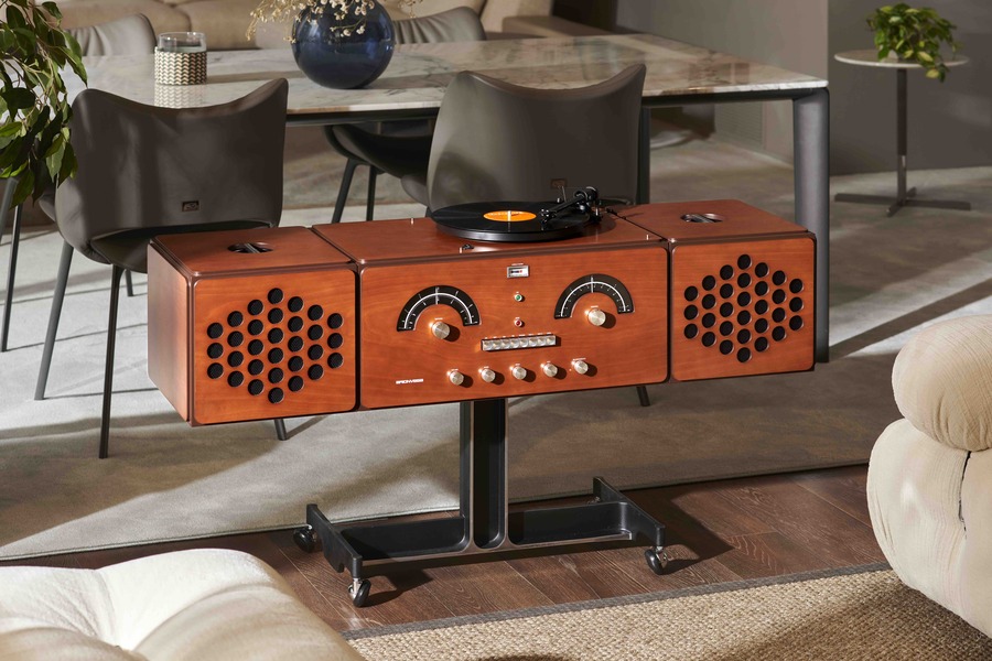 The cherry finish has always been revered in the world of interior design, further accentuating the Radiofonografo’s timeless and distinctive qualities. This limited edition release showcases the meticulous craftsmanship and attention to detail of accomplished artisans who transform each Cherrywood Radiofonografo into a masterpiece, blurring the line between craftsmanship and industrial artistry.