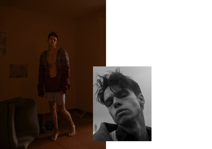 A KALTBLUT exclusive fashion editorial. Photographer Francesco Bonasia captured male model Jordan Antrim @Urban Management for us. Styling by Nicola Indelicato. All fashion by Elisabetta Burtsteva. A Florence based fashion design student at Polimoda, with a melting pot background of Russian rock and motorcycle roots together with Italian arts and craftsmanship skills. Avantgarde designer with a melting pot background of Russian rock and motorcycle roots together with Italian arts and craftsmanship skills. Very much in tune with the underground music and photography scene and a very poetic approach to fashion. Whose work translates common yet intimate aspects of daily life into a spectrum of sensitivity. The garments represent the balance between a man’s passion and his fragility, creating a shield for his soul and his self. This concept is mirrored in the use of fabrics, which vary from denim, to knitwear and bolts.