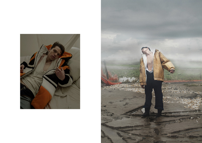 A KALTBLUT exclusive fashion editorial. Photographer Francesco Bonasia captured male model Jordan Antrim @Urban Management for us. Styling by Nicola Indelicato. All fashion by Elisabetta Burtsteva. A Florence based fashion design student at Polimoda, with a melting pot background of Russian rock and motorcycle roots together with Italian arts and craftsmanship skills. Avantgarde designer with a melting pot background of Russian rock and motorcycle roots together with Italian arts and craftsmanship skills. Very much in tune with the underground music and photography scene and a very poetic approach to fashion. Whose work translates common yet intimate aspects of daily life into a spectrum of sensitivity. The garments represent the balance between a man’s passion and his fragility, creating a shield for his soul and his self. This concept is mirrored in the use of fabrics, which vary from denim, to knitwear and bolts.