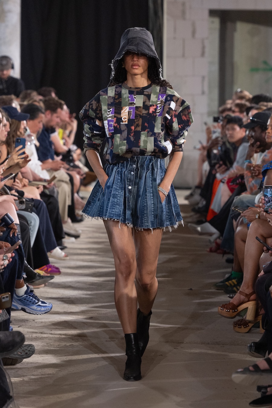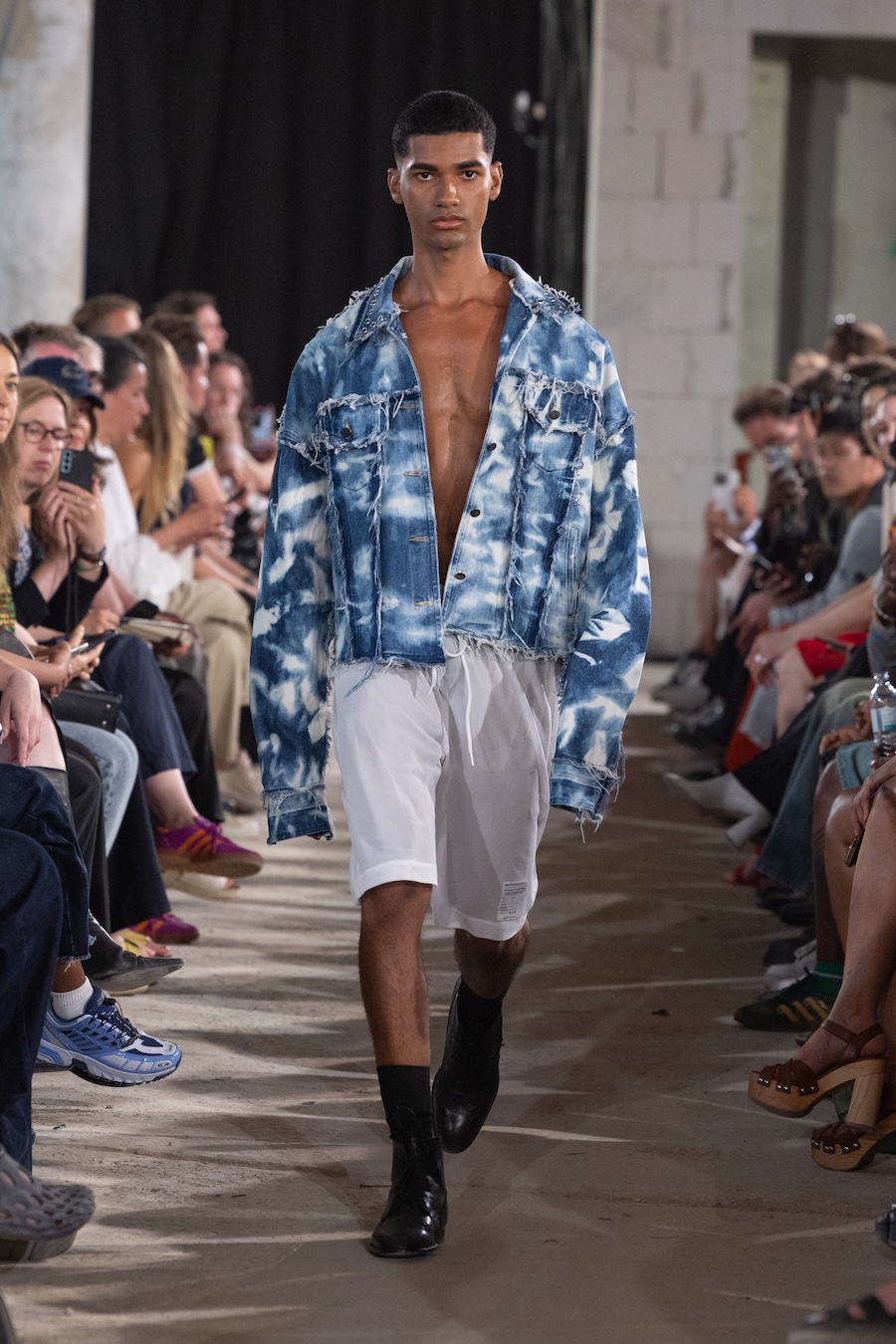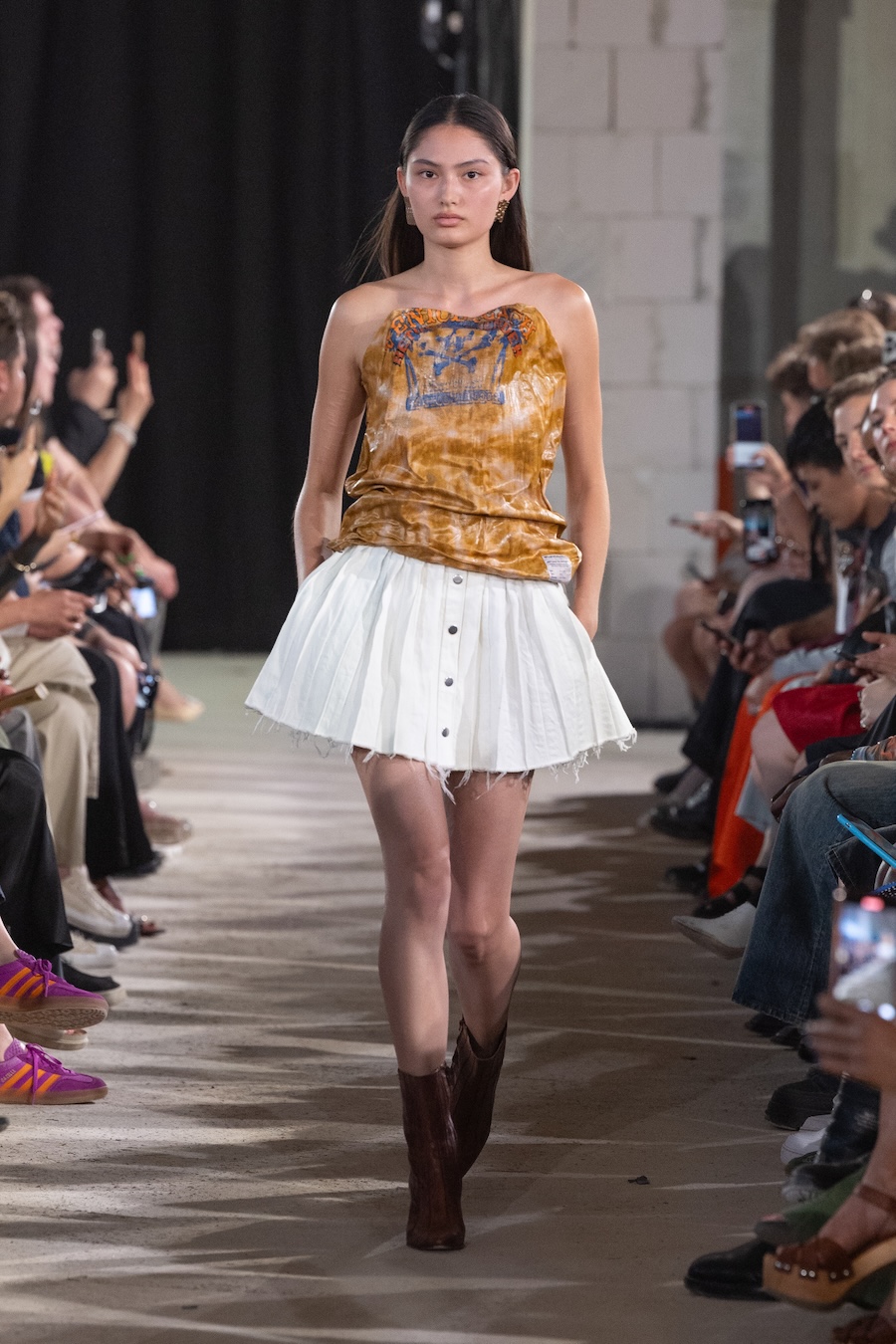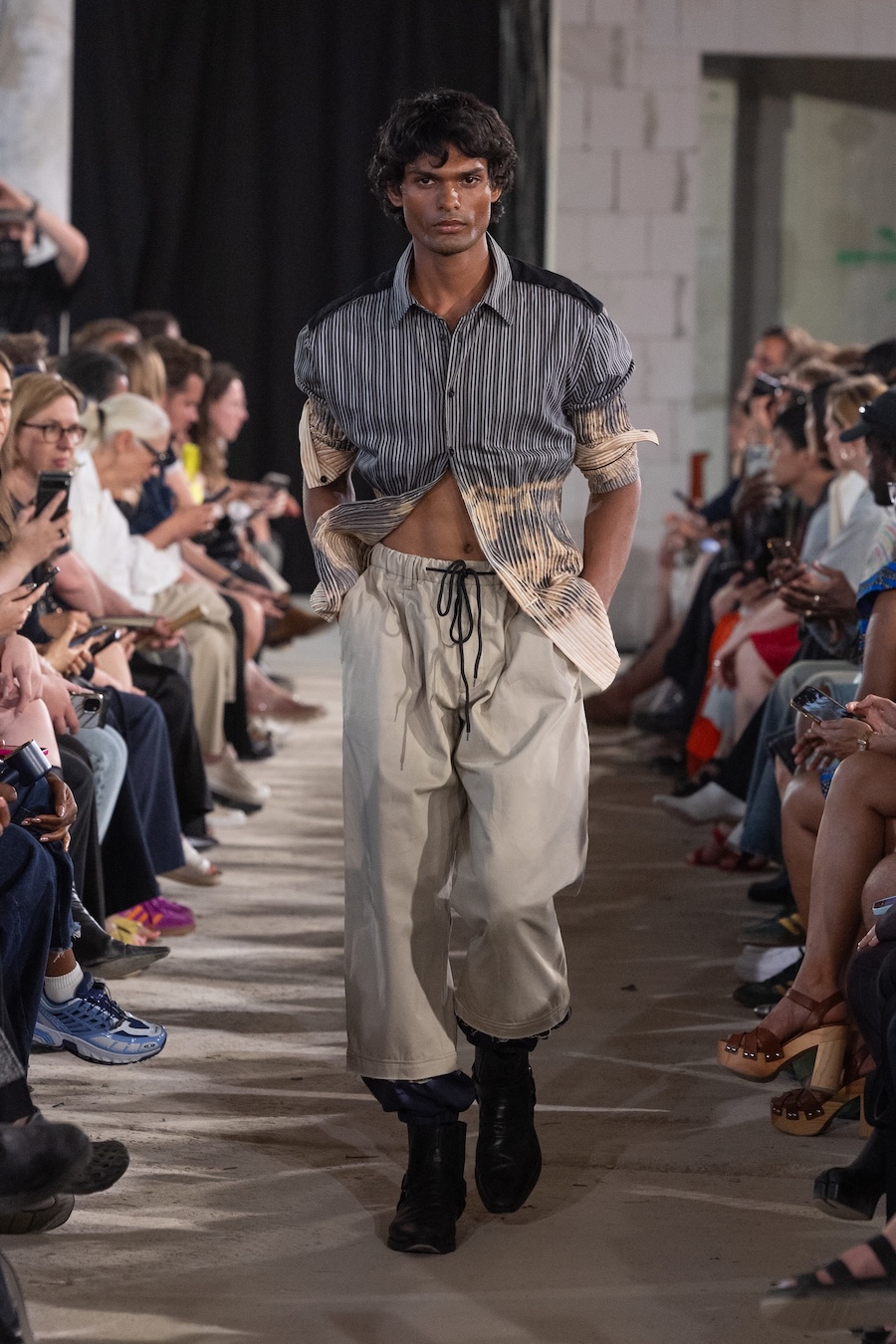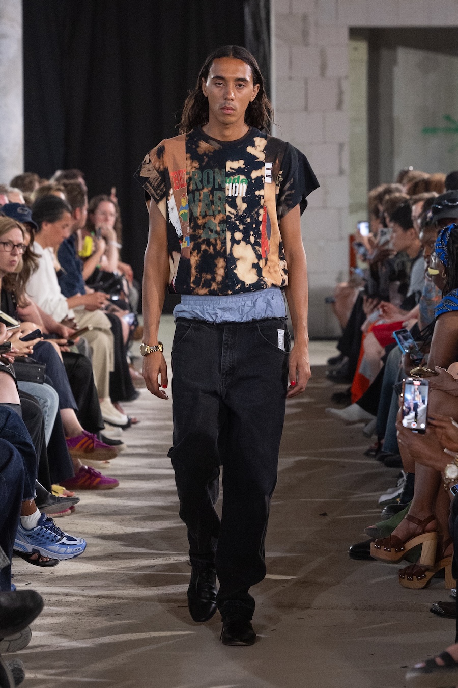 This collection serves up a dazzling array of deconstructed silhouettes, hand-stitched patchwork, and unexpected cuts that highlight the journey of each fabric. Standout pieces, such as a tucked maxi dress fashioned from six repurposed shirts and delicately pleated for volume, redefine modern elegance. Meanwhile, denim, a staple from the collection, emerges in various forms: bleached, layered, and boldly punctuated with fragmented waistbands, playing into streetwear aesthetics that juxtapose classic tailoring with casual flair.