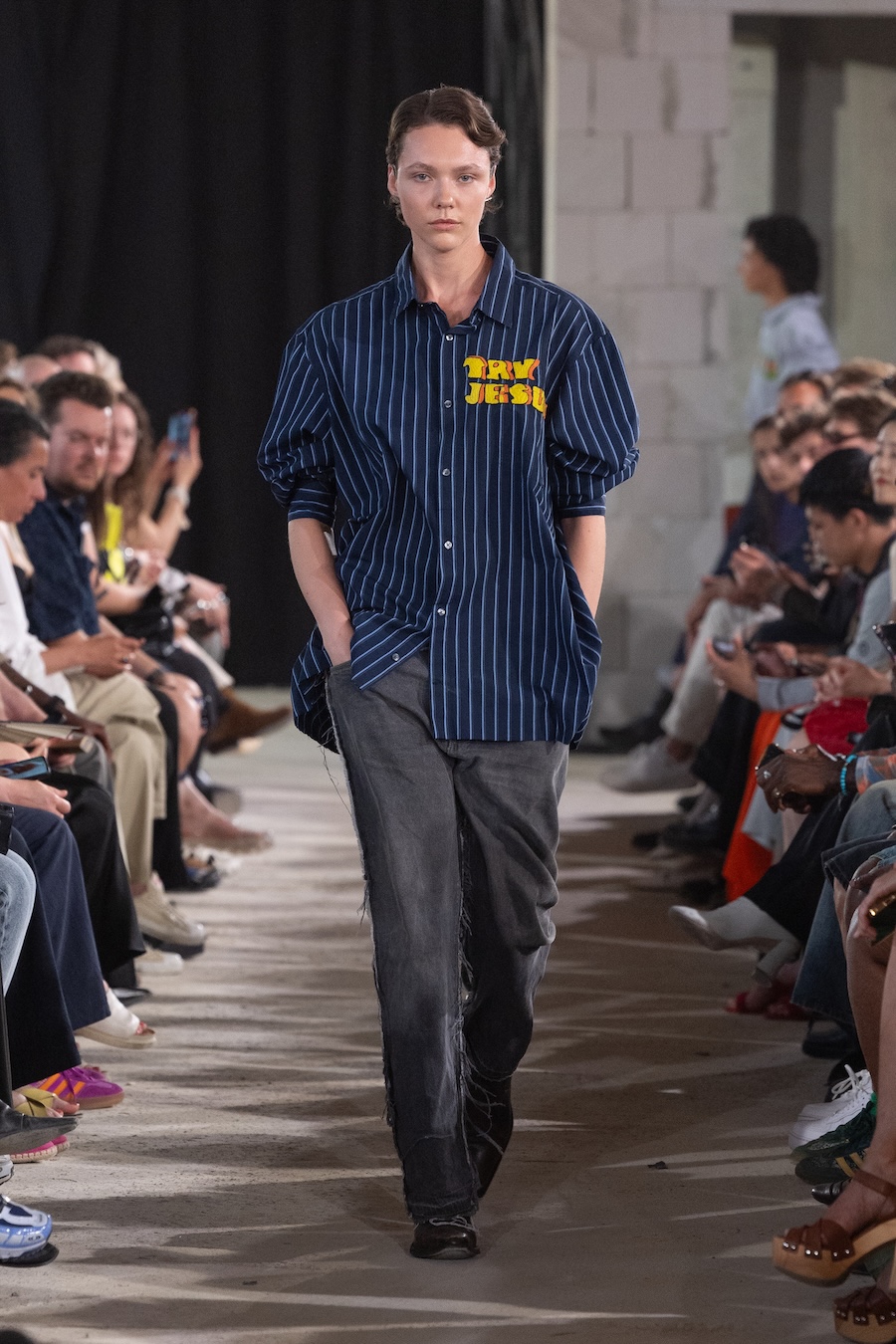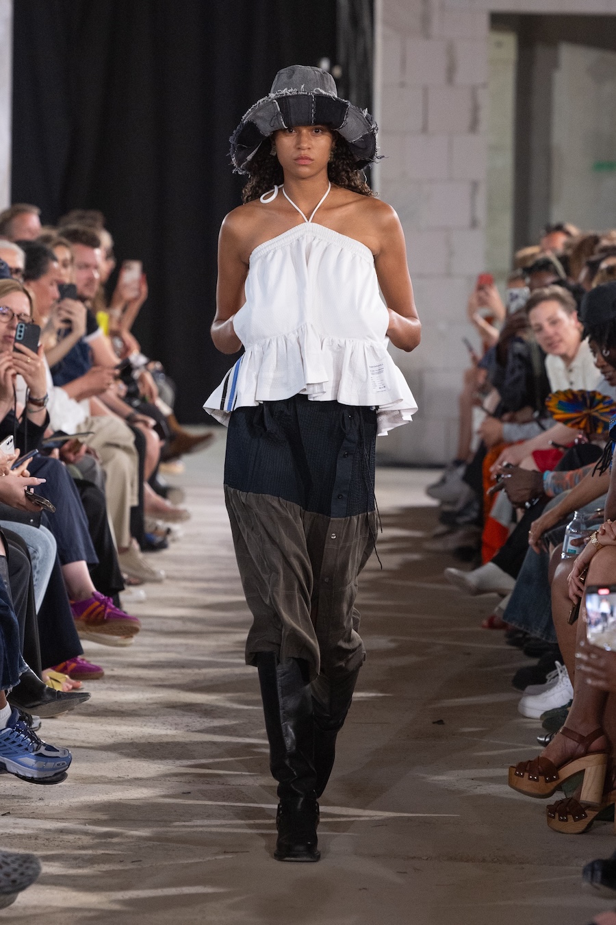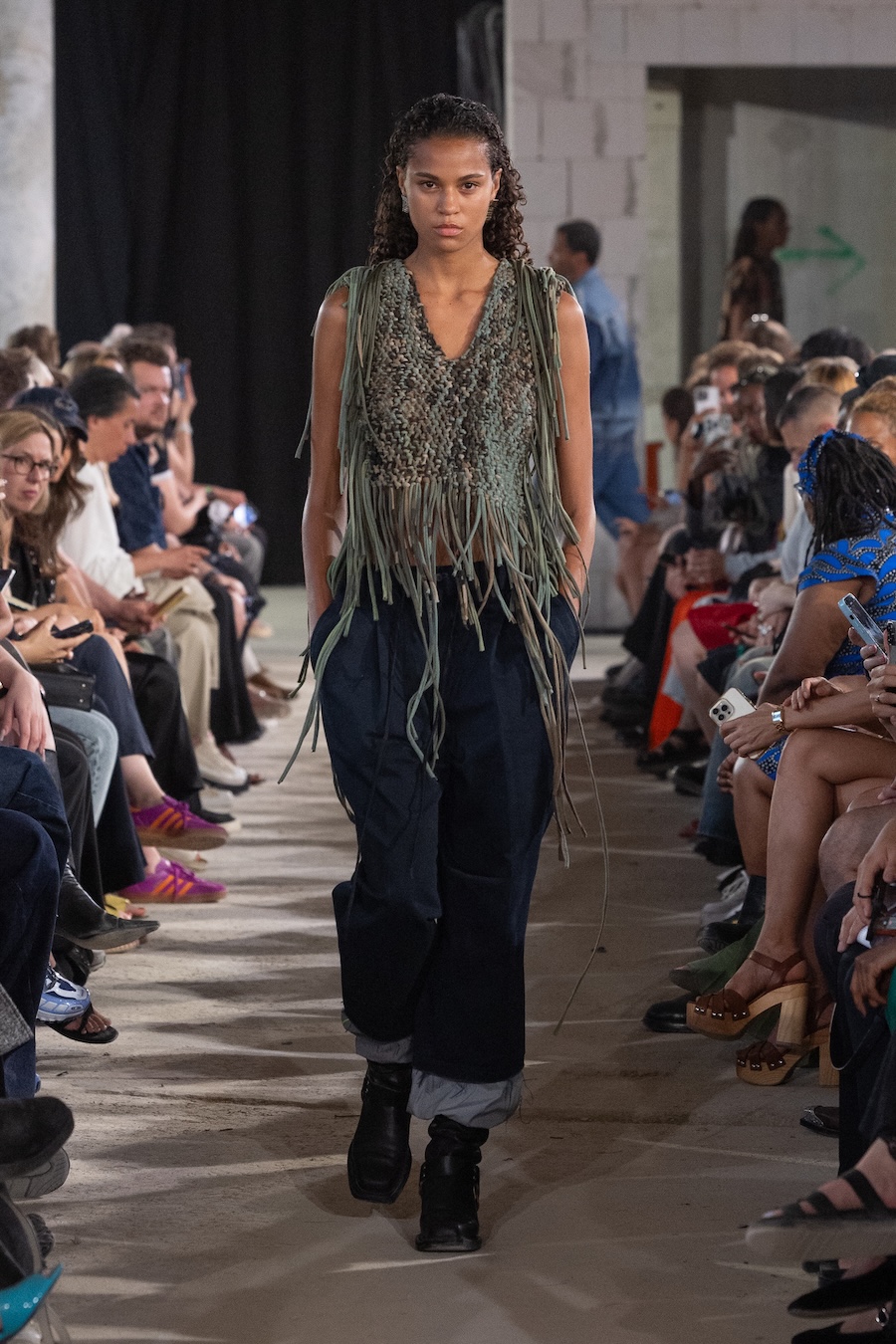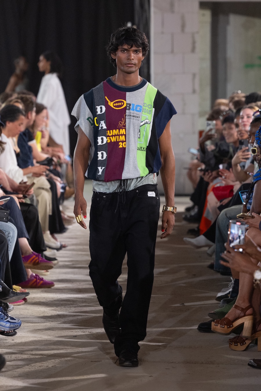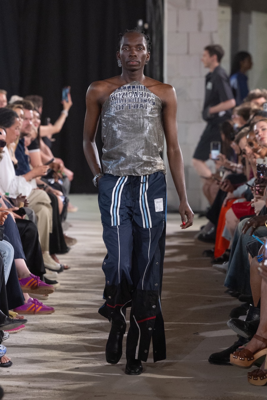 This collection serves up a dazzling array of deconstructed silhouettes, hand-stitched patchwork, and unexpected cuts that highlight the journey of each fabric. Standout pieces, such as a tucked maxi dress fashioned from six repurposed shirts and delicately pleated for volume, redefine modern elegance. Meanwhile, denim, a staple from the collection, emerges in various forms: bleached, layered, and boldly punctuated with fragmented waistbands, playing into streetwear aesthetics that juxtapose classic tailoring with casual flair.