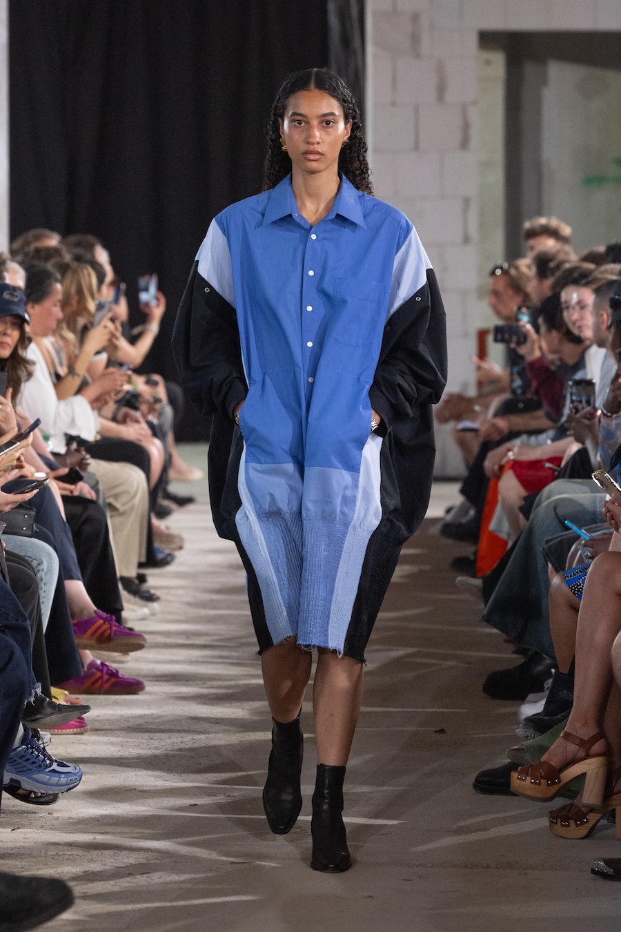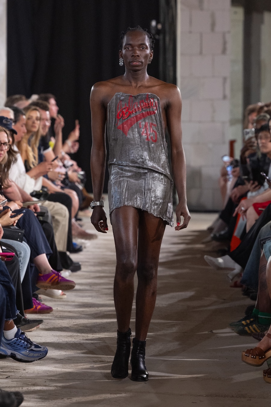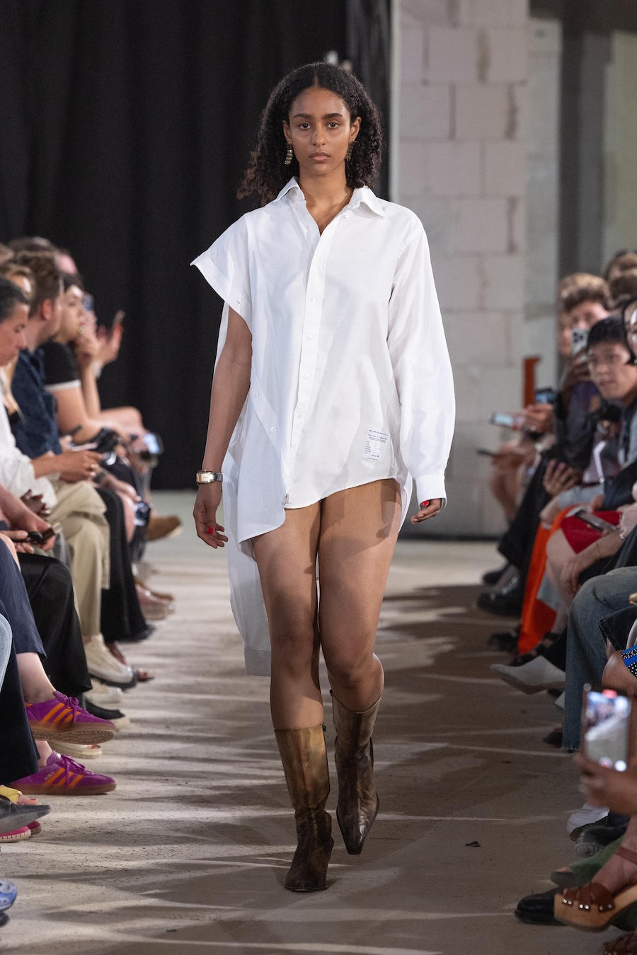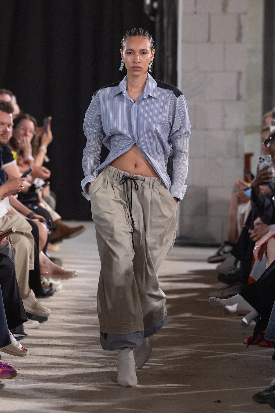 This collection serves up a dazzling array of deconstructed silhouettes, hand-stitched patchwork, and unexpected cuts that highlight the journey of each fabric. Standout pieces, such as a tucked maxi dress fashioned from six repurposed shirts and delicately pleated for volume, redefine modern elegance. Meanwhile, denim, a staple from the collection, emerges in various forms: bleached, layered, and boldly punctuated with fragmented waistbands, playing into streetwear aesthetics that juxtapose classic tailoring with casual flair.