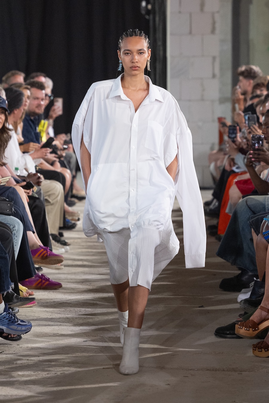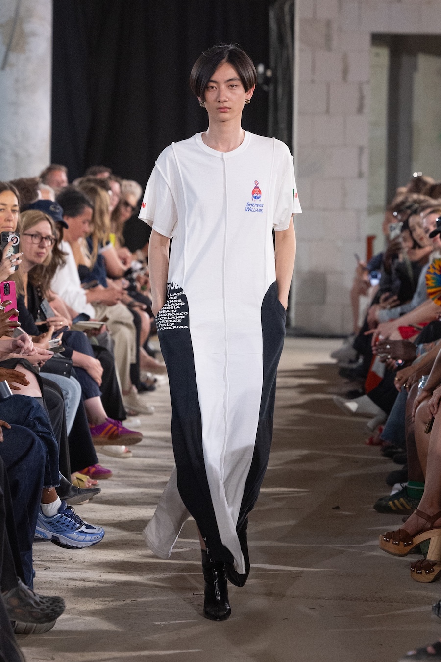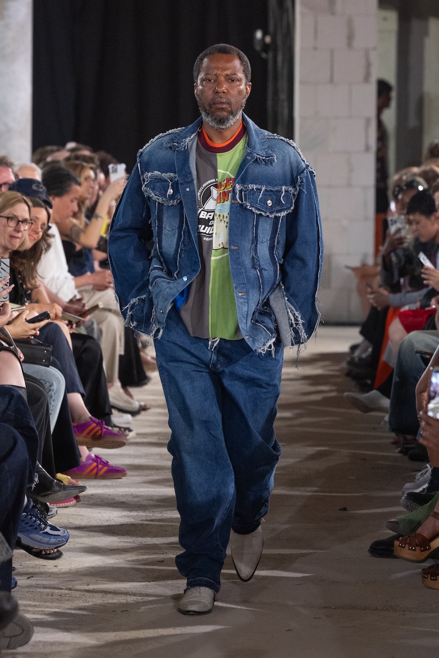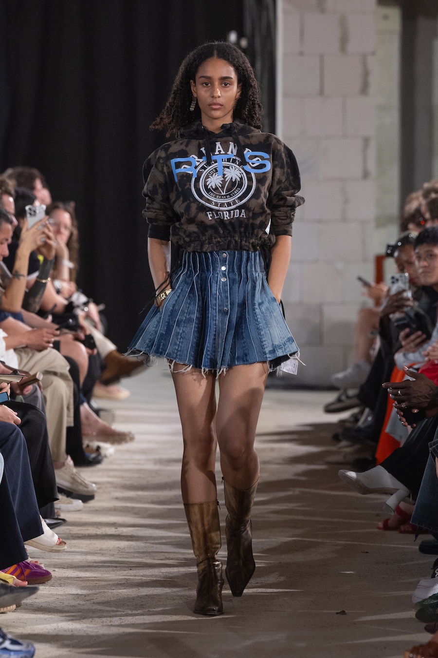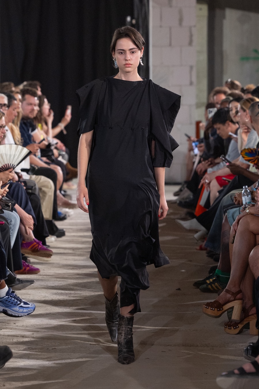 This collection serves up a dazzling array of deconstructed silhouettes, hand-stitched patchwork, and unexpected cuts that highlight the journey of each fabric. Standout pieces, such as a tucked maxi dress fashioned from six repurposed shirts and delicately pleated for volume, redefine modern elegance. Meanwhile, denim, a staple from the collection, emerges in various forms: bleached, layered, and boldly punctuated with fragmented waistbands, playing into streetwear aesthetics that juxtapose classic tailoring with casual flair.