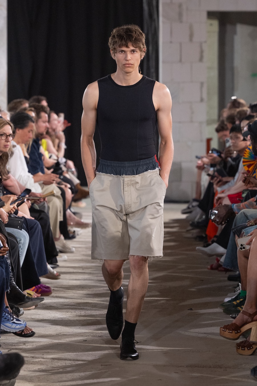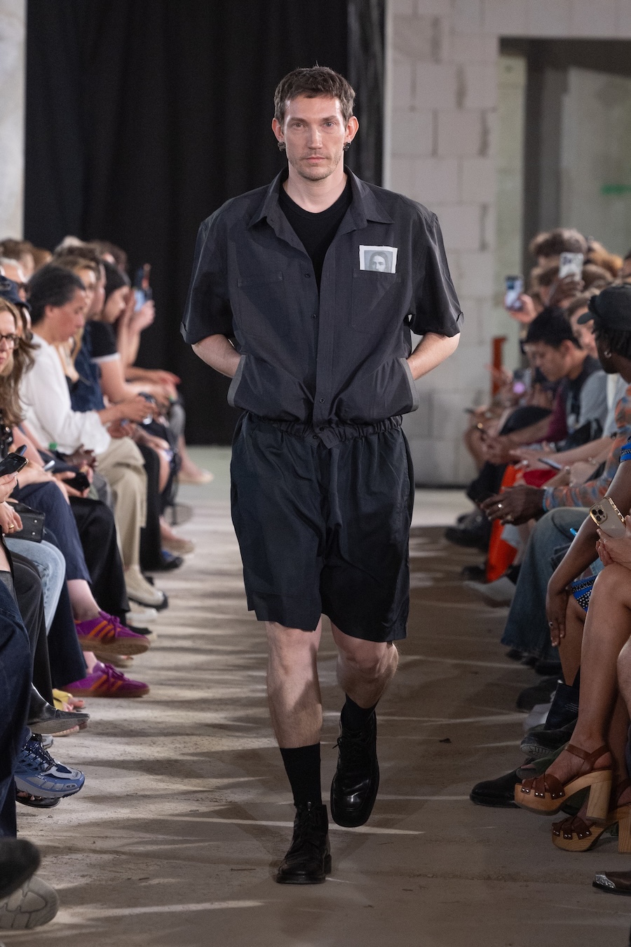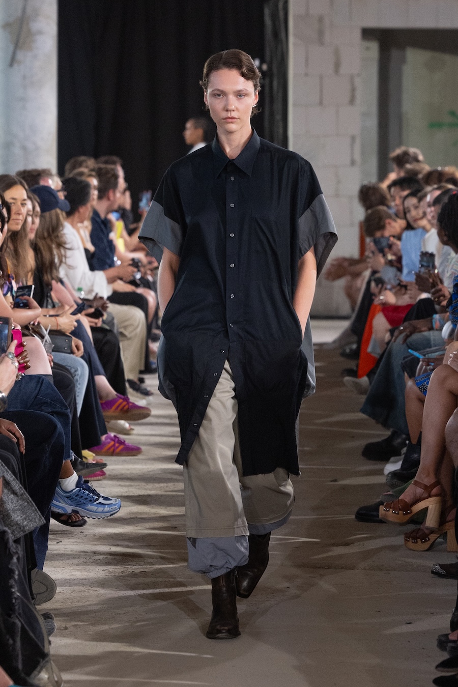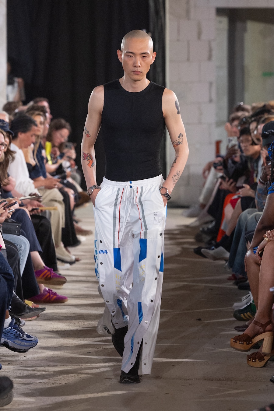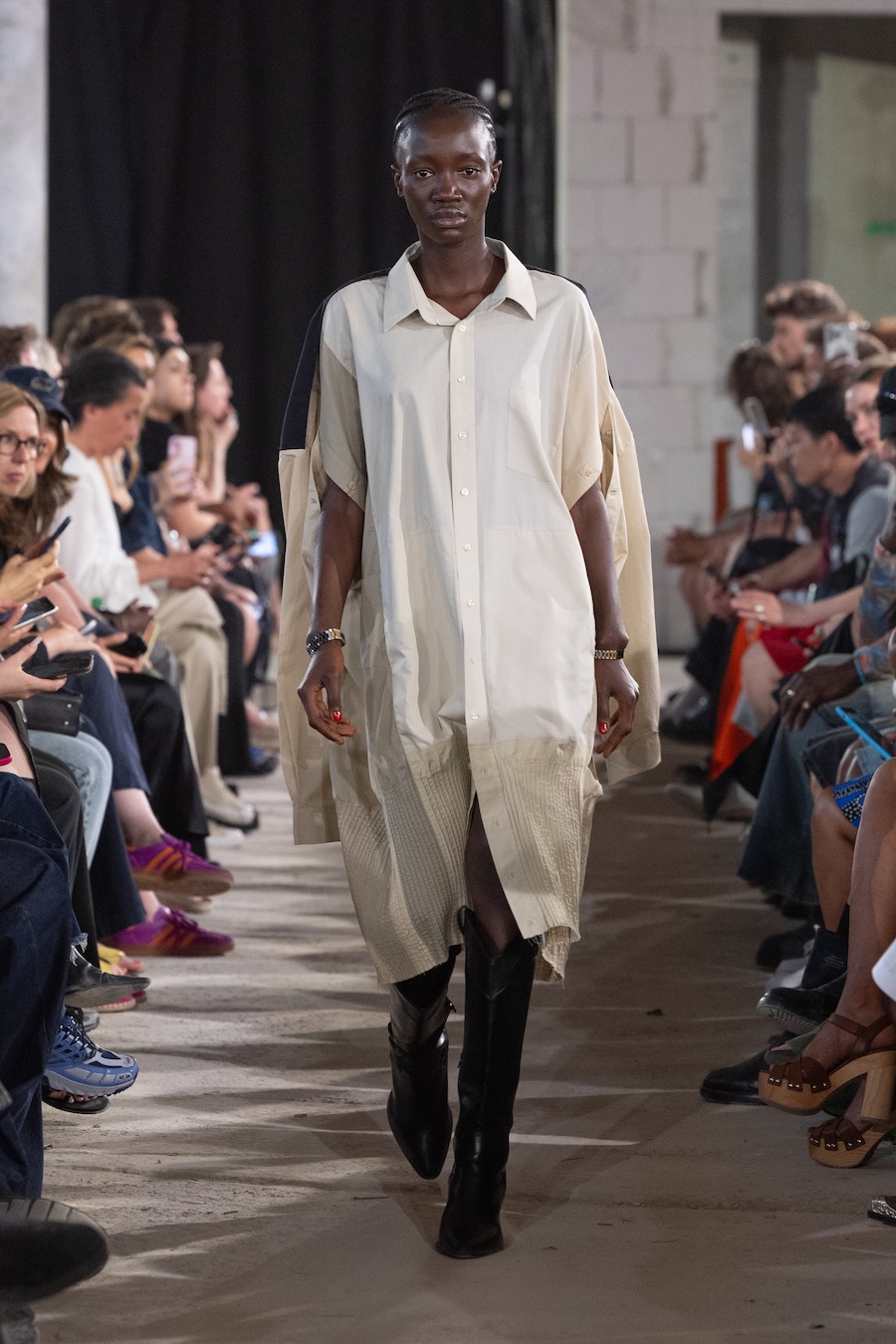 This collection serves up a dazzling array of deconstructed silhouettes, hand-stitched patchwork, and unexpected cuts that highlight the journey of each fabric. Standout pieces, such as a tucked maxi dress fashioned from six repurposed shirts and delicately pleated for volume, redefine modern elegance. Meanwhile, denim, a staple from the collection, emerges in various forms: bleached, layered, and boldly punctuated with fragmented waistbands, playing into streetwear aesthetics that juxtapose classic tailoring with casual flair.