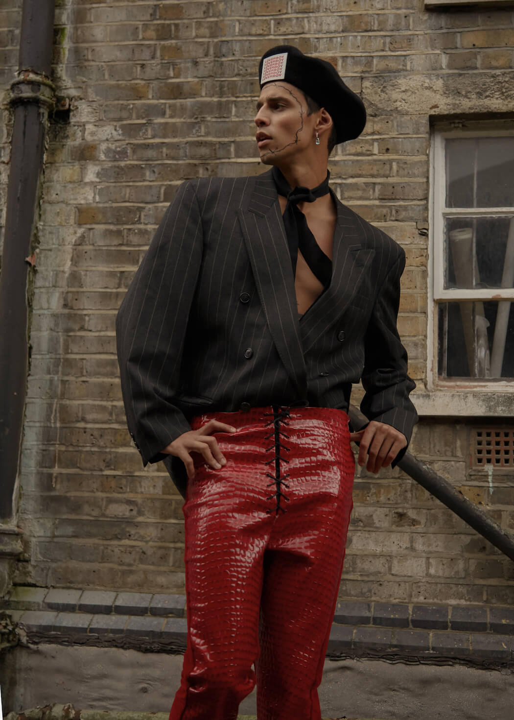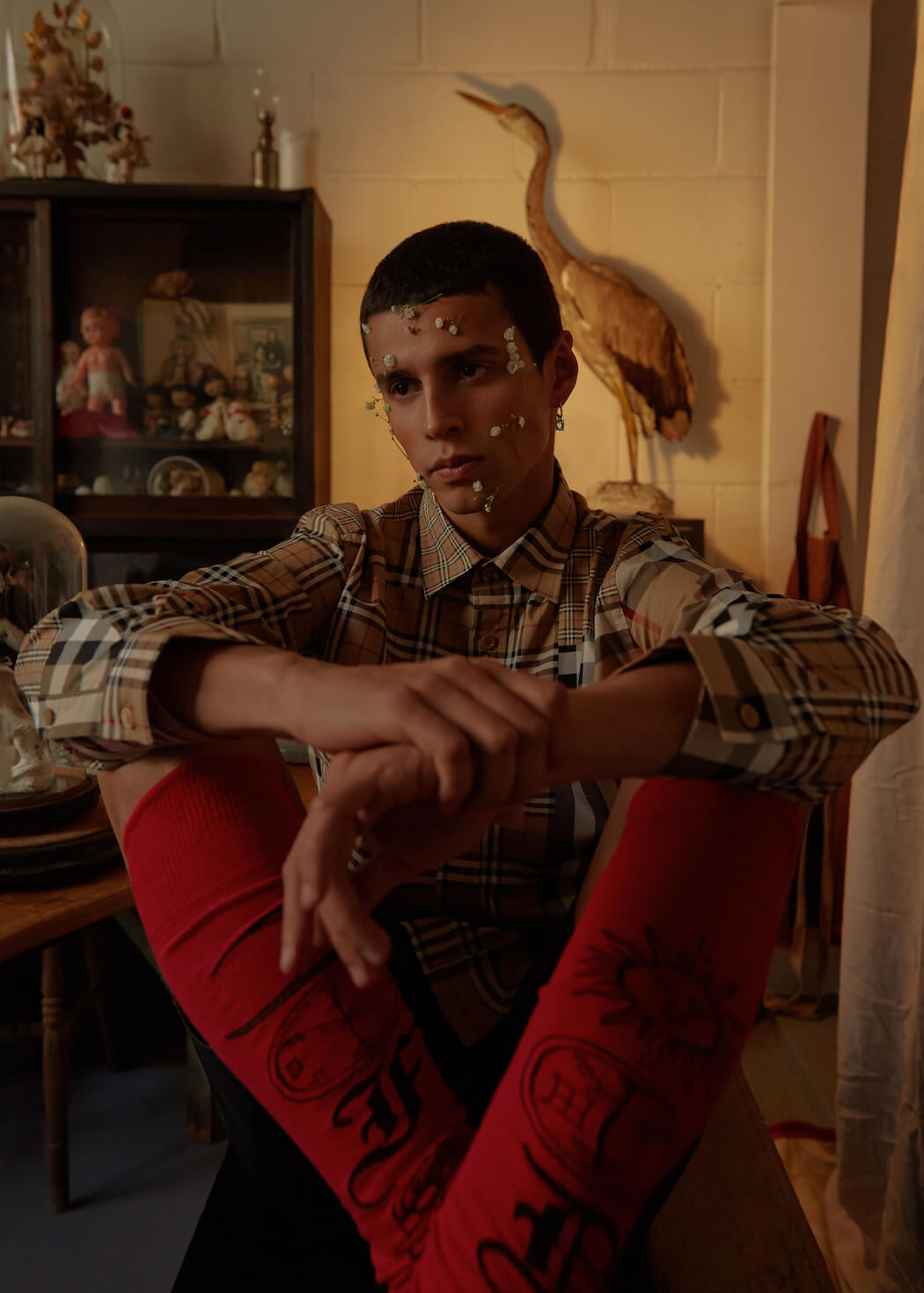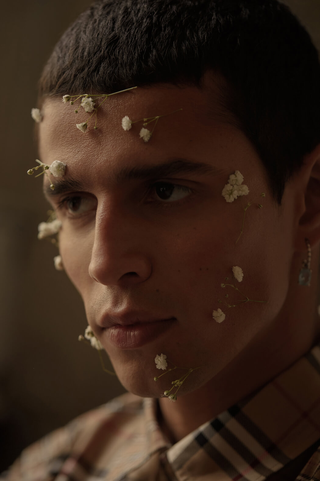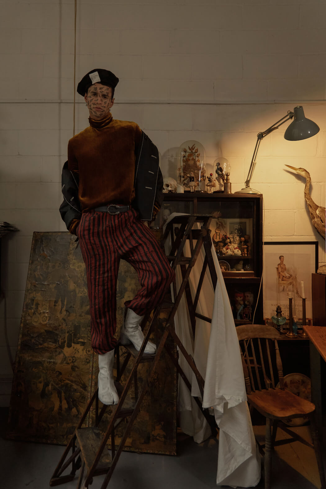 A KALTBLUT exclusive menswear editorial. Photography by Panna Donka. Styling, Set design by Gergely Erdei. Model is Ace signed at KULT models. Make up by Eszter Magyar. The series was inspired by being quarantined in the Cabinet of curiosities, where you can challenge all your inner personalities by playing around with all the found treasures. Like most of my work this editorial also reflects on modern masculinity and male femininity. The team used brands with a similar aesthetic, like Burberry, Maison Margiela, Charles Jeffrey, Ludovic de Saint Sernin.