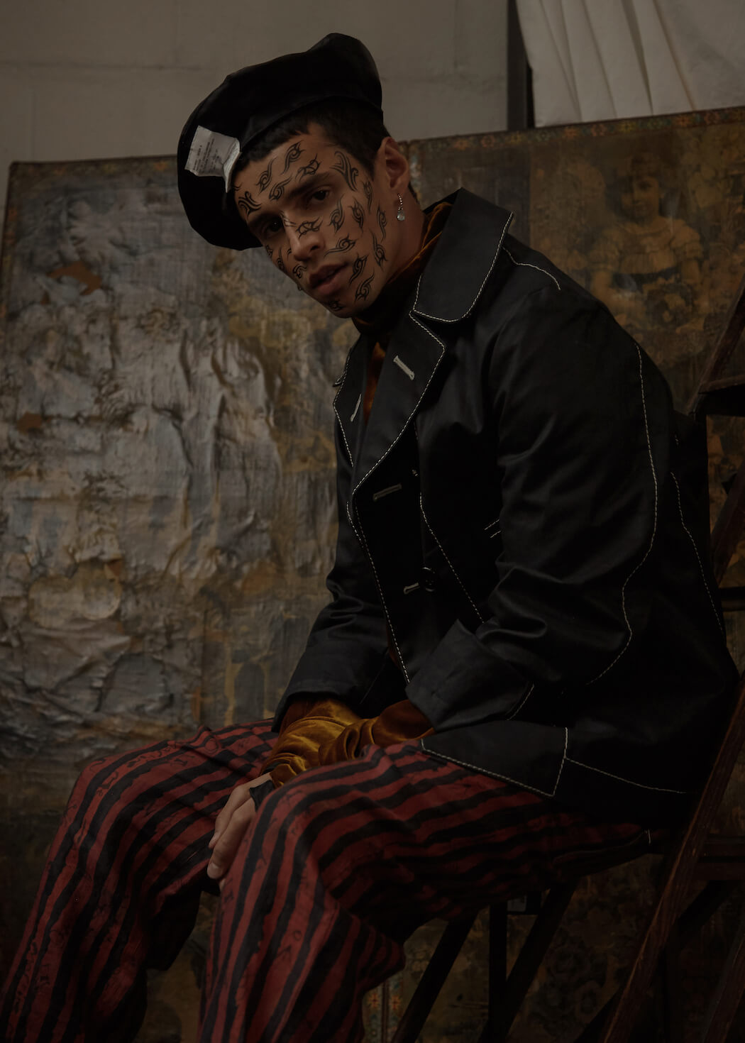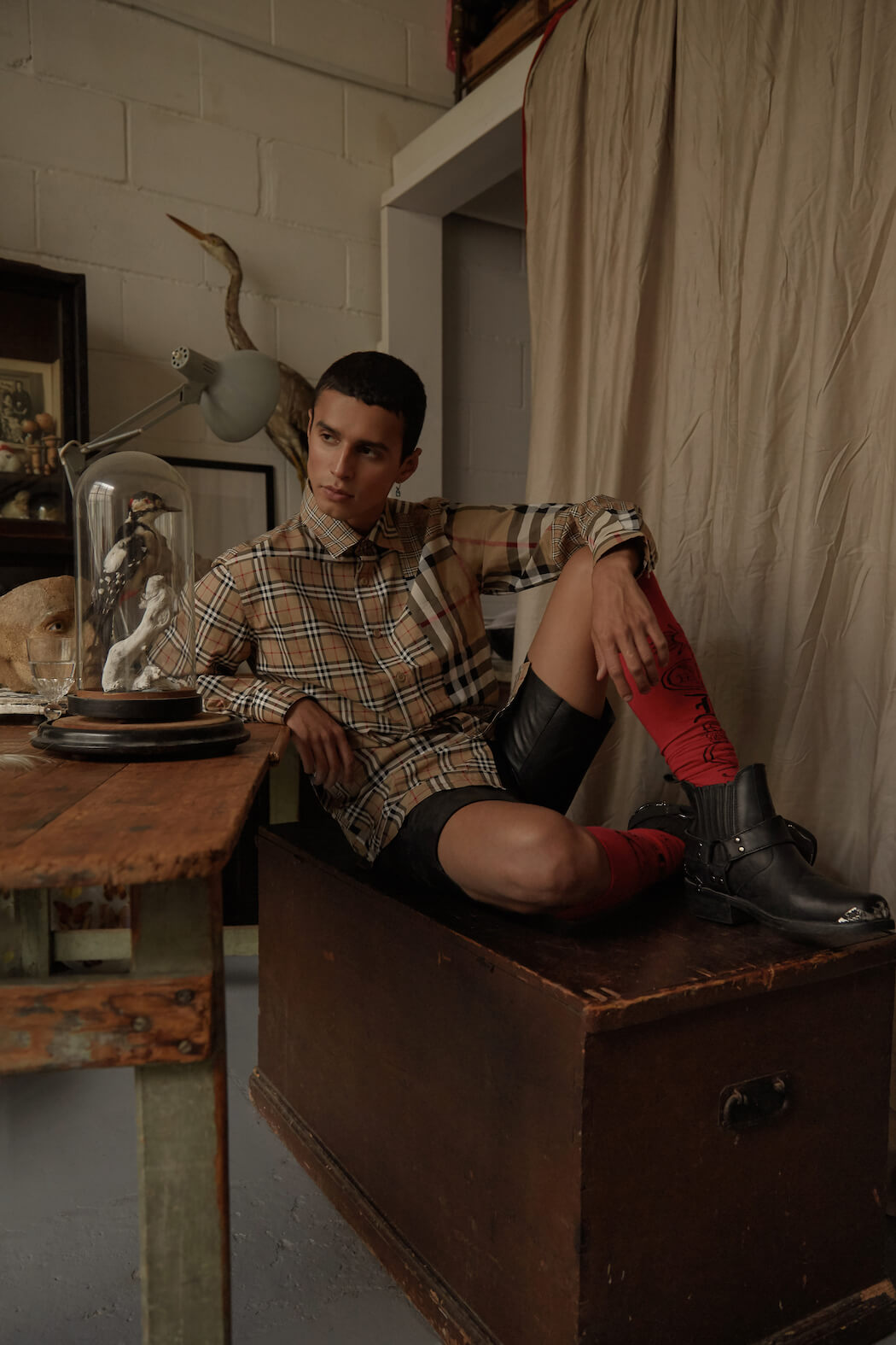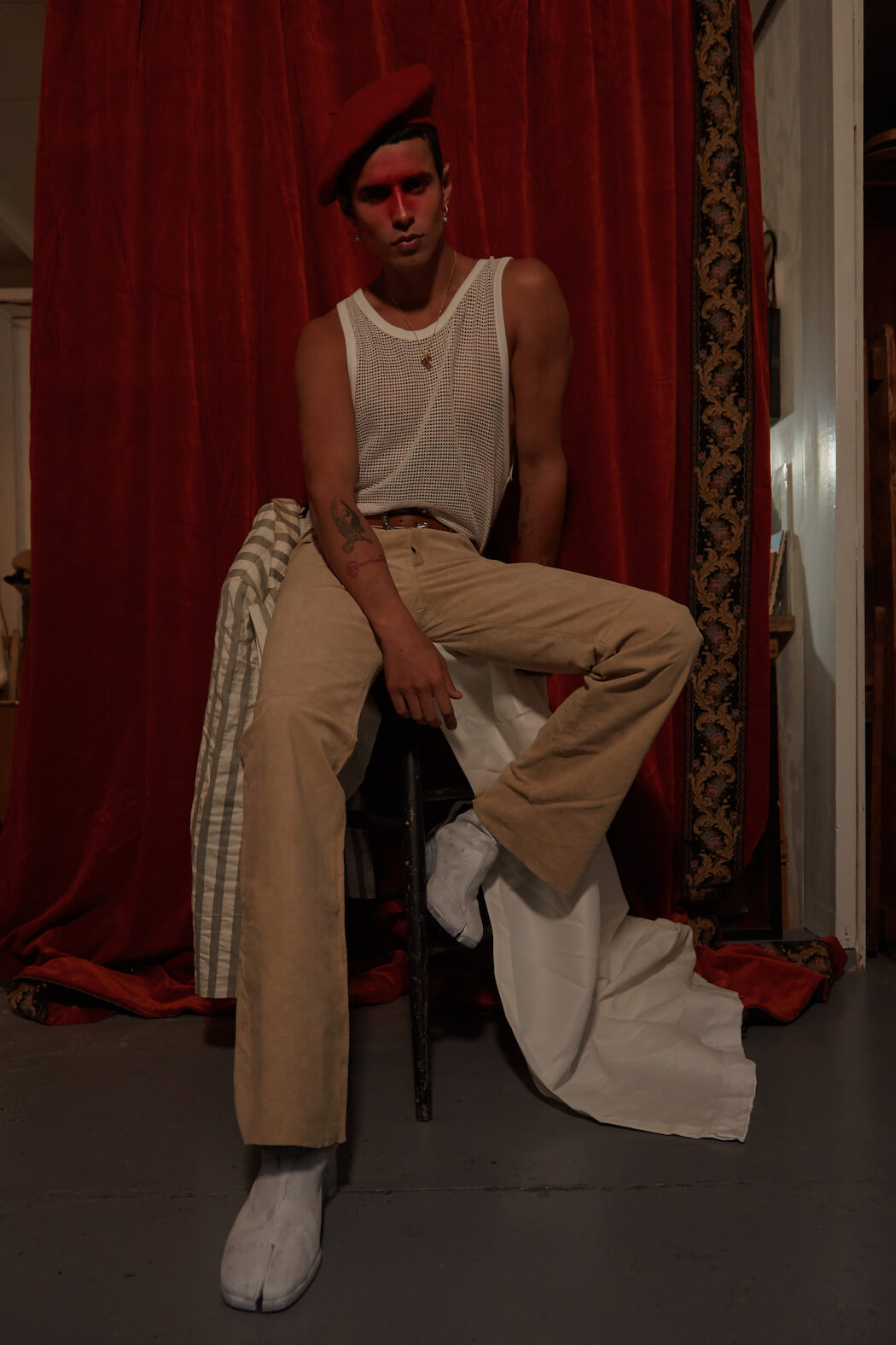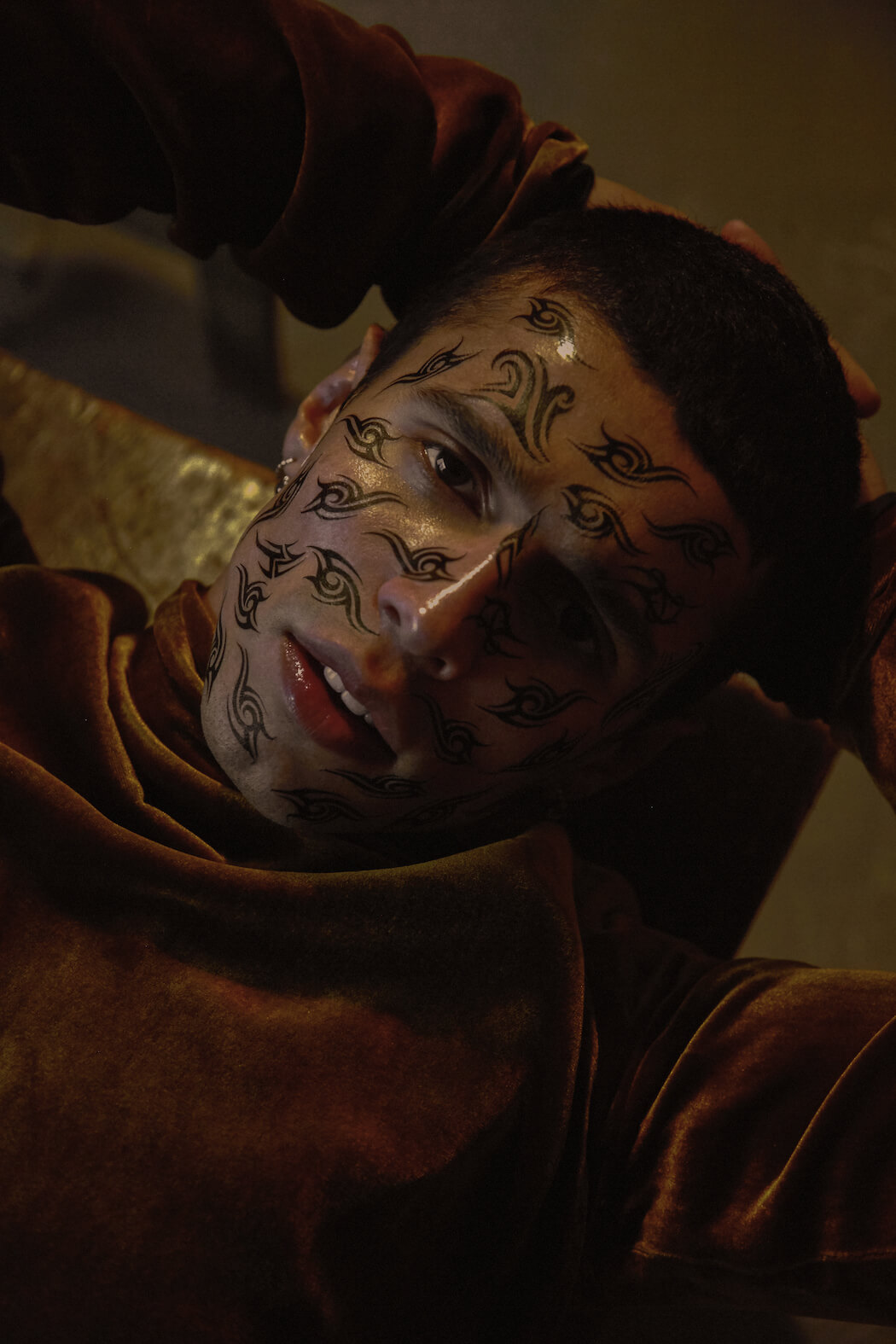 A KALTBLUT exclusive menswear editorial. Photography by Panna Donka. Styling, Set design by Gergely Erdei. Model is Ace signed at KULT models. Make up by Eszter Magyar. The series was inspired by being quarantined in the Cabinet of curiosities, where you can challenge all your inner personalities by playing around with all the found treasures. Like most of my work this editorial also reflects on modern masculinity and male femininity. The team used brands with a similar aesthetic, like Burberry, Maison Margiela, Charles Jeffrey, Ludovic de Saint Sernin.