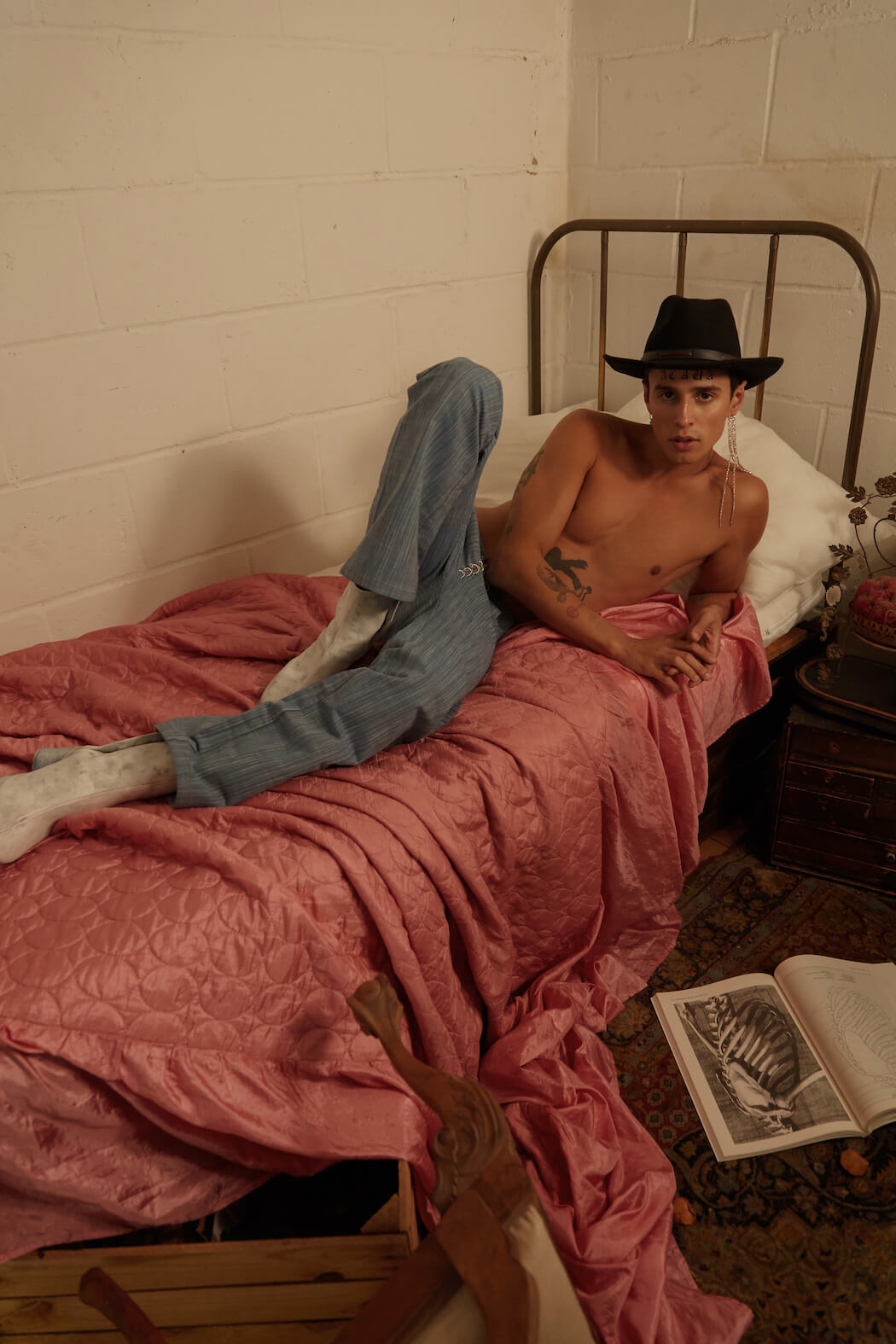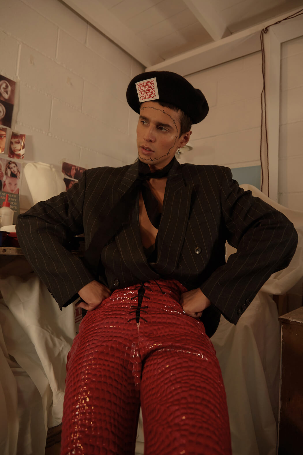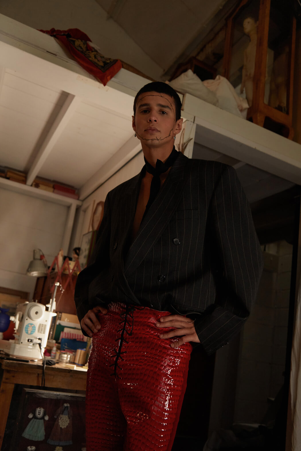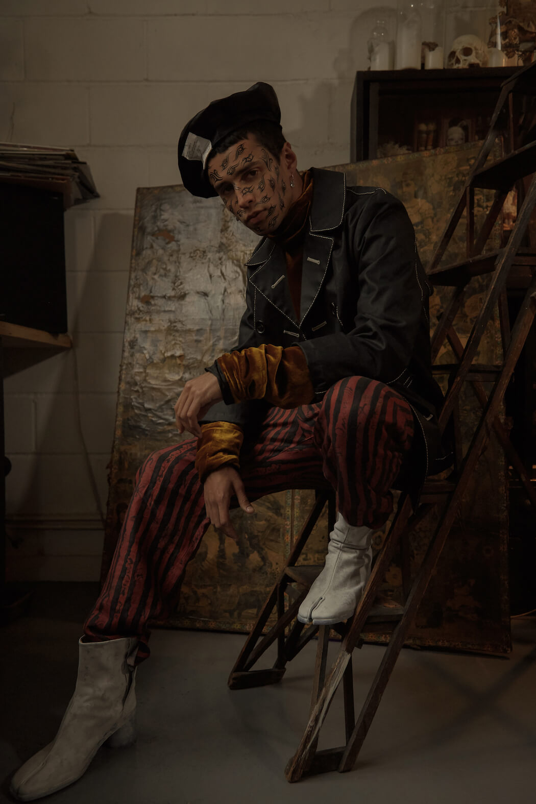 A KALTBLUT exclusive menswear editorial. Photography by Panna Donka. Styling, Set design by Gergely Erdei. Model is Ace signed at KULT models. Make up by Eszter Magyar. The series was inspired by being quarantined in the Cabinet of curiosities, where you can challenge all your inner personalities by playing around with all the found treasures. Like most of my work this editorial also reflects on modern masculinity and male femininity. The team used brands with a similar aesthetic, like Burberry, Maison Margiela, Charles Jeffrey, Ludovic de Saint Sernin.