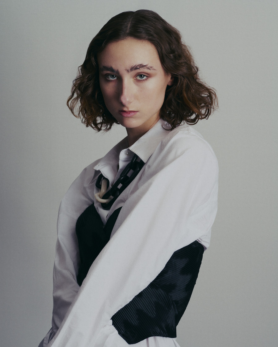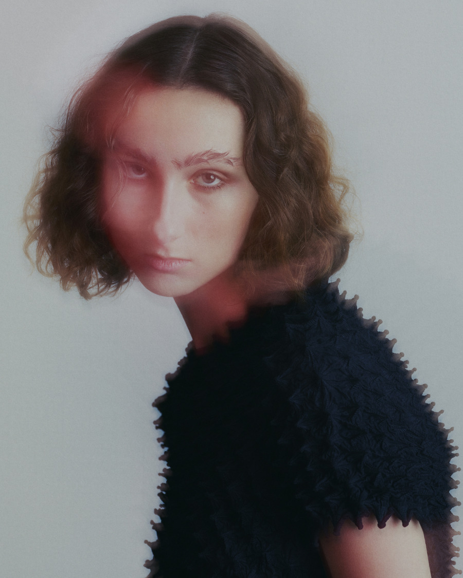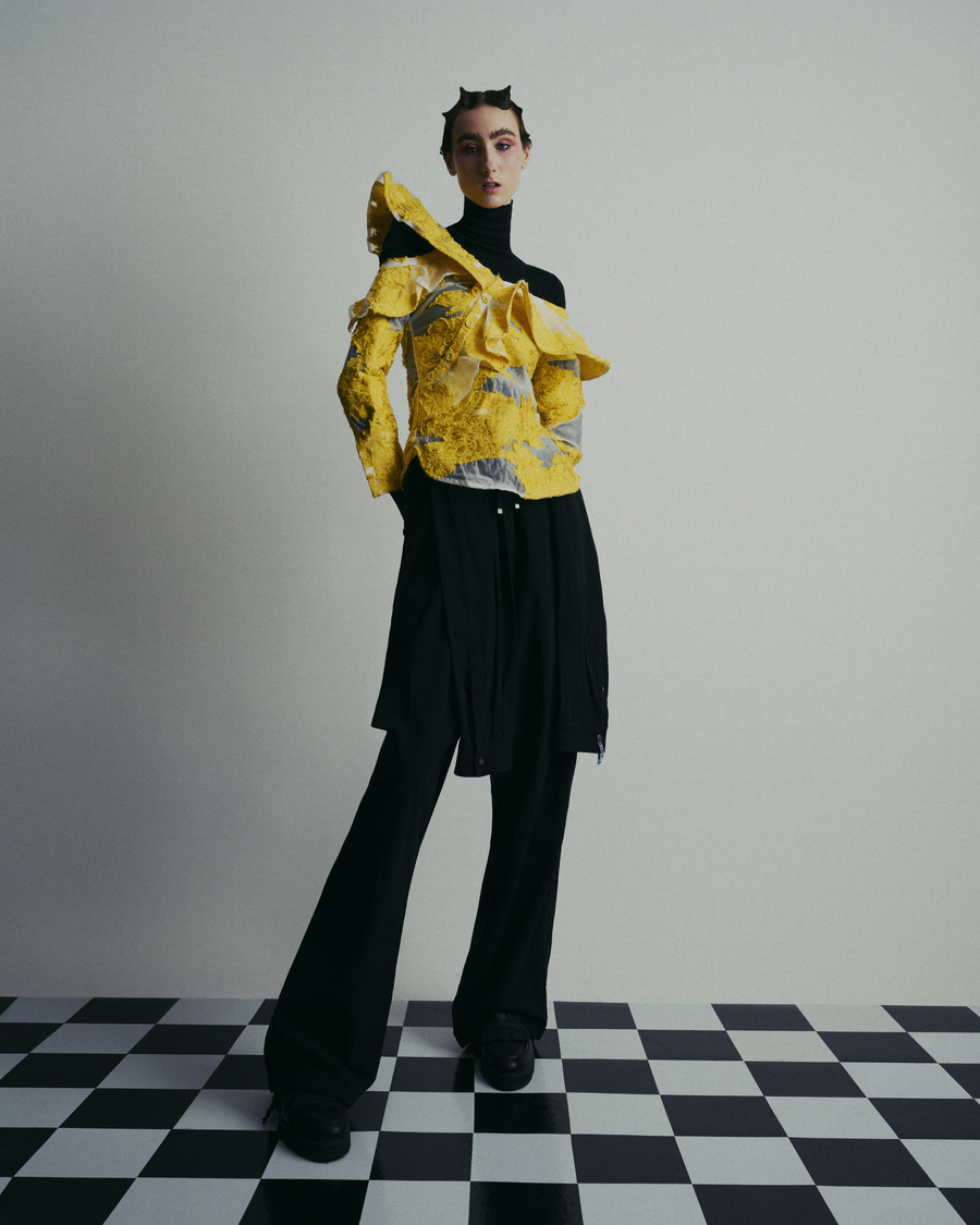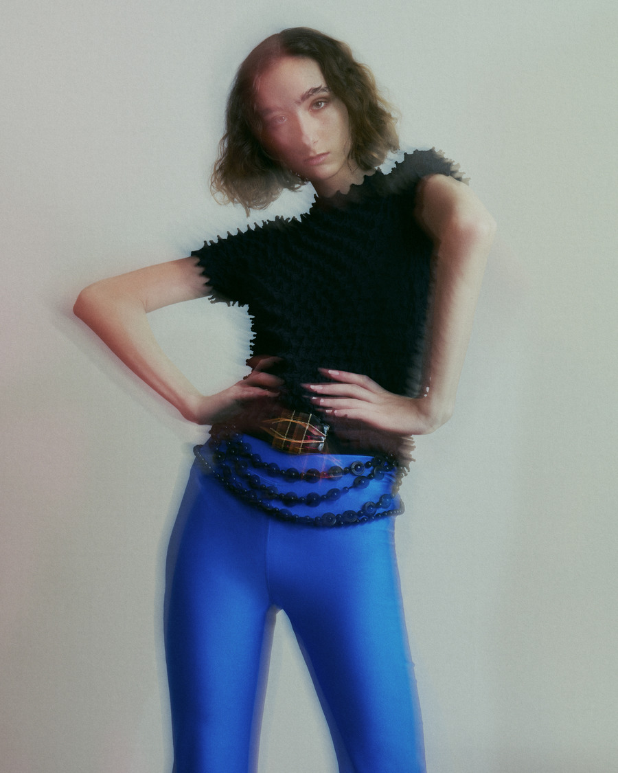 Photographer Gustavo Chams captured Alex Degrazio signed at Family Mgmt for a KALTBLUT exclusive. Styling by Keiichiro Hara. Make up by Rio Translado. Hair by Janis Bekkering. Brands used are Self Portrait, Cos, Mihara Yasuhiro, Pikolinos, Our Legacy, Sunnei, Ateliers, Doublet, Filippa K, Raf Simons, Hyein Seo, Issey Miyake, Maje, Dm’s × Undercover, Laperla, Alexander Wang, Feng Chen Wang, Dm’s × Our Legacy Work Shop, Rui, Shoe The Bear.