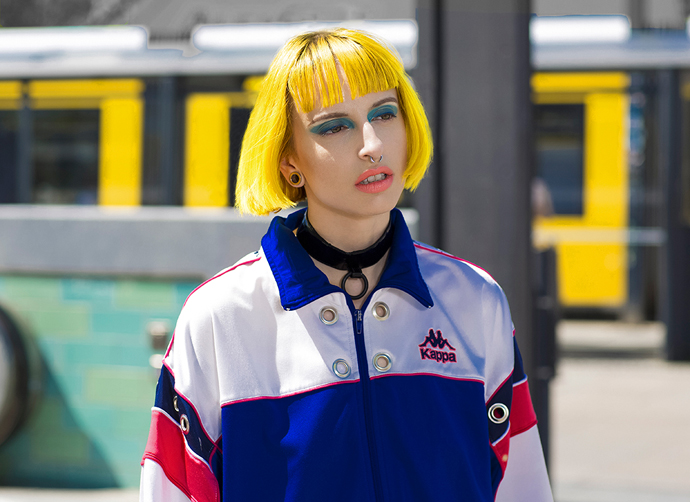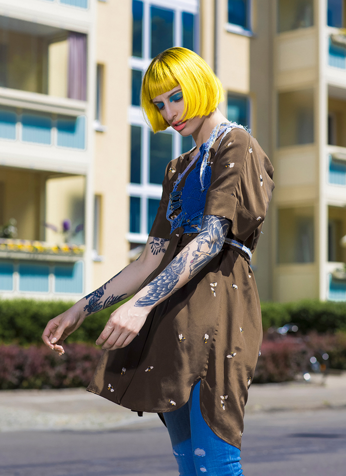 Trucker dress by Wrangler Plastic, bloody choker by Arbeit Tötet Blue long dress by Raquel Gladly Heart and eye pin by Arbeit Tötet Black shiny biker jacket with belt by Mint&Berry Orange hoodie by Adidas, Originals Trucker dress by Wrangler, Transparent clip on orange sunglasses by YUN White sheer crop hoodie by Urban Outfitters Upsize black jacket by Cheap Monday, Black trousers by Black Pistol Tenella, pearl basecap by Steinrohner Macilenta black body by Steinrohner Denim bra with metallic O-ring by Therapy Recycle+Exorcise ,Leather collar by Therapy Recycle+Exorcise Vintage sweatshirt by Kappa customized by Therapy Recycle+Exorcise, PVC black choker with black o-ring by Arbeit Tötet Midi brown silk dress with bees print by Stine Goya, Jeans harness by Therapy Recycle+Exorcise, Boot cut blue jeans by Le Temps Des Cerise’s White sheet crop hoodie by Urban Outfitters, Upsize black jacket by Cheap Monday, Tenella pearl basecap by Steinrohner