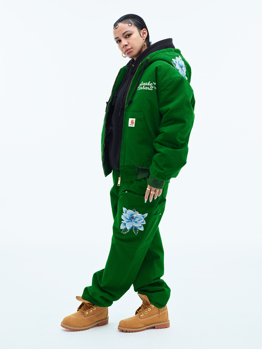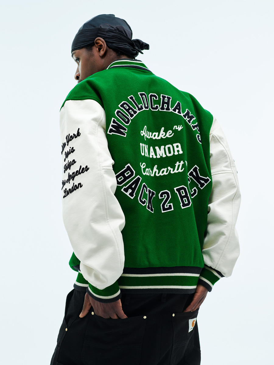 Archetypal Carhartt WIP items in the brand’s Dearborn Canvas, like the OG Active Jacket, have been reworked to feature embroidered co-branding and Awake NY’s painterly floral motifs. This recurring graphic has been applied to the Awake NY Double Knee Pant and Hooded Sweatshirt, as well as the varsity-inspired Teddy Jacket, which features faux-leather sleeves, graphic patches and embroidered lettering.
