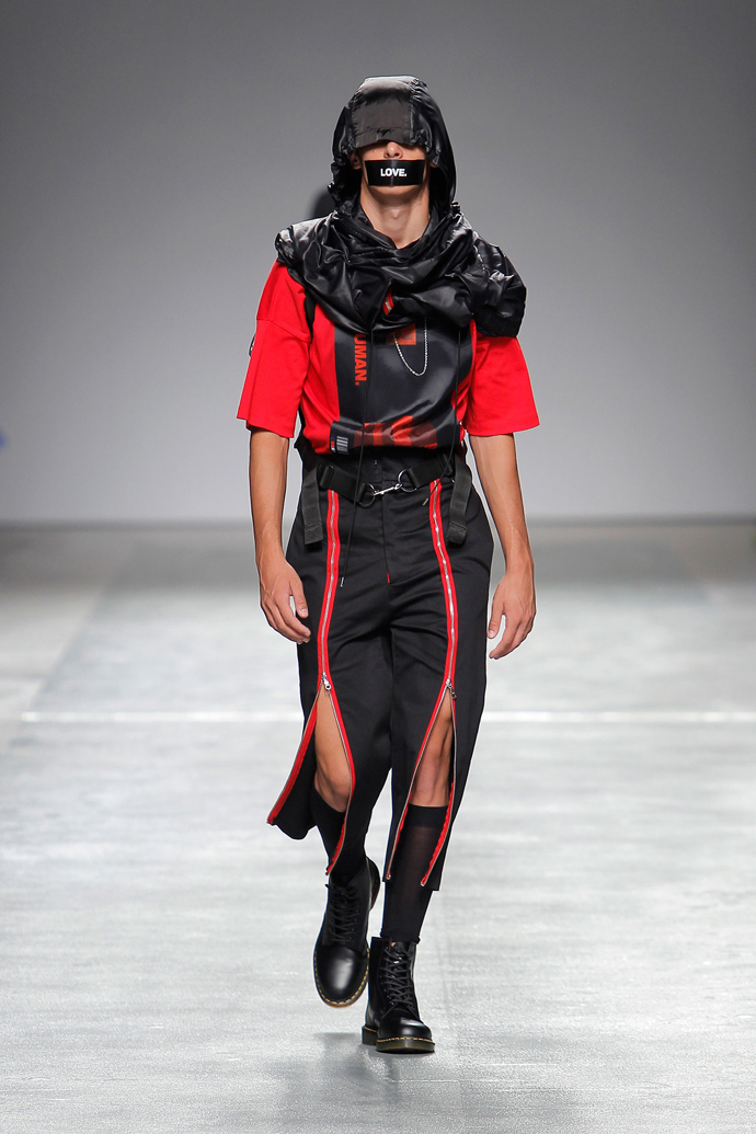 #OneToWatch from Sangue Novo at ModaLisboa. May I introduce you to my favorite collection from the Sangue Novo section of the fashion fest in Lisbon? Designer Carla Campos, born in 1992,unveiled a stunning menswear collection. A perspective about the emotional spectrum of Being Human. A self-portrait together with a vision about society to emphasize the importance of feeling. Being, in a mechanized, numb and masked world. Where the genuine sinks, and ‘perfection’ overlaps ‘human failures’. “Human” takes shape in a male collection influenced by the essence of streetwear / sportwear of urban tribes in 90’s. The oversized shapes and zippers are the key details, an analogy to the openness vs. emotional concealment that we have before others. Together with the printed photograph, which expresses 6 emotional moods.