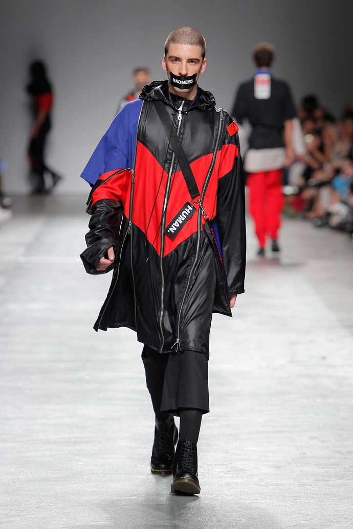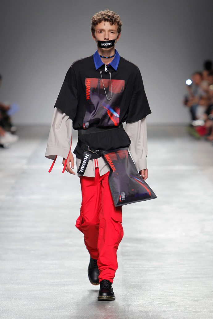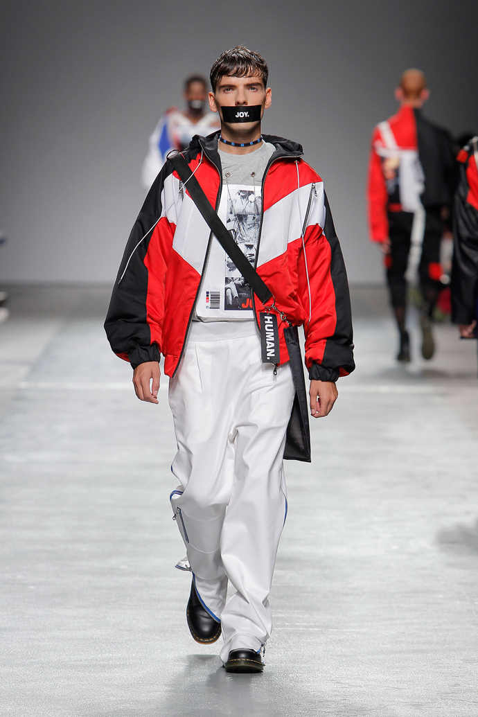 #OneToWatch from Sangue Novo at ModaLisboa. May I introduce you to my favorite collection from the Sangue Novo section of the fashion fest in Lisbon? Designer Carla Campos, born in 1992,unveiled a stunning menswear collection. A perspective about the emotional spectrum of Being Human. A self-portrait together with a vision about society to emphasize the importance of feeling. Being, in a mechanized, numb and masked world. Where the genuine sinks, and ‘perfection’ overlaps ‘human failures’. “Human” takes shape in a male collection influenced by the essence of streetwear / sportwear of urban tribes in 90’s. The oversized shapes and zippers are the key details, an analogy to the openness vs. emotional concealment that we have before others. Together with the printed photograph, which expresses 6 emotional moods.