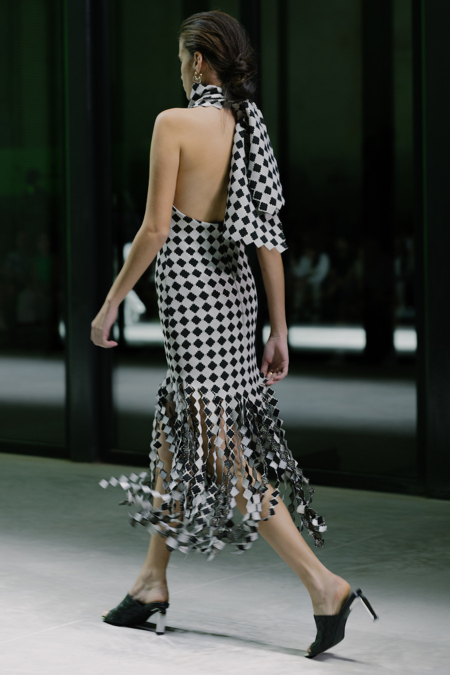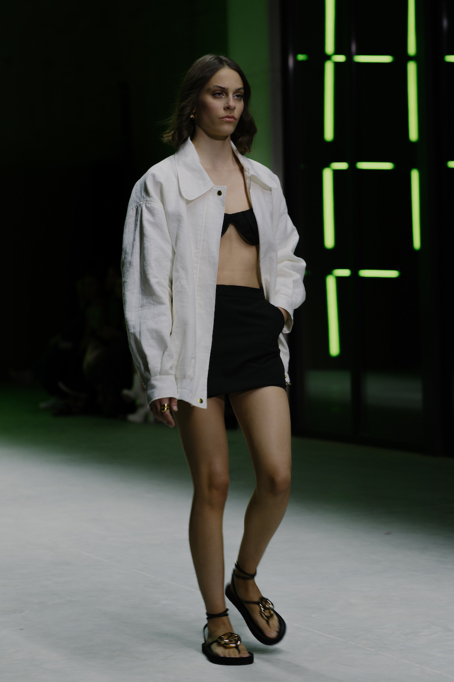 Knitted pieces punctuate the collection, silhouettes contrast in height and the materials are natural and/or sustainable, such as linen, organic cotton, recycled polyester and synthetic leather in beige, black, white, brown and silver.