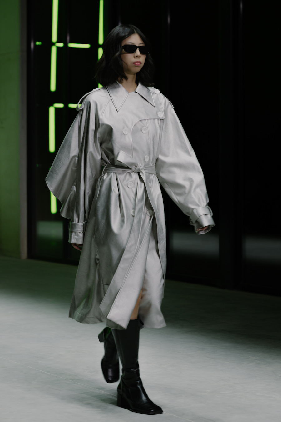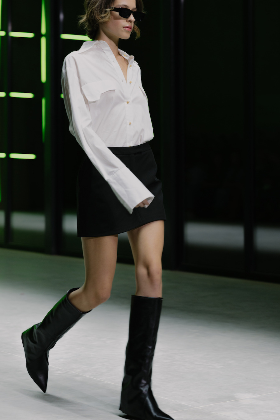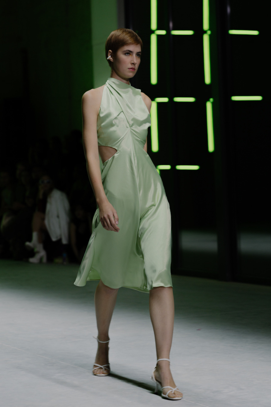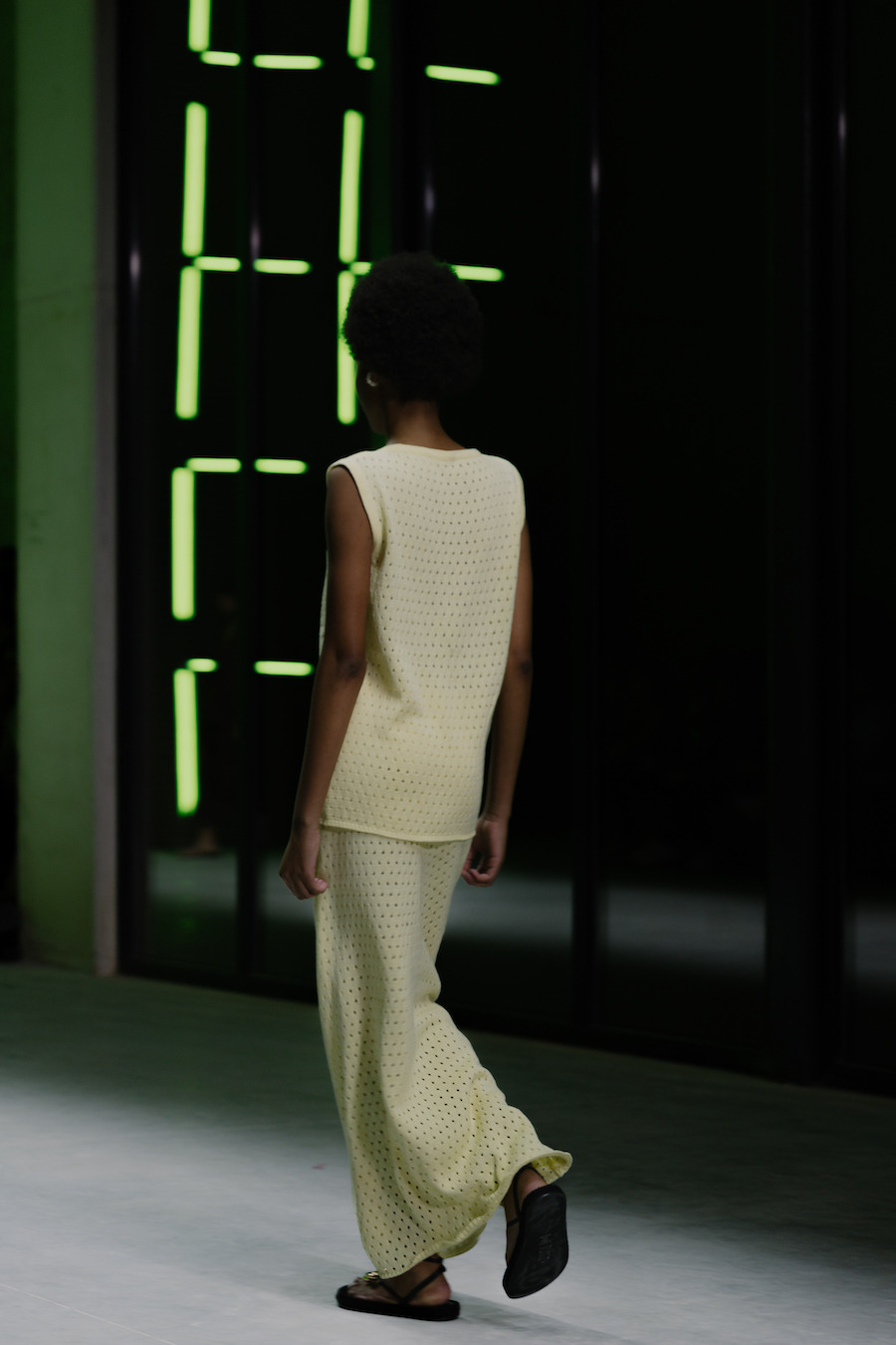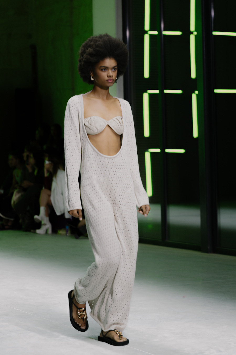 Knitted pieces punctuate the collection, silhouettes contrast in height and the materials are natural and/or sustainable, such as linen, organic cotton, recycled polyester and synthetic leather in beige, black, white, brown and silver.