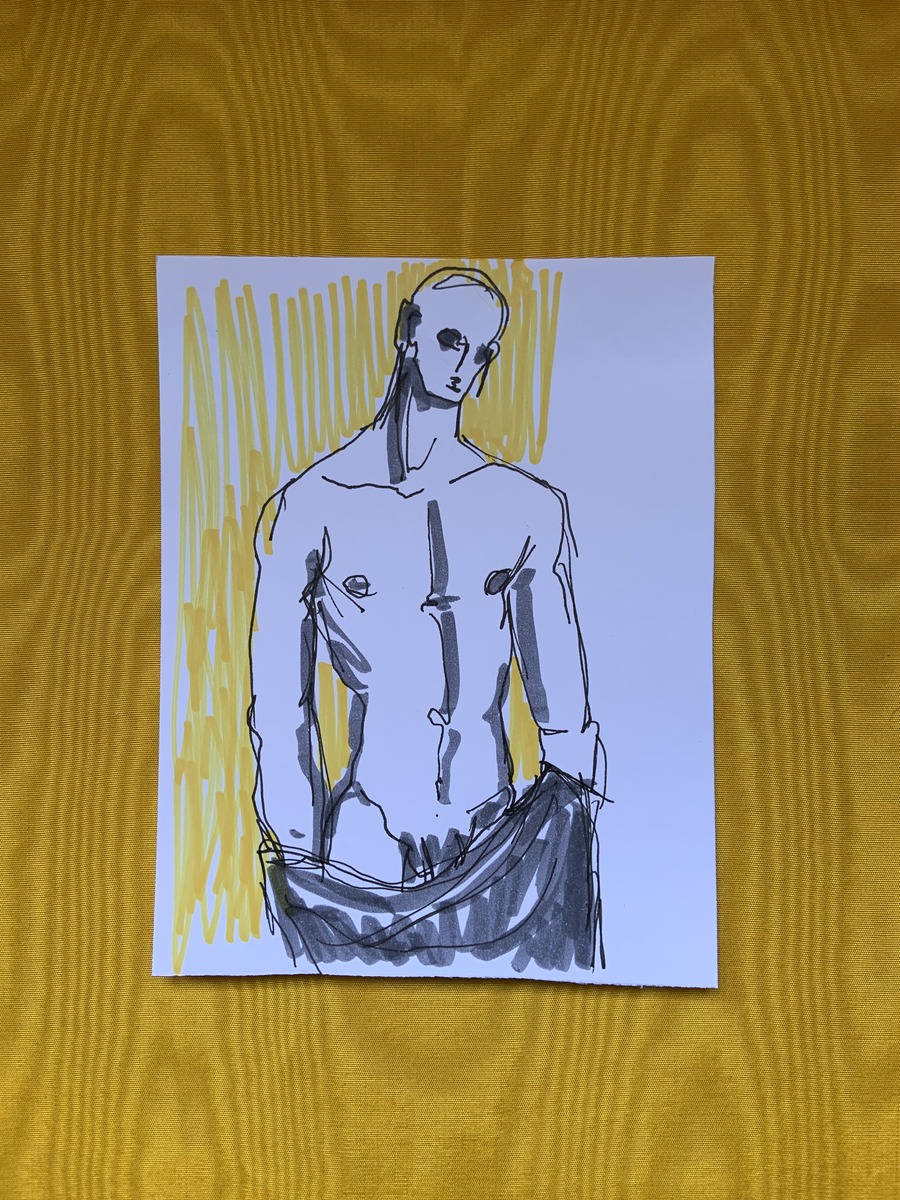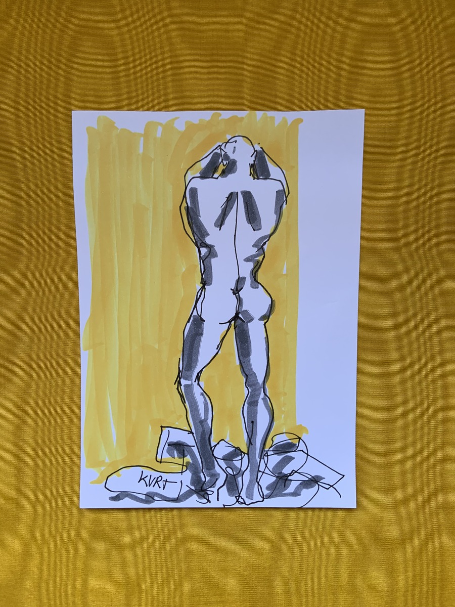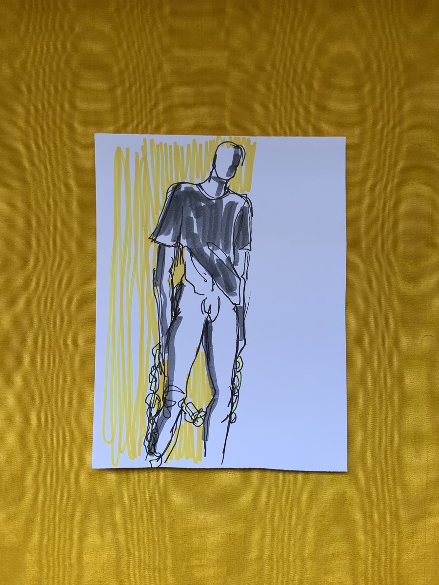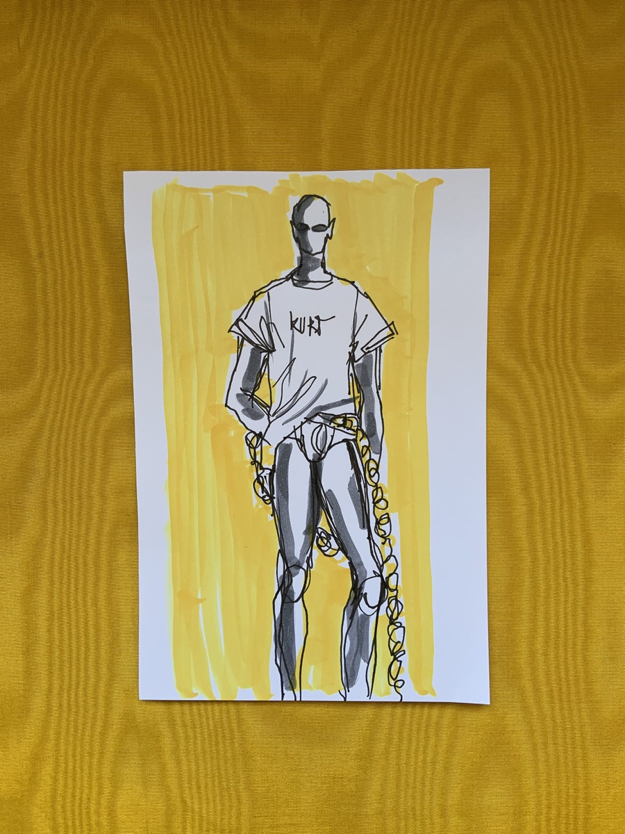 Inspired instantly by the diverse collection curated by KURT, Benjamin swiftly derived two creative elements that would weave seamlessly into his work—a vibrant yellow hue and the representation of a metal chain. Before immersing himself in the photoshoot, the dedicated artist meticulously sketched his vision. Upon reviewing these initial sketchings, KURT responded eagerly with an emphatic “yes!”—their shared vision resolutely aligning.