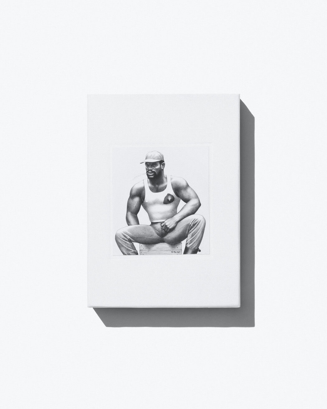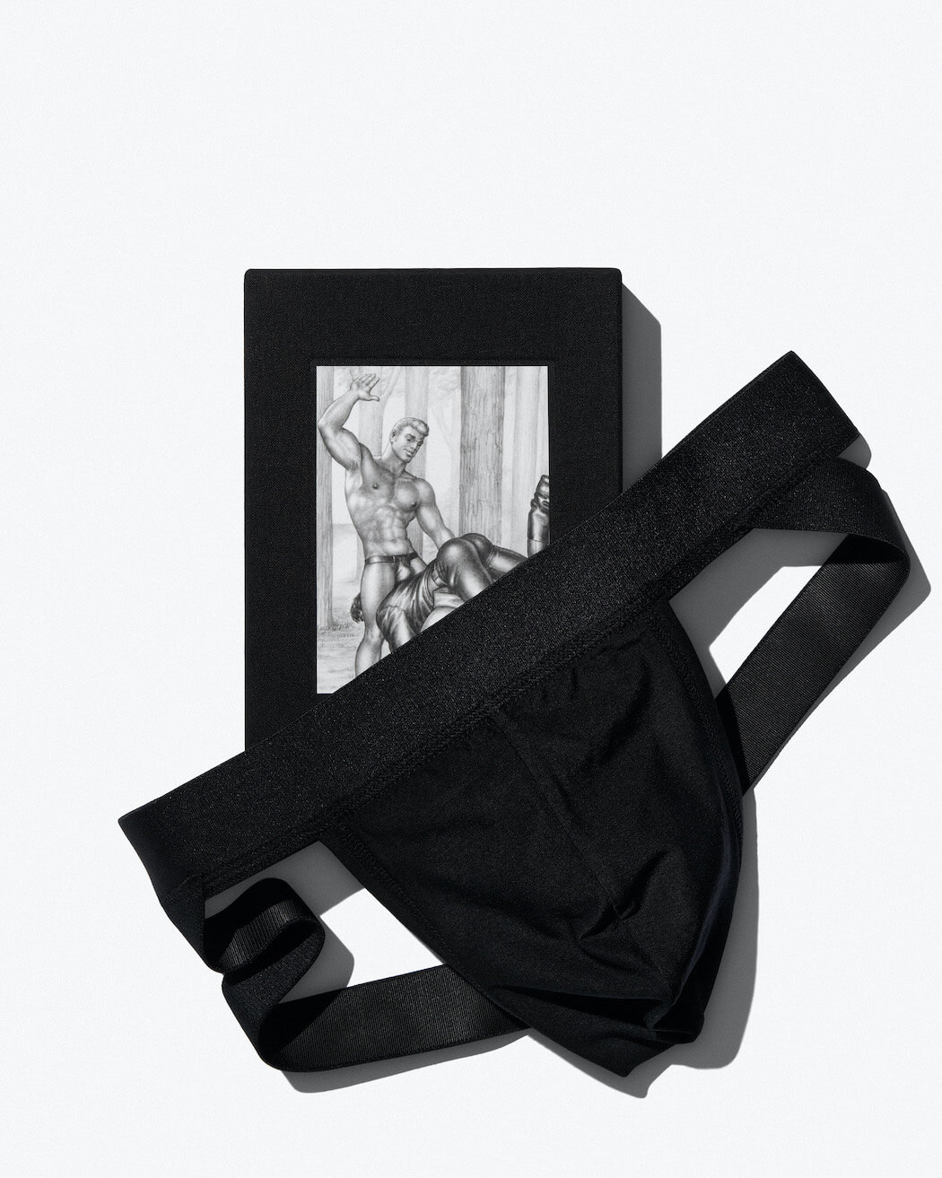The packaging for both styles was custom designed in-house. The Jock Strap is presented in a black cotton covered box. An outer sleeve with a suggestive circle cut-out is removed to reveal the inspiration artwork inset. The Tank Top packaging follows suit with a white lacquered sleeve removed to reveal a white cotton covered box with inspiration artwork inset. Internally, both boxes are lined with some of Tom’s most sensuous, iconic work.