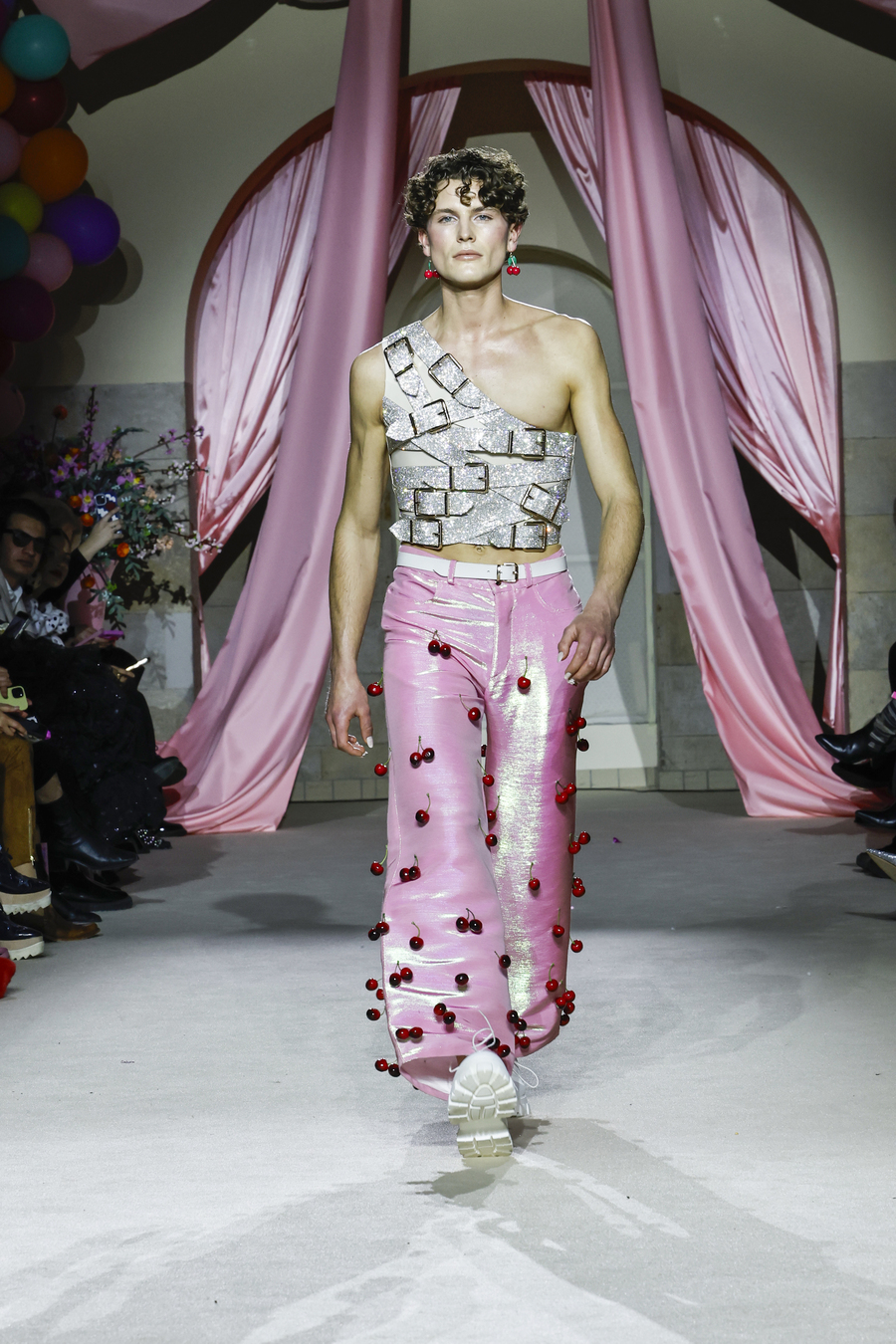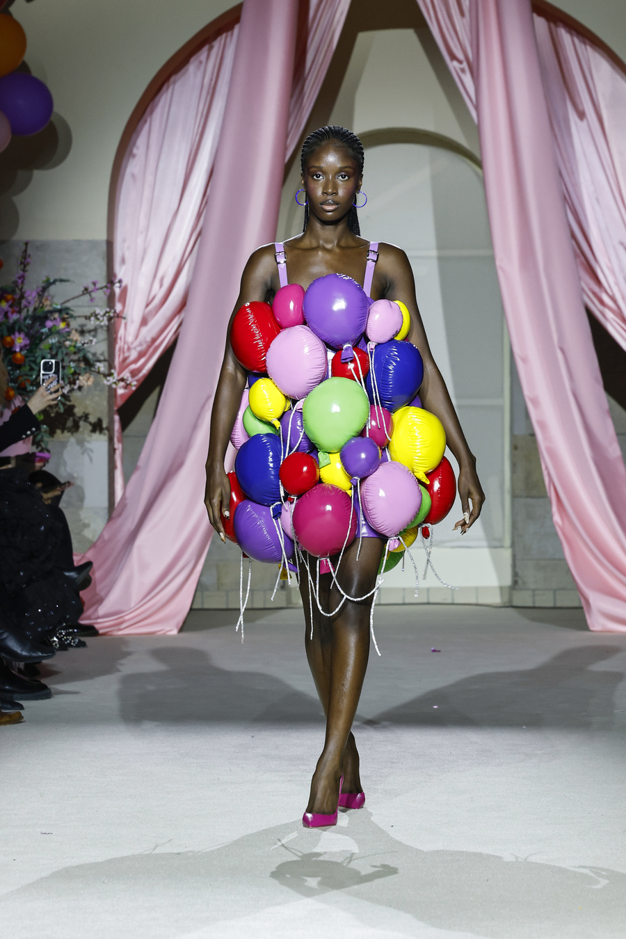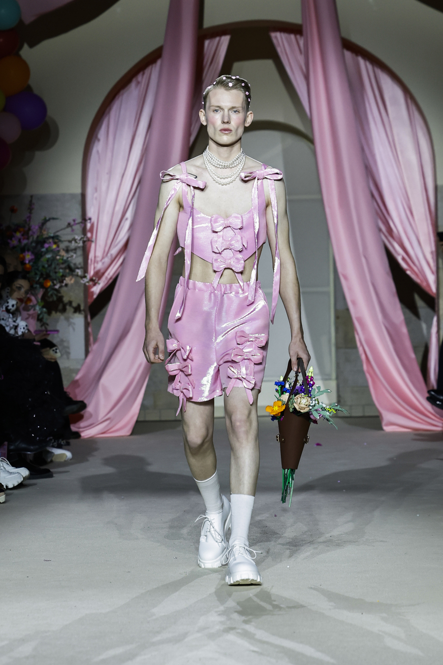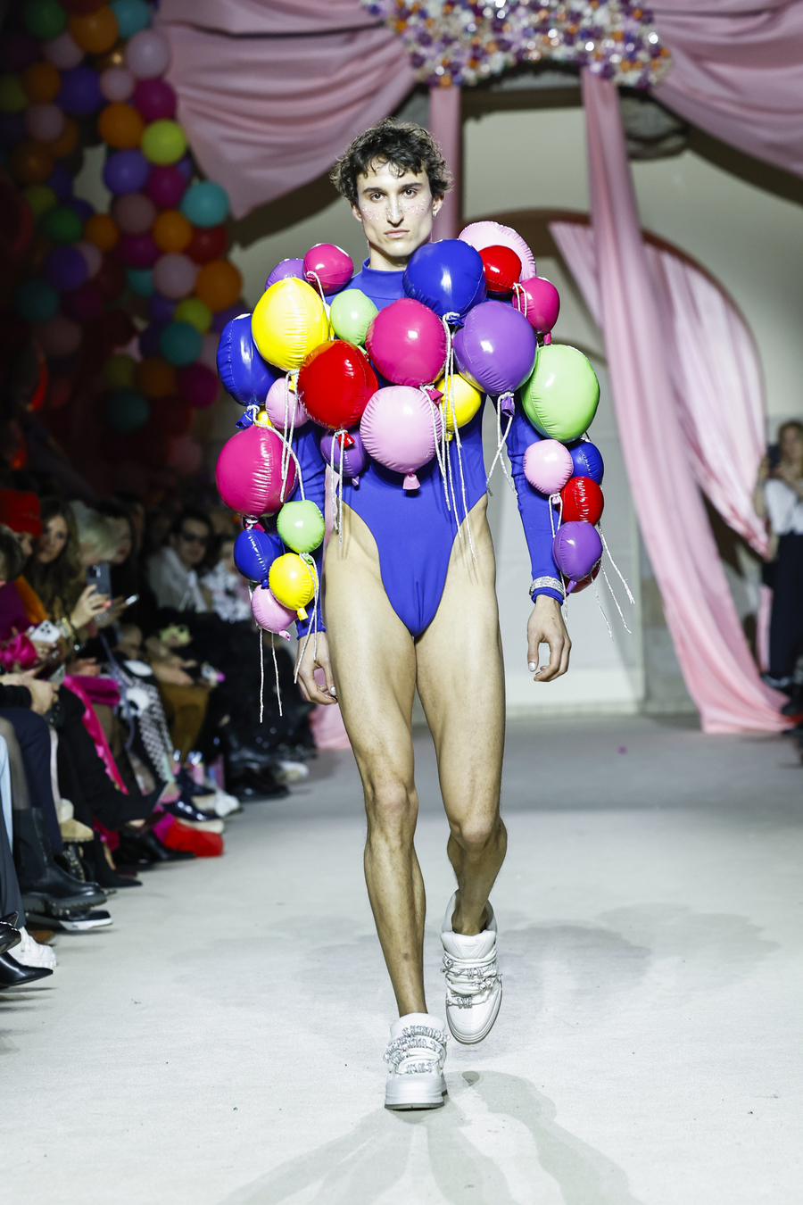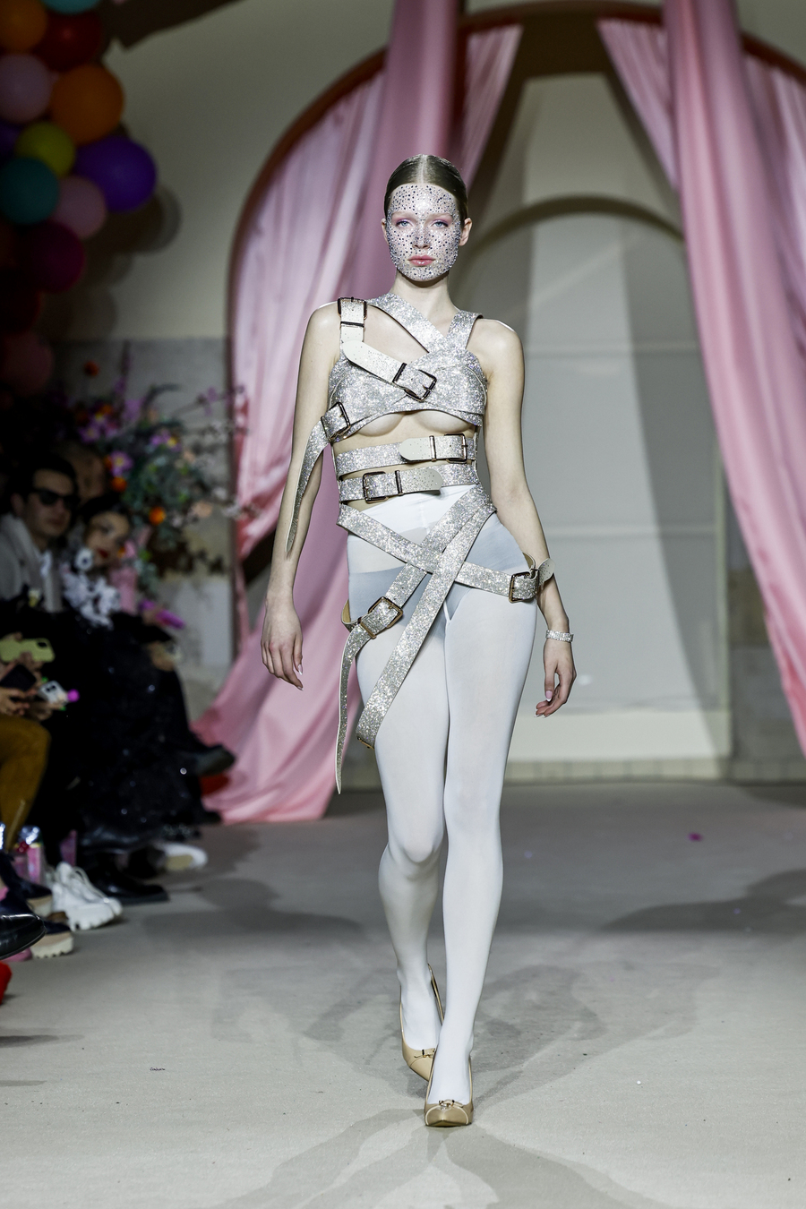 The designs incorporate whimsical elements such as vegan leather balloons, oversized bows, colourful flowers, and playful googly eyes, evoking a nostalgic sense of joy and carefree happiness. Glittering rhinestones add a festive touch, while surreal accents seamlessly blend with urban sophistication. Dark, Berlin-inspired features like sharp silhouettes, exaggerated shoulders, and fetish-style belts inject a bold, modern energy, achieving a unique balance of contrasting influences.