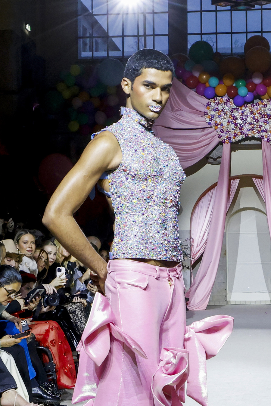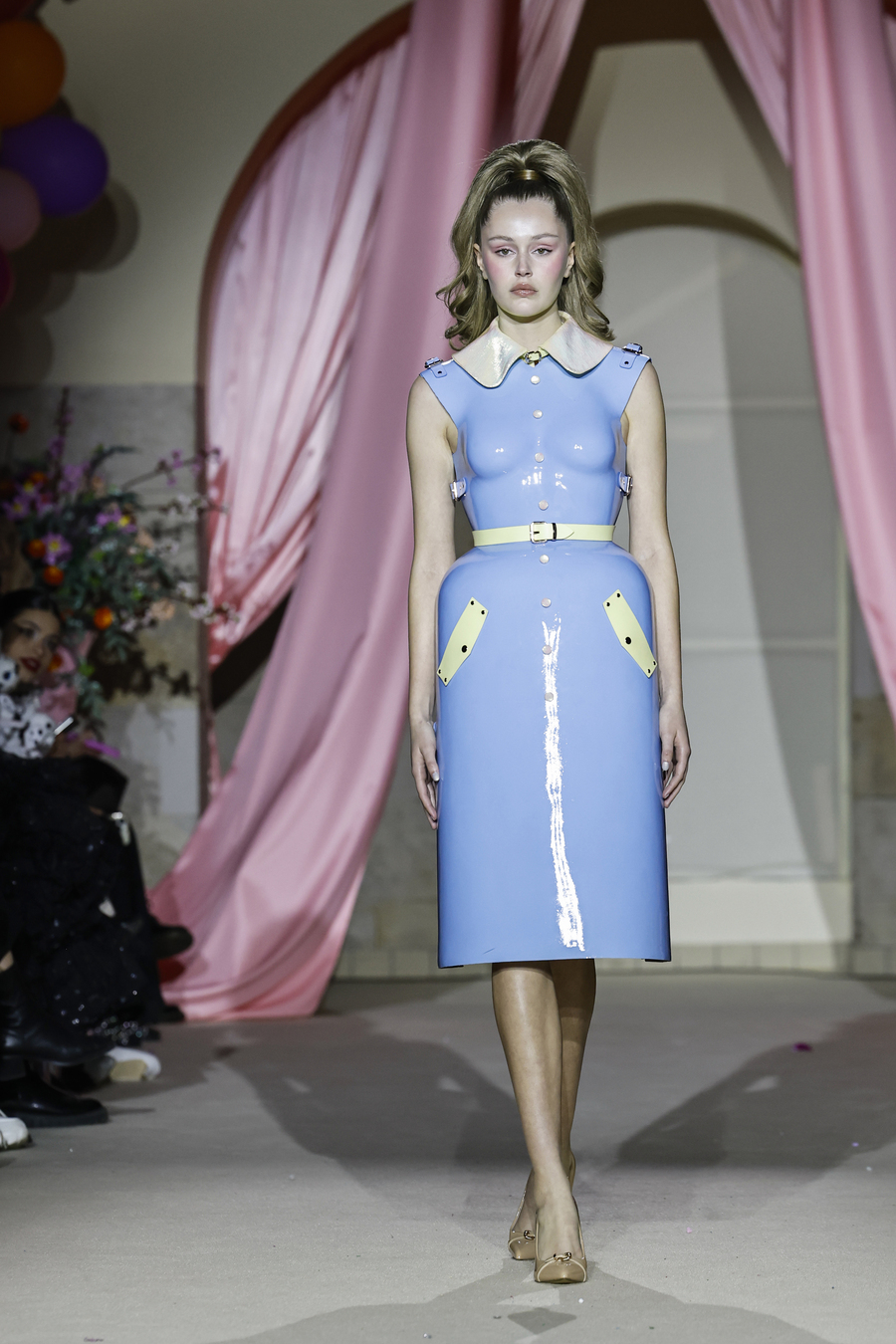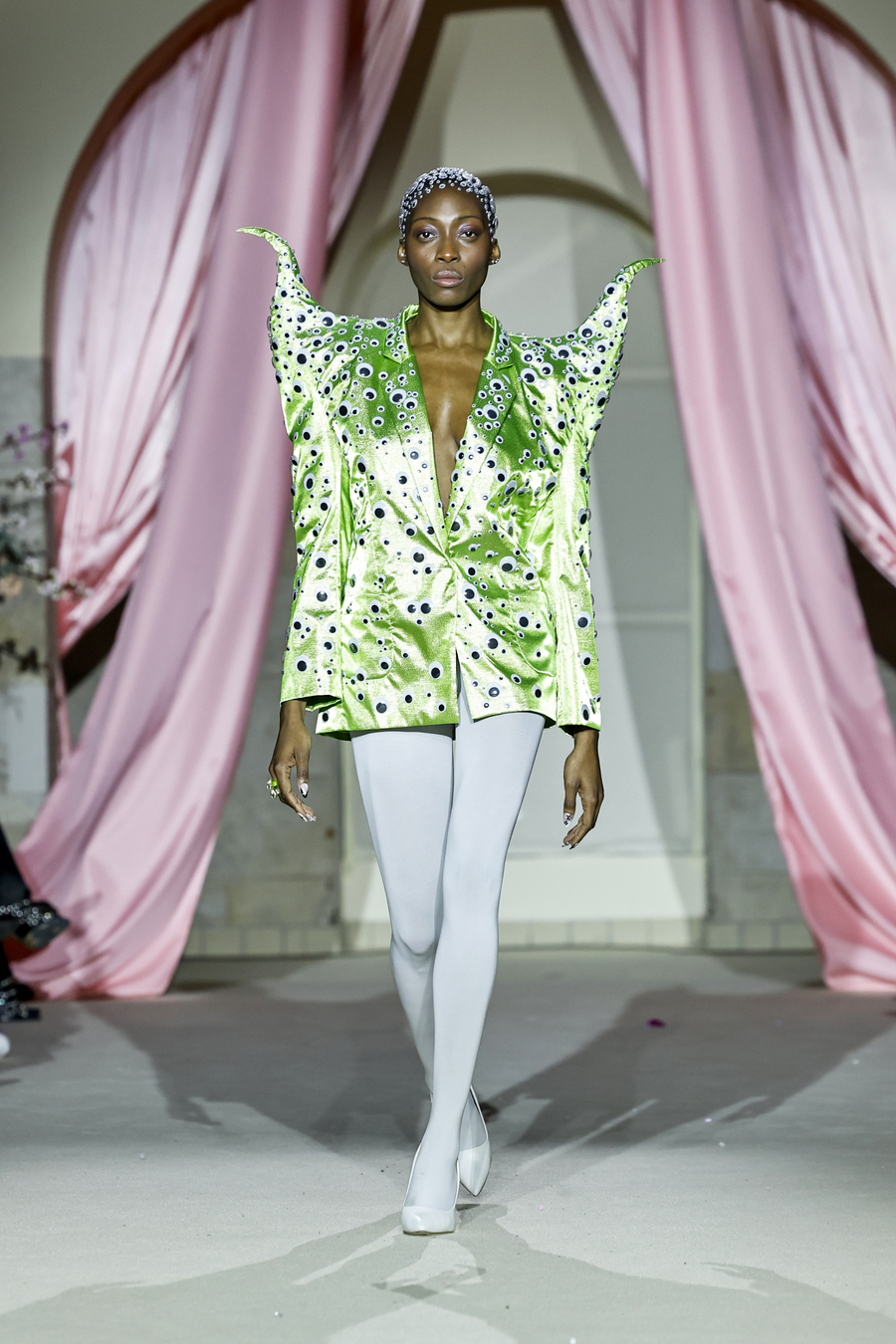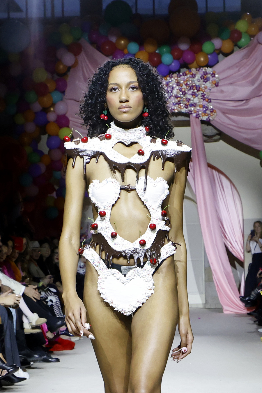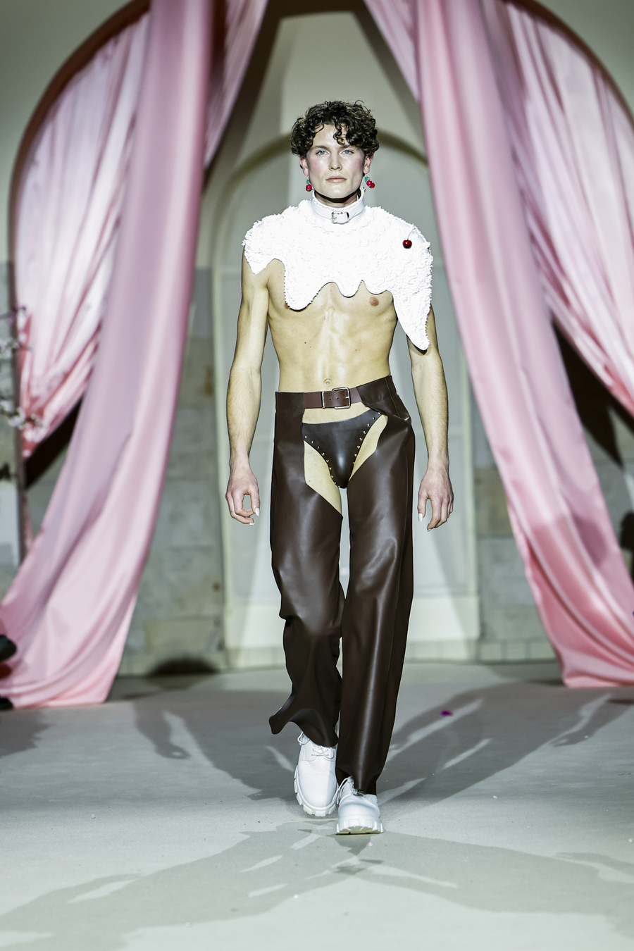 The designs incorporate whimsical elements such as vegan leather balloons, oversized bows, colourful flowers, and playful googly eyes, evoking a nostalgic sense of joy and carefree happiness. Glittering rhinestones add a festive touch, while surreal accents seamlessly blend with urban sophistication. Dark, Berlin-inspired features like sharp silhouettes, exaggerated shoulders, and fetish-style belts inject a bold, modern energy, achieving a unique balance of contrasting influences.