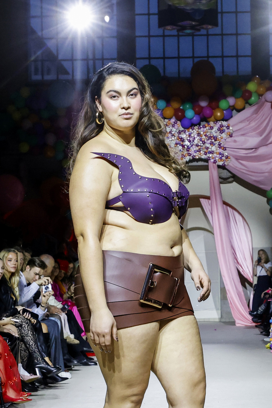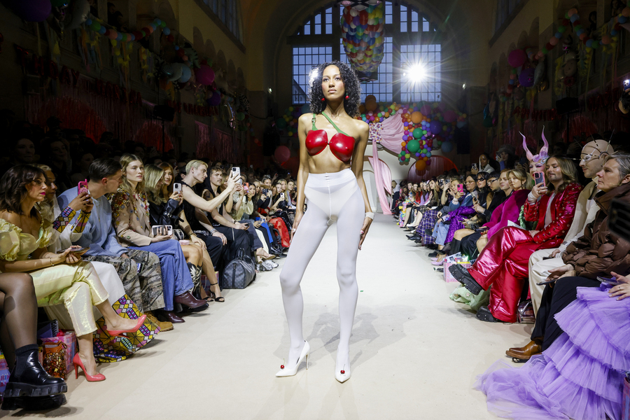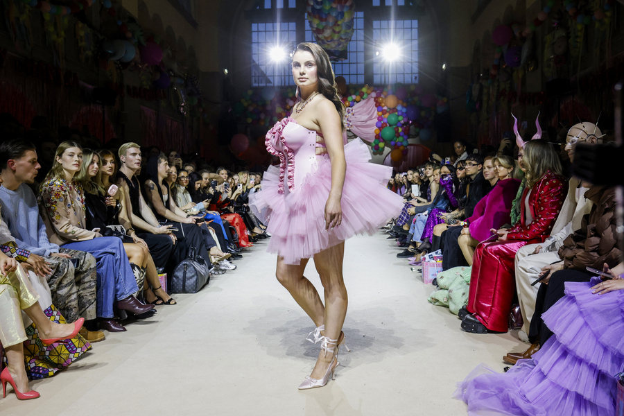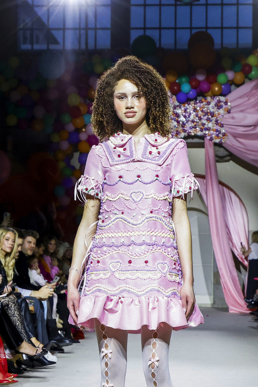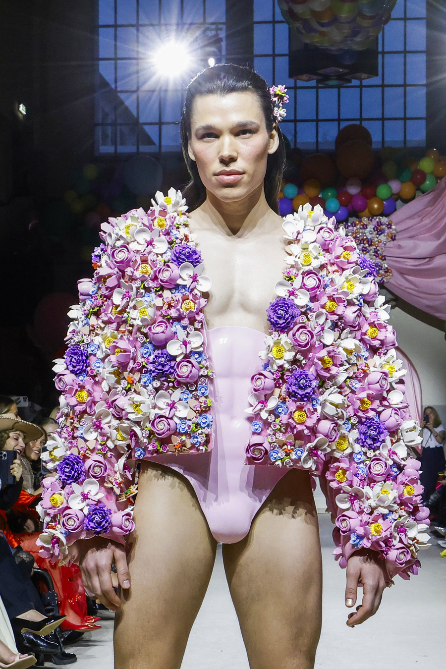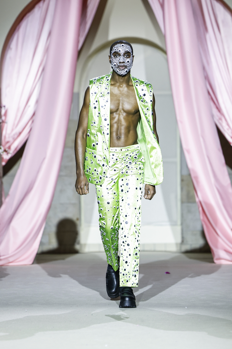 The designs incorporate whimsical elements such as vegan leather balloons, oversized bows, colourful flowers, and playful googly eyes, evoking a nostalgic sense of joy and carefree happiness. Glittering rhinestones add a festive touch, while surreal accents seamlessly blend with urban sophistication. Dark, Berlin-inspired features like sharp silhouettes, exaggerated shoulders, and fetish-style belts inject a bold, modern energy, achieving a unique balance of contrasting influences.