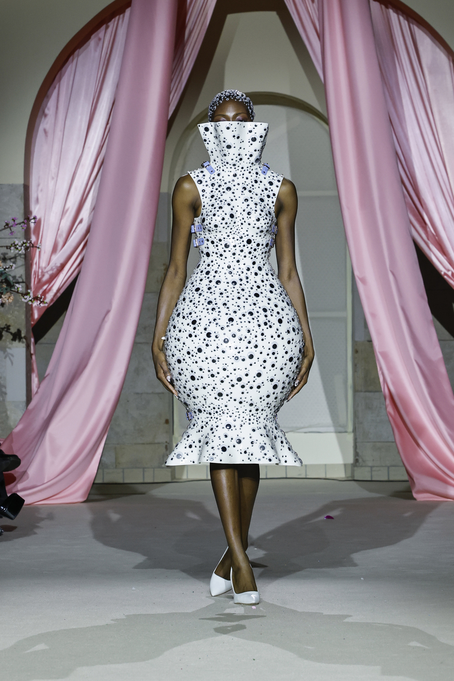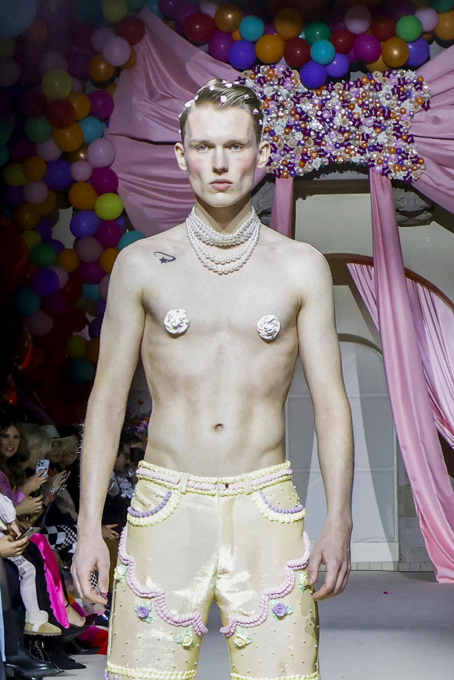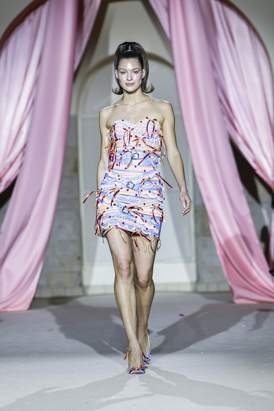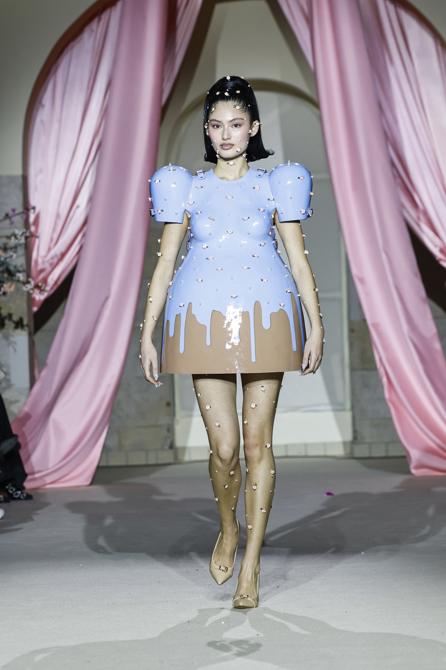 Drawing inspiration from the art of patisserie, the collection features elements like fine piping, tiny dragees, and birthday candles, transforming each piece into a wearable masterpiece. The cake vase stands out as a highlight, showcasing her exceptional craftsmanship. Textural diversity is a hallmark of the collection, with glossy organza, delicate tulle ruffles, and satin roses creating an elegant softness, while contrasting hard leather designs take on new forms, reminiscent of origami with jagged, torn edges.