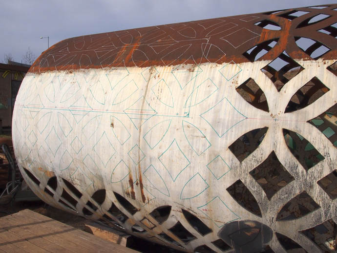 Cestmir: Over the years, I underwent various periods and tested many materials. Each of them will allow you to do something else depending on its surface, structure and size. I am interested in using traditional materials as well as technological procedures while creating something that attracts the attention of people of today. Since 2005, I have been working with steel using old scrap industrial containers. I carve openings into them inspired by everyday things, such as tablecloths, carpets, curtains, wallpapers and so on, using oxyacetylene burner or plasma. While working in this way, I found out that the patterns that inspire me are identical with the invisible structures of matter. For example, I made a big sculpture modelled on an old Grandmother’s apron and then a friend of mine sent me a photo of the structure of a carbon nanotube. They were exactly the same.