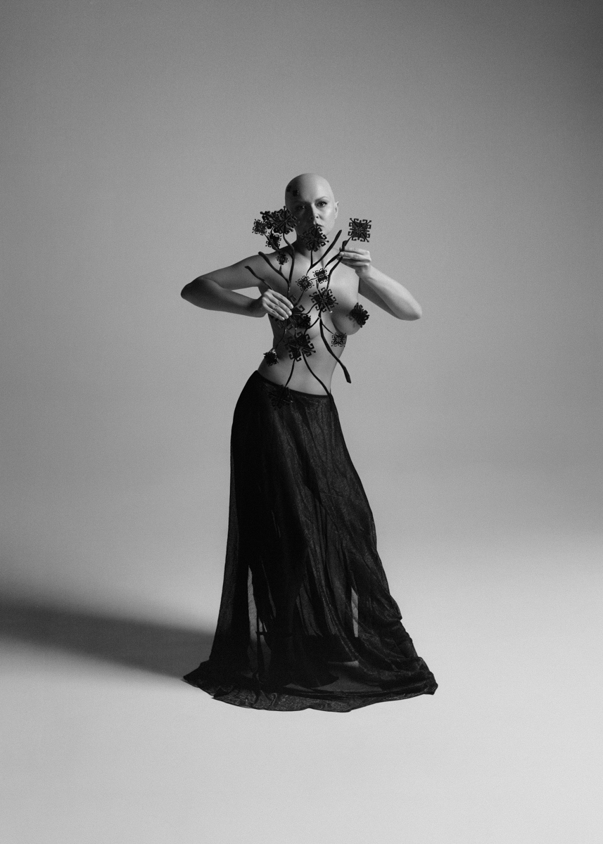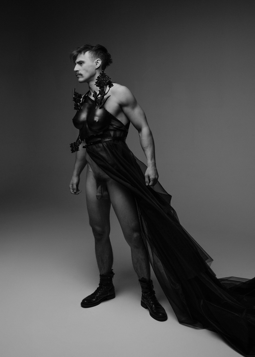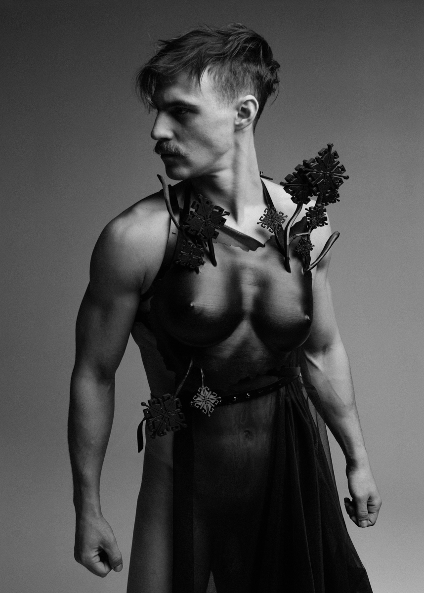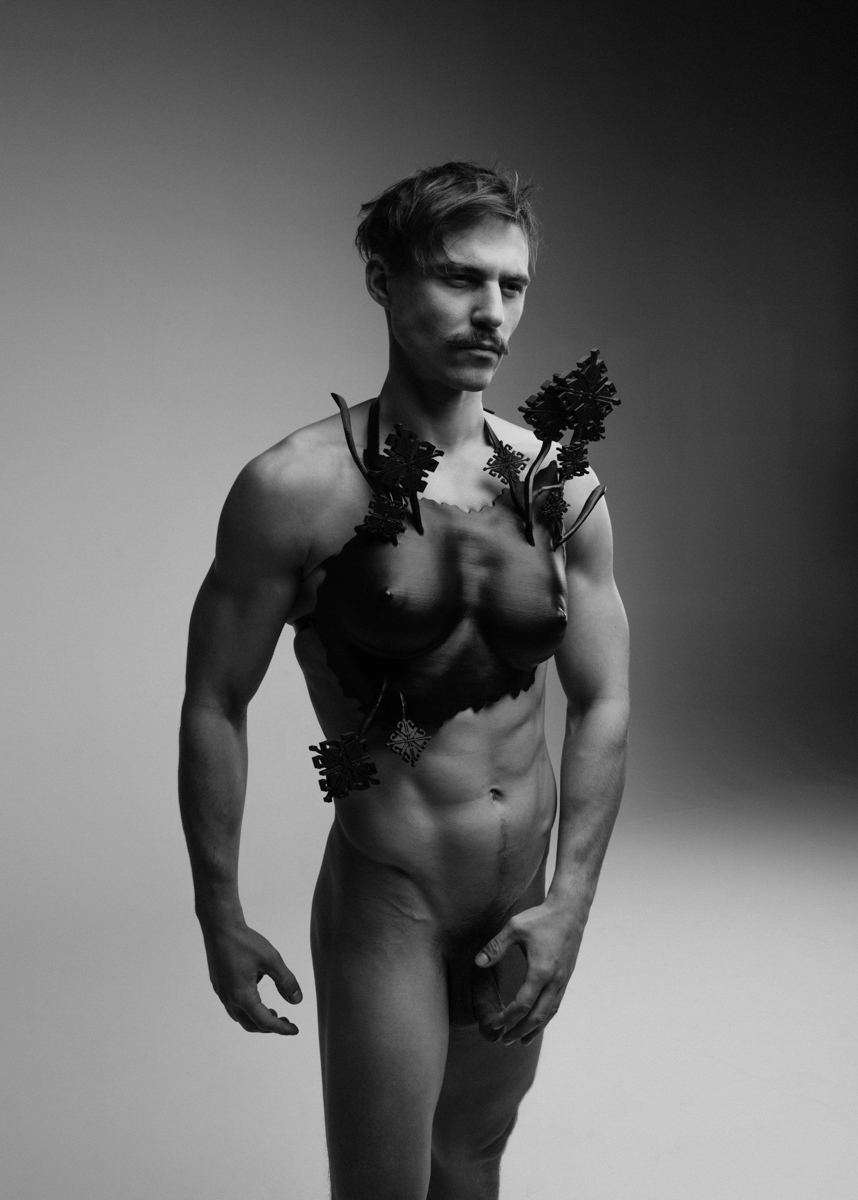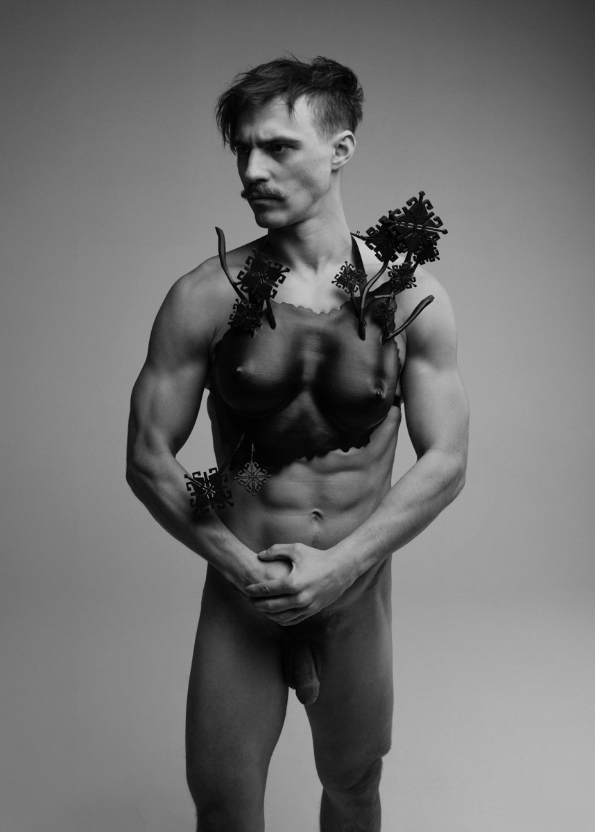Powerful elements of Ukrainian symbols exist in our DNA, they live and grow out of our skin. Corsets in the form of a woman’s breast were scanned from the designer’s figure, printed on a 3D printer and decorated with additional elements – a peculiar response to the prehistoric times of matriarchy and the cult of the ancient Goddess. When the wild tribes returned “to the smoke” – “to the home”, to the family fireplace, being guarded by the woman Beregynya – the Goddess, who was eventually transformed into a God. Now sadly, families are divided, but they have left their soul particles in each other.