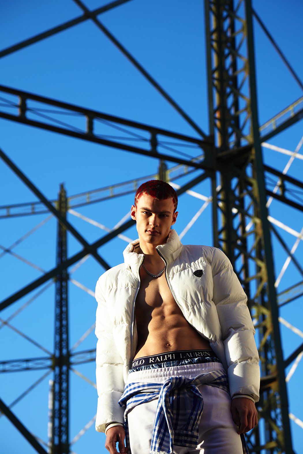 Jacket by Schott NYC, Necklace by Frame Chain, Underwear by Polo Ralph Lauren, Trousers by Kappa X K-Way & Shirt by Scotch & Soda.