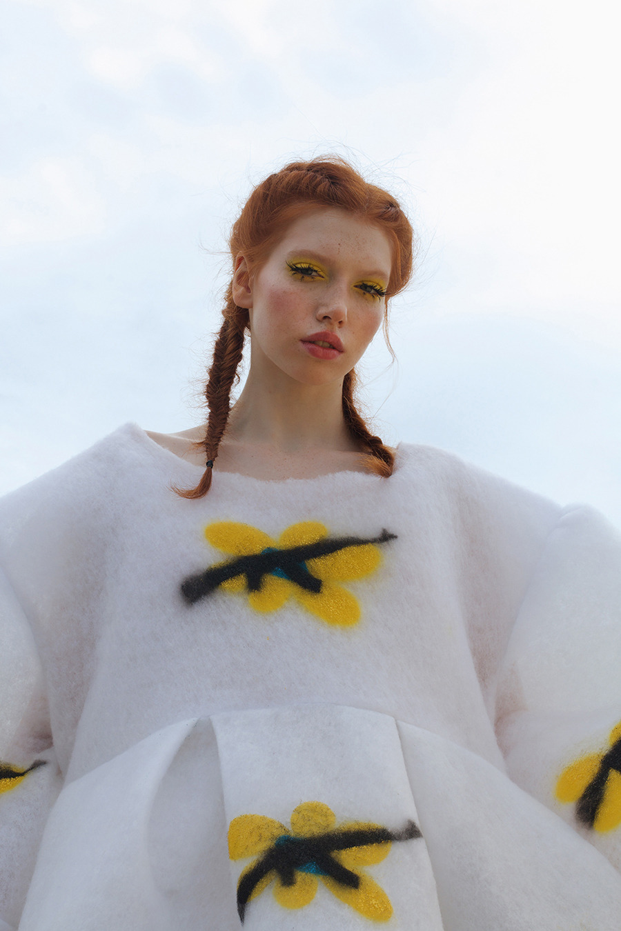 «A scaled white children’s dress is a symbol of purity for me. The floral print is a symbol of joy and life. On the top of the flowers, I place guns-tools for killing children. The form characterizes the lightness and purity of children’s consciousness. The contrasting print speaks of a tragedy that could not be avoided.» – Alina Coma