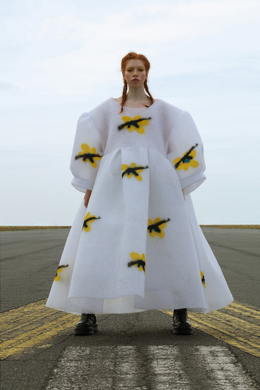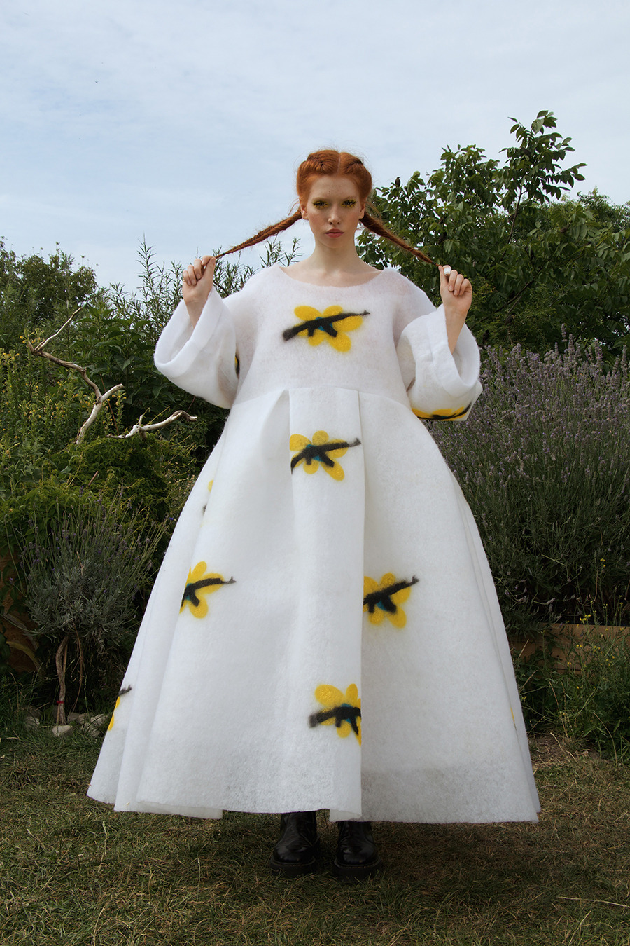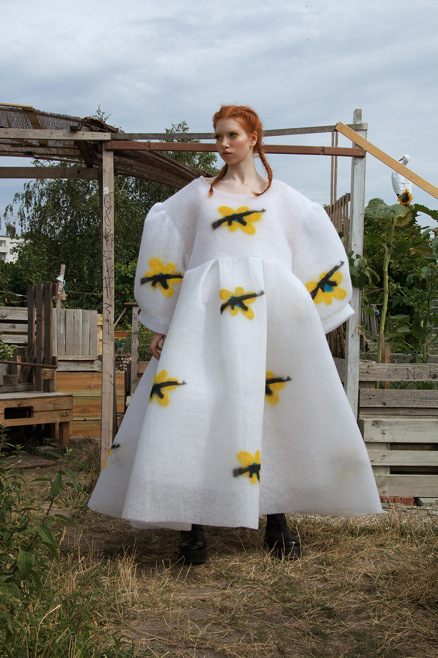 «A scaled white children’s dress is a symbol of purity for me. The floral print is a symbol of joy and life. On the top of the flowers, I place guns-tools for killing children. The form characterizes the lightness and purity of children’s consciousness. The contrasting print speaks of a tragedy that could not be avoided.» – Alina Coma