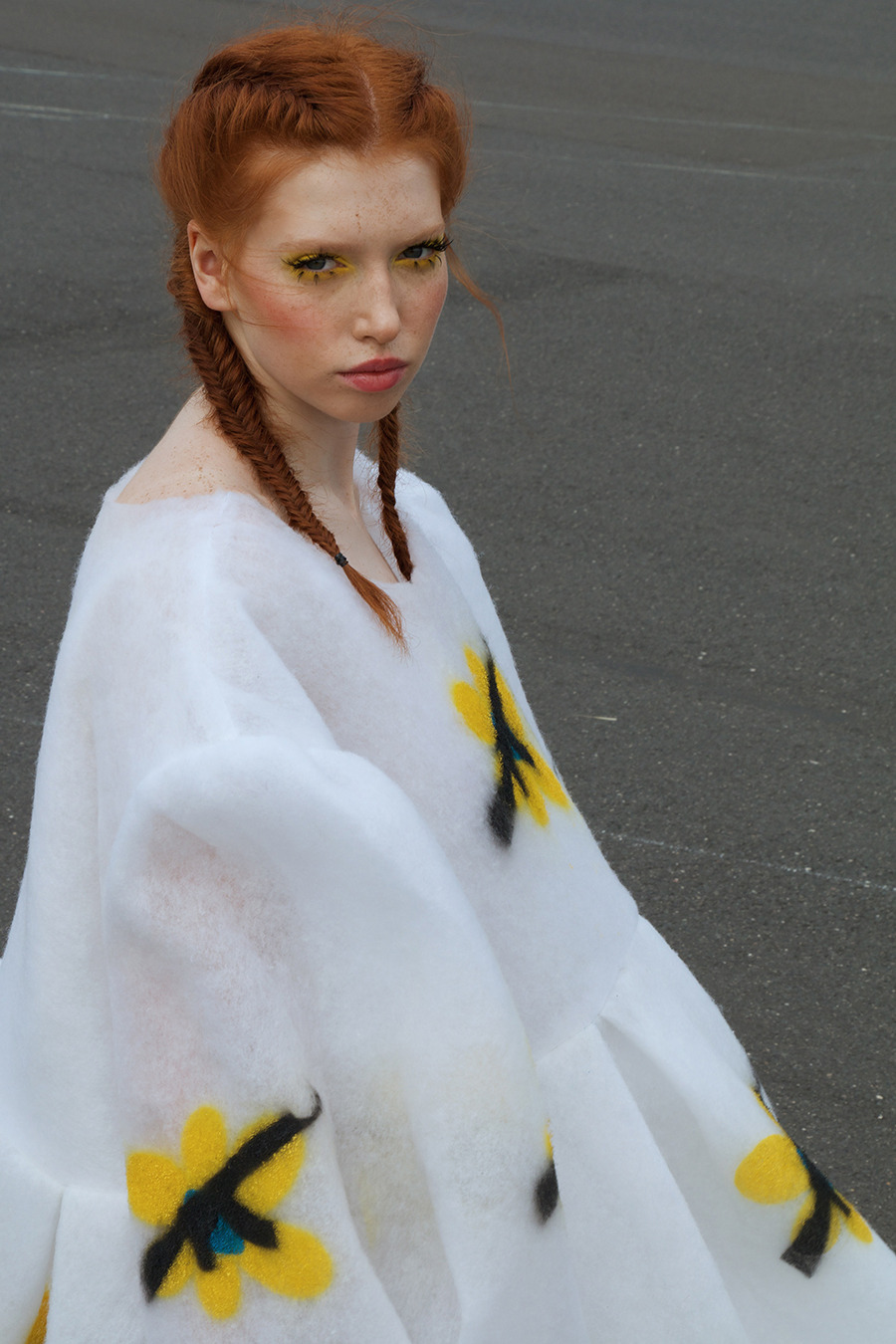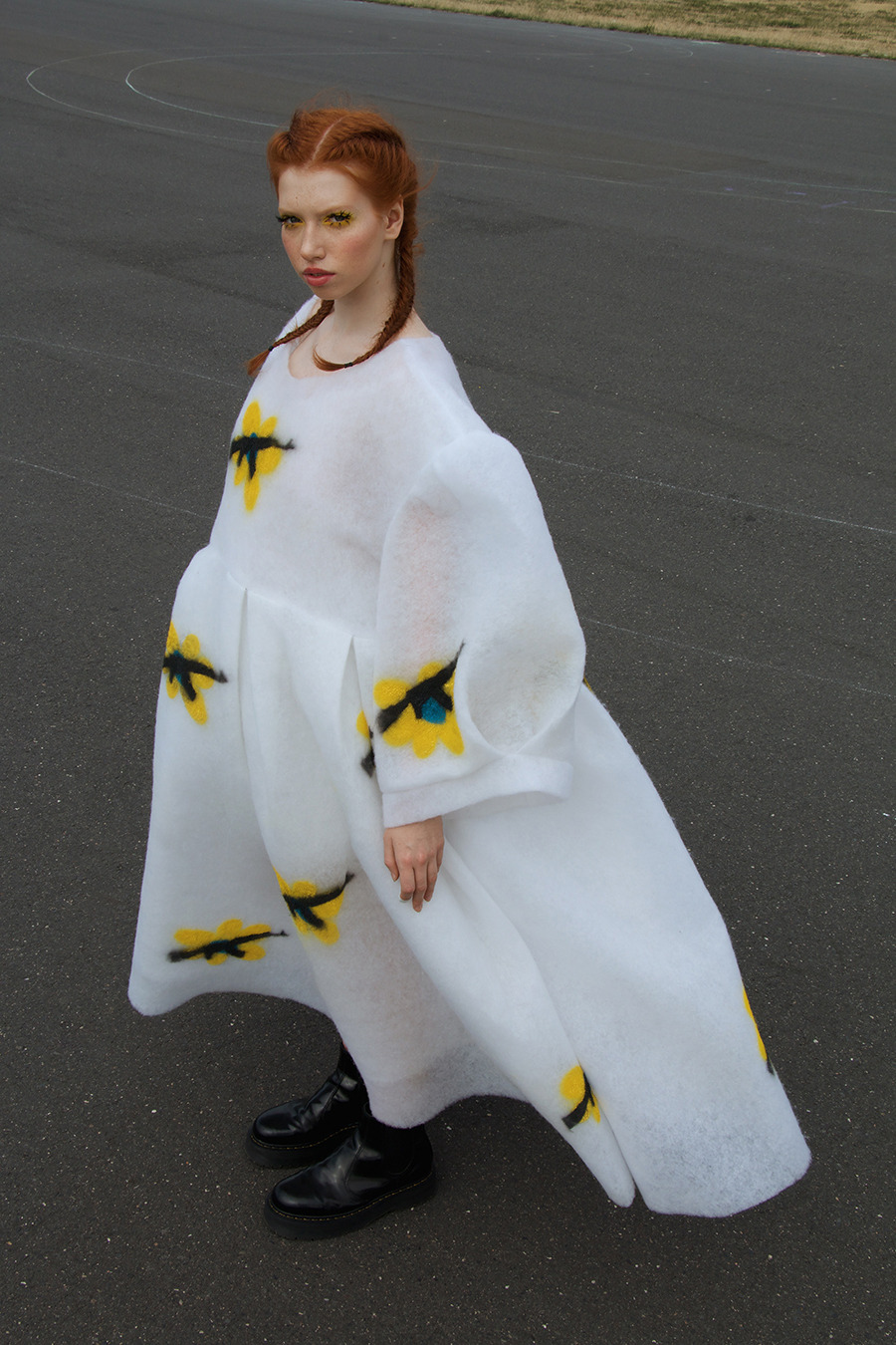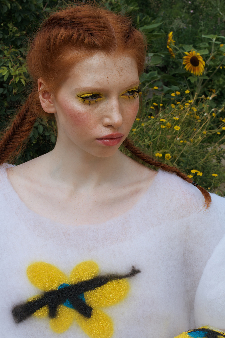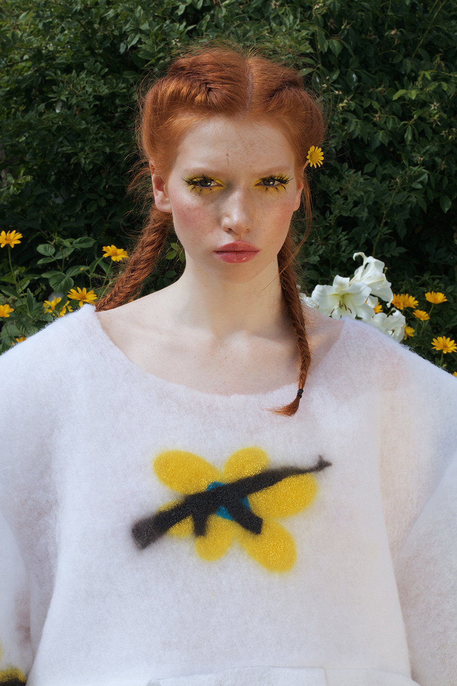 «A scaled white children’s dress is a symbol of purity for me. The floral print is a symbol of joy and life. On the top of the flowers, I place guns-tools for killing children. The form characterizes the lightness and purity of children’s consciousness. The contrasting print speaks of a tragedy that could not be avoided.» – Alina Coma