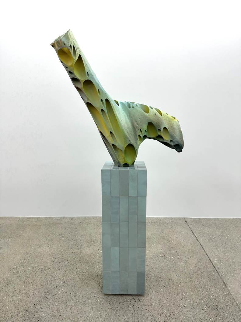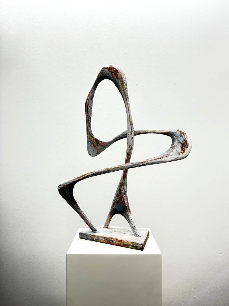Conversely, Flad’s sculptural creations infuse the gallery space with an aura of kinetic energy. Utilising materials like wood, paper pulp, and composites, he forges biomorphic forms that appear caught at the brink of evolution, a harmonious blend of organic elements that embody both bone and branch, as well as breath itself.